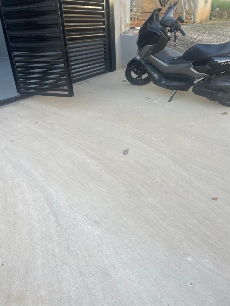 FACHADA -: Calçada de concreto desempenado em ordem, muro em granfino com pintura na cor cinza nova e em ordem, cerca elétrica de 06 fios em ordem, rufus em ordem com pintura na cor preto, nova e em ordem, 01 tampa de proteção padrão Sanasa com pintura na cor preto nova em ordem, 01 hidrômetro padrão Sanasa com lacre em ordem.