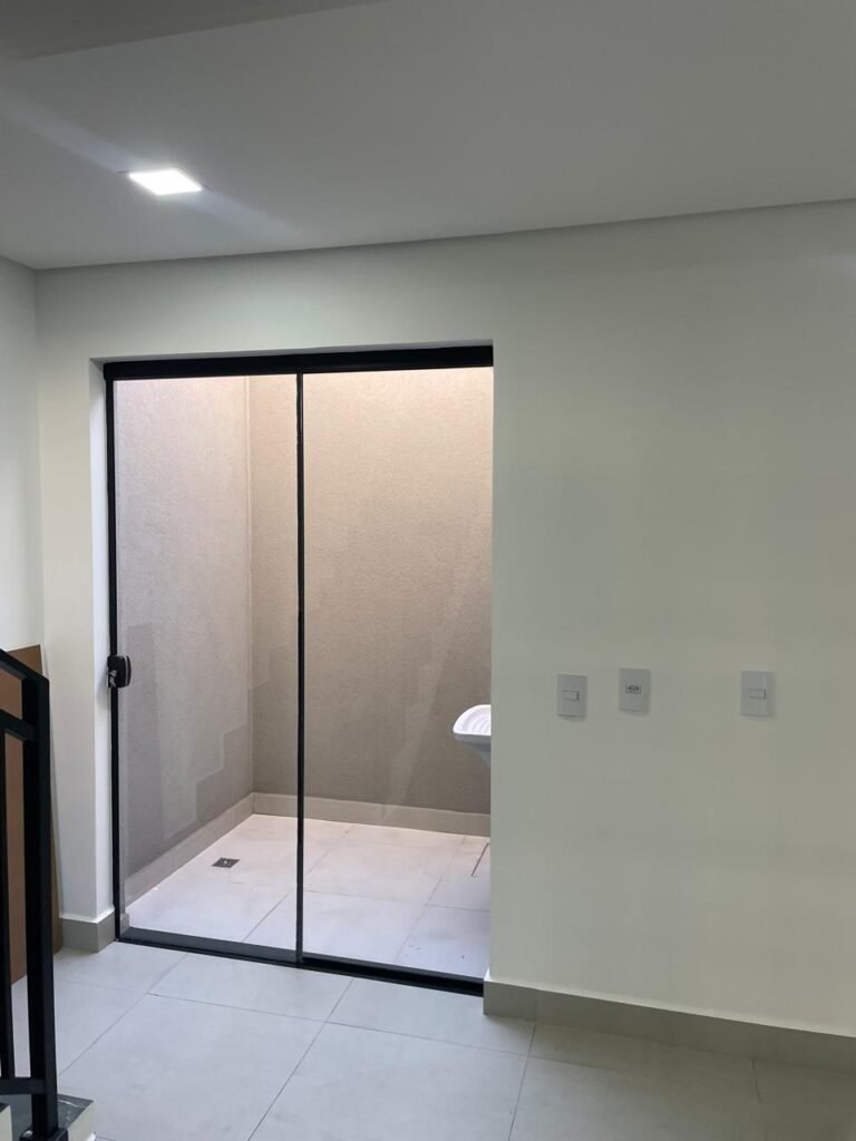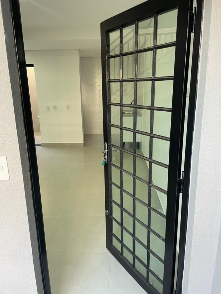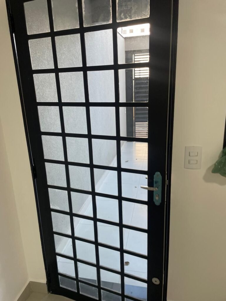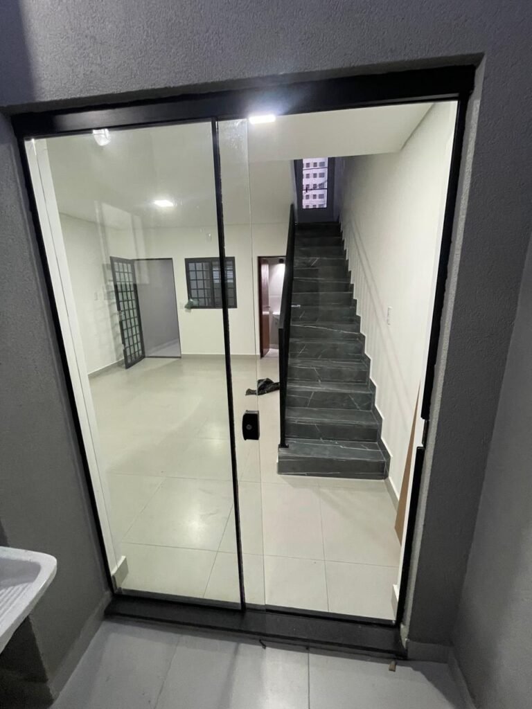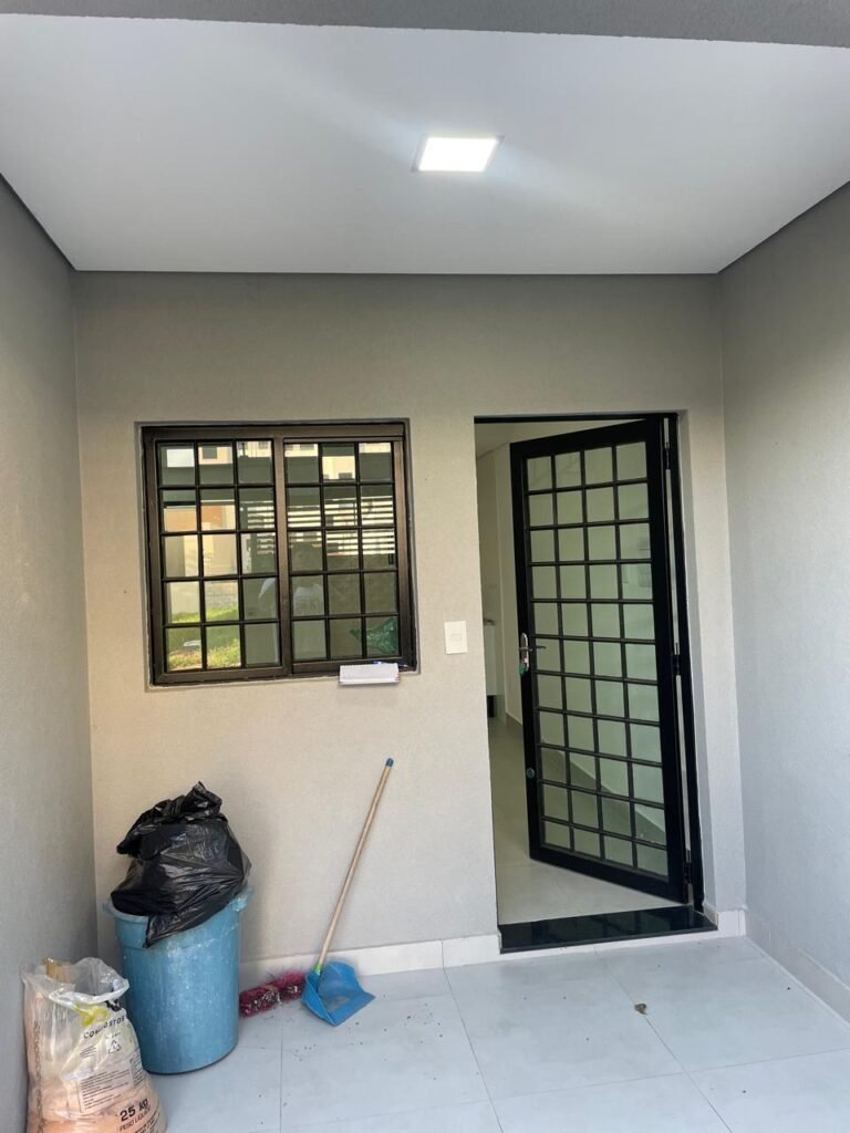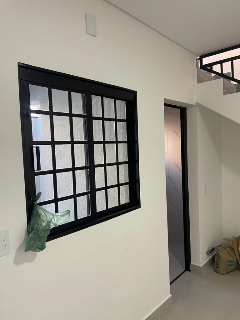 INTERIOR DA CASA -: 01 soleira de mármore na cor preto em ordem, 01 porta social com acabamento de ferro com pintura na cor preto nova em ordem, com 44 vidros lisos blindex em ordem, com 01 maçaneta em inox em ordem, 01 fechadura yale marca Stam em ordem e com chaves, com 01 fechadura tetra em ordem, pisos e rodapés revestidos de porcelanato na cor cinza em ordem, paredes e teto com gola de gesso, com pintura na cor branco neve nova e em ordem, 02 luminárias plafon embutidas e com leds em ordem, 09 espelhos marca Margirus em ordem sendo eles, 01 espelho cego, 02 espelhos com 01 interruptor cada, 02 espelhos com 02 interruptores cada e 04 tomadas ambos em ordem, 01 janela deslizante com esquadrias com pintura nova na cor preto em ordem, 02 folhas com 15 vidros lisos blindex em ordem cada, 01 puxador e 02 travas para cadeado, 01 tampa de proteção de disjuntores em ordem, disjuntores sendo eles, 01 marca Steck 63A 400v SDR 4P, 01 marca Weg MDW 400v C25, 03 marca Weg MDW C20 sendo 01 400v e 02 230v/400v, 01 marca Weg MDW C16 230v/400v.