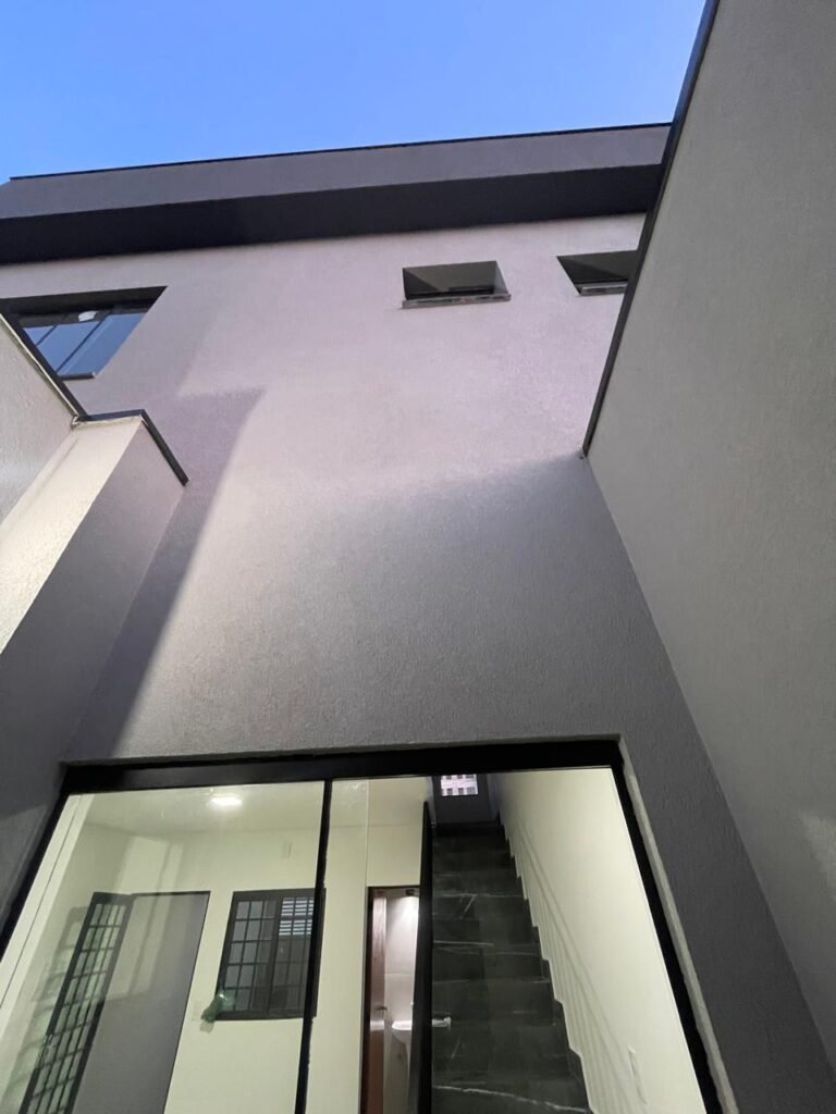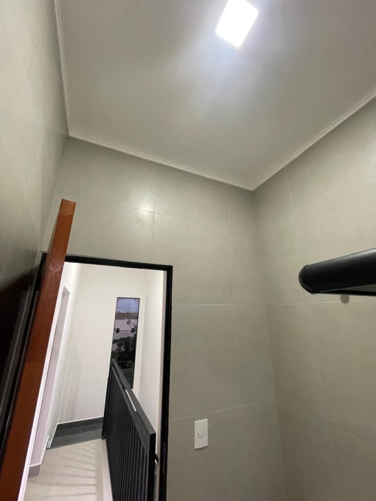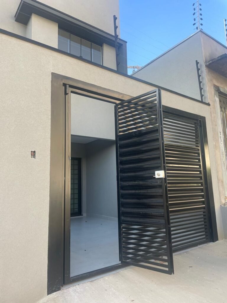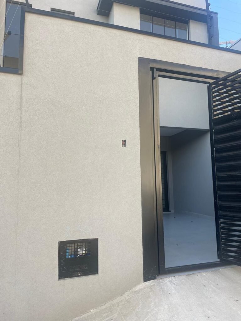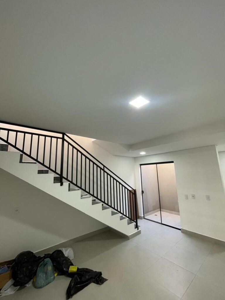 INTERIOR DA CASA -: 01 soleira de mármore na cor preto em ordem, 01 porta social com acabamento de ferro com pintura na cor preto nova em ordem, com 44 vidros lisos blindex em ordem, com 01 maçaneta em inox em ordem, 01 fechadura yale marca Stam em ordem e com chaves, com 01 fechadura tetra em ordem, pisos e rodapés revestidos de porcelanato na cor cinza em ordem, paredes e teto com gola de gesso, com pintura na cor branco neve nova e em ordem, 02 luminárias plafon embutidas e com leds em ordem, 09 espelhos marca Margirus em ordem sendo eles, 01 espelho cego, 02 espelhos com 01 interruptor cada, 02 espelhos com 02 interruptores cada e 04 tomadas ambos em ordem, 01 janela deslizante com esquadrias com pintura nova na cor preto em ordem, 02 folhas com 15 vidros lisos blindex em ordem cada, 01 puxador e 02 travas para cadeado, 01 tampa de proteção de disjuntores em ordem, disjuntores sendo eles, 01 marca Steck 63A 400v SDR 4P, 01 marca Weg MDW 400v C25, 03 marca Weg MDW C20 sendo 01 400v e 02 230v/400v, 01 marca Weg MDW C16 230v/400v.