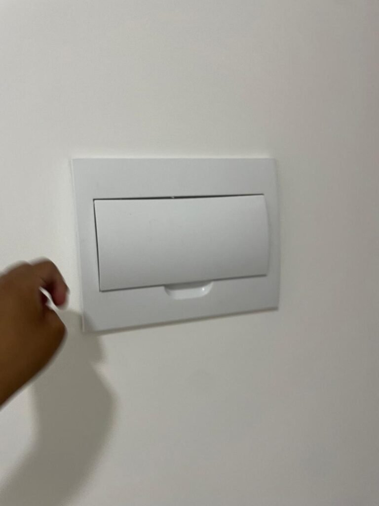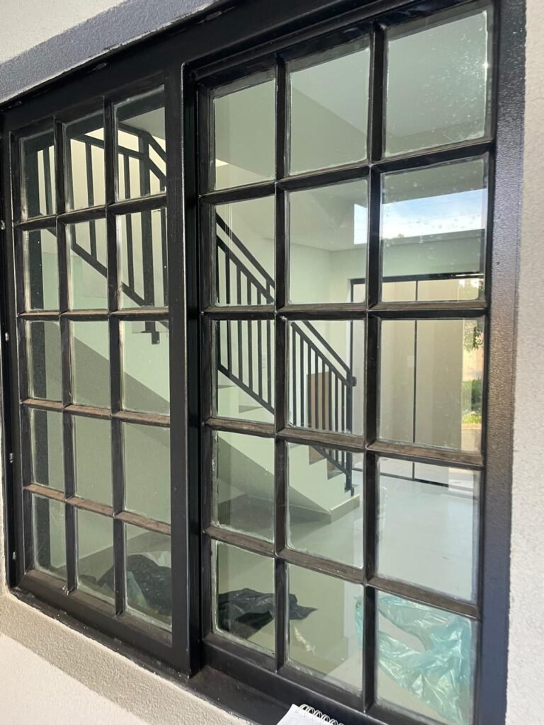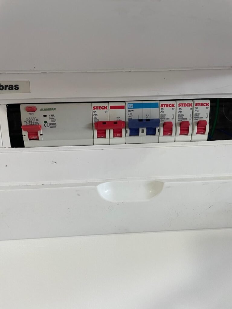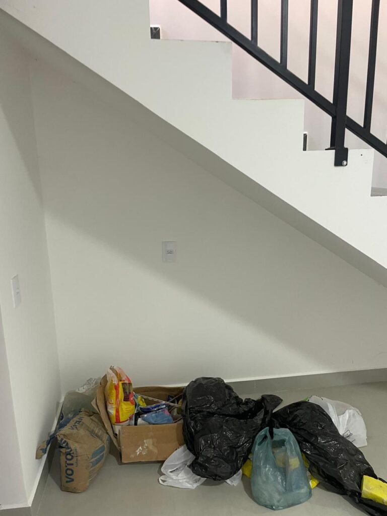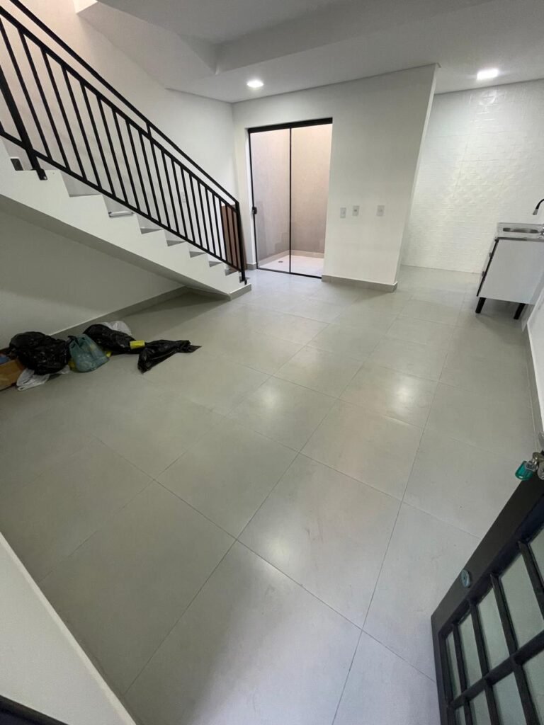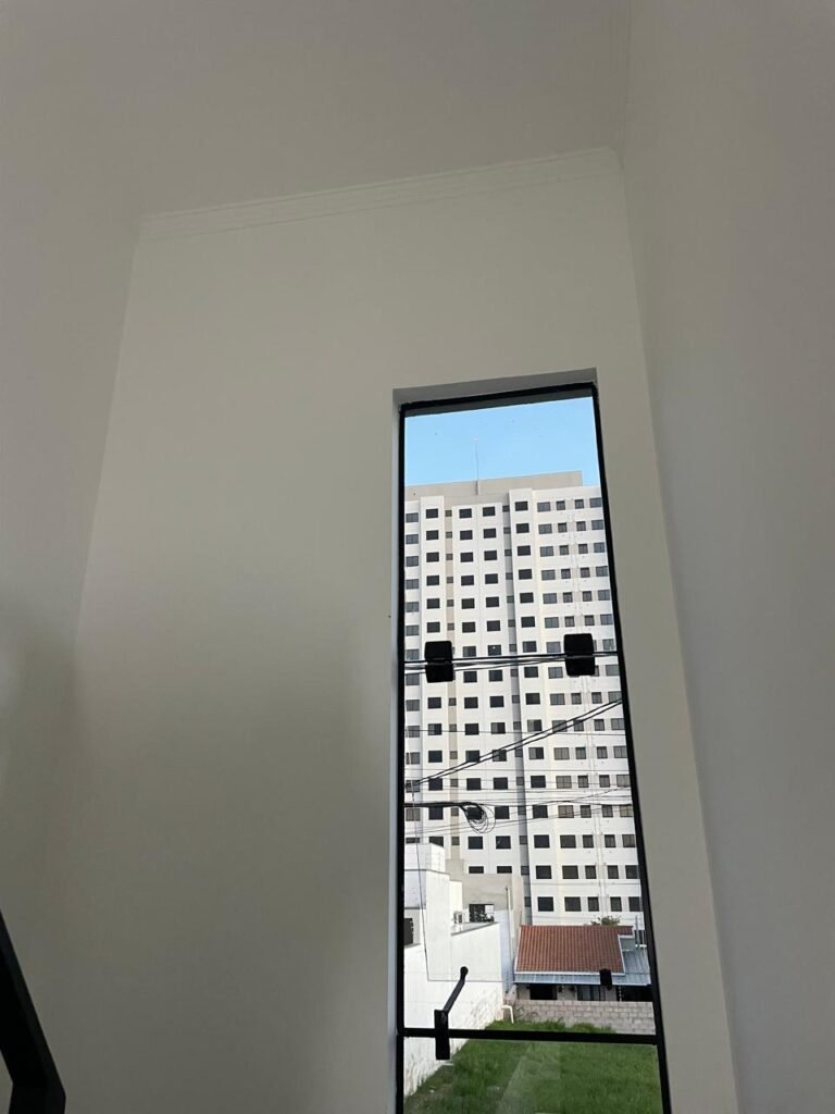 INTERIOR DA CASA -: 01 soleira de mármore na cor preto em ordem, 01 porta social com acabamento de ferro com pintura na cor preto nova em ordem, com 44 vidros lisos blindex em ordem, com 01 maçaneta em inox em ordem, 01 fechadura yale marca Stam em ordem e com chaves, com 01 fechadura tetra em ordem, pisos e rodapés revestidos de porcelanato na cor cinza em ordem, paredes e teto com gola de gesso, com pintura na cor branco neve nova e em ordem, 02 luminárias plafon embutidas e com leds em ordem, 09 espelhos marca Margirus em ordem sendo eles, 01 espelho cego, 02 espelhos com 01 interruptor cada, 02 espelhos com 02 interruptores cada e 04 tomadas ambos em ordem, 01 janela deslizante com esquadrias com pintura nova na cor preto em ordem, 02 folhas com 15 vidros lisos blindex em ordem cada, 01 puxador e 02 travas para cadeado, 01 tampa de proteção de disjuntores em ordem, disjuntores sendo eles, 01 marca Steck 63A 400v SDR 4P, 01 marca Weg MDW 400v C25, 03 marca Weg MDW C20 sendo 01 400v e 02 230v/400v, 01 marca Weg MDW C16 230v/400v.