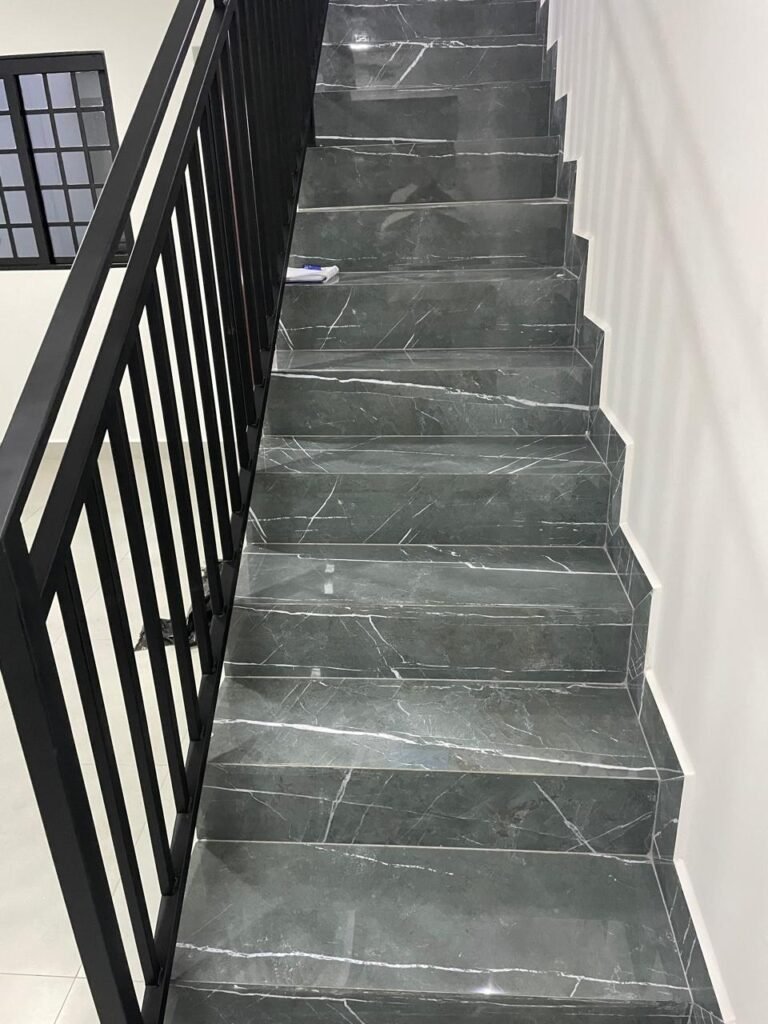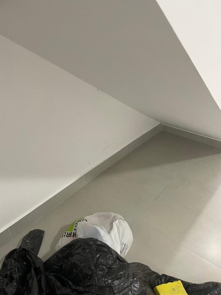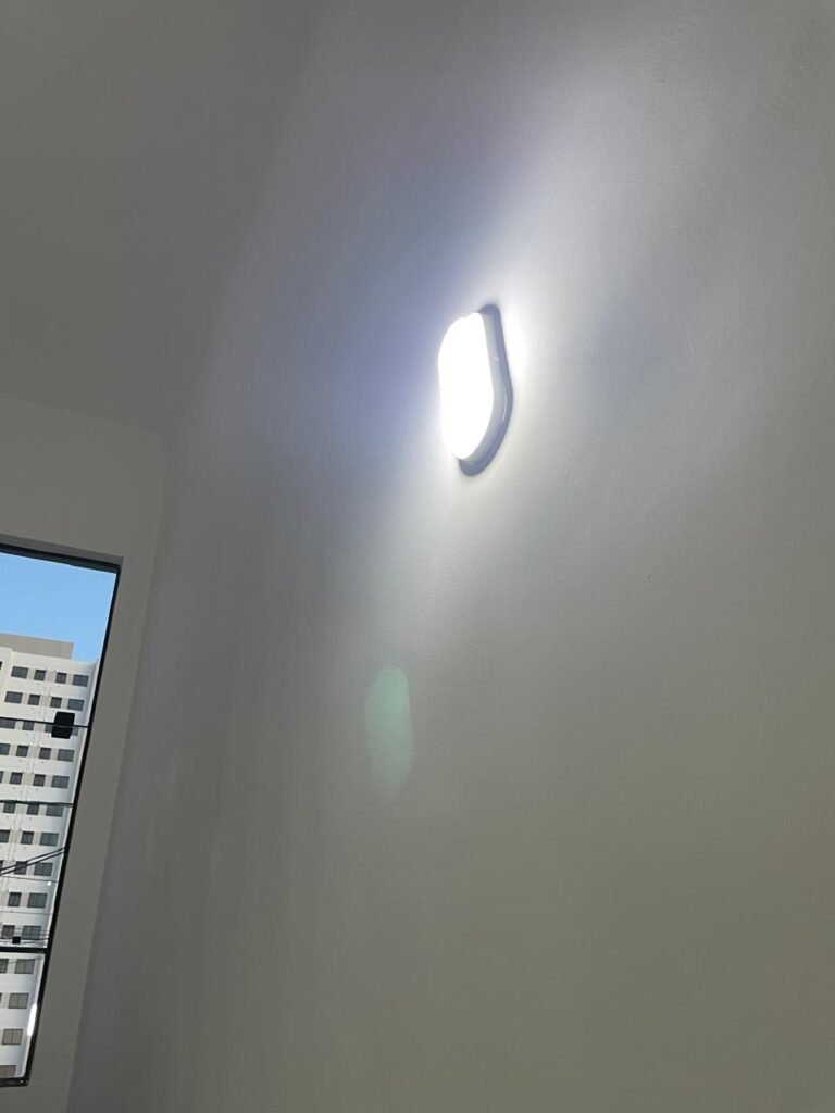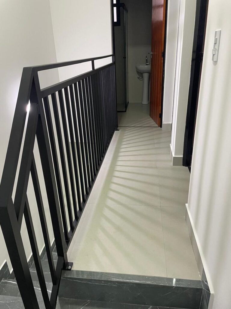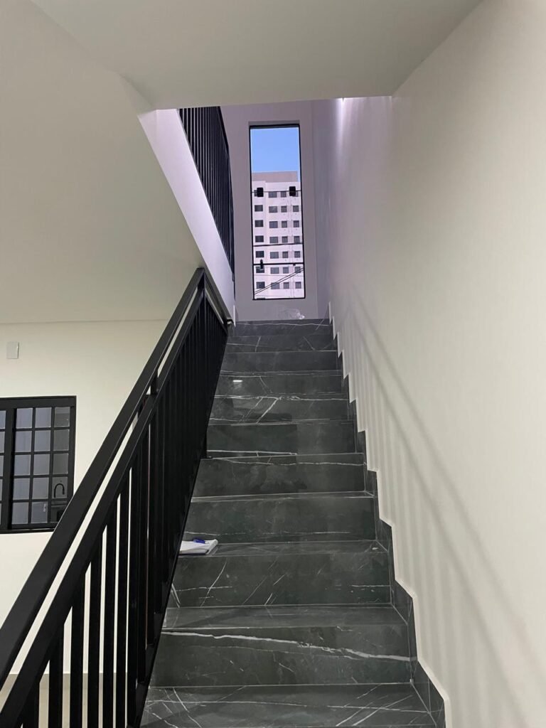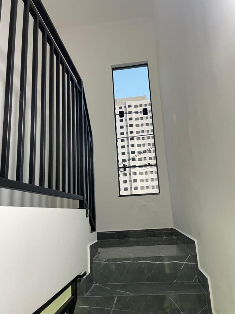HALL QUARTOS -: 01 escada guarda corpo e corrimão com pintura na cor preto nova em ordem, com rodapés e piso revestidos de Porcelanato rajado em cinza, 01 luminária tartaruga com Led em ordem, 01 luminária de sobrepor com led em ordem; 01 janela basculante em ordem, com 03 folhas de vidros lisos blindex em ordem, 01 soleira de mármore cor preto em ordem, 01 espelho com 02 interruptores marca Margirus em ordem, paredes e teto com gola de gesso, com pintura nova na cor branco neve em ordem, pisos e rodapés revestidos de porcelanato na cor cinza em ordem.