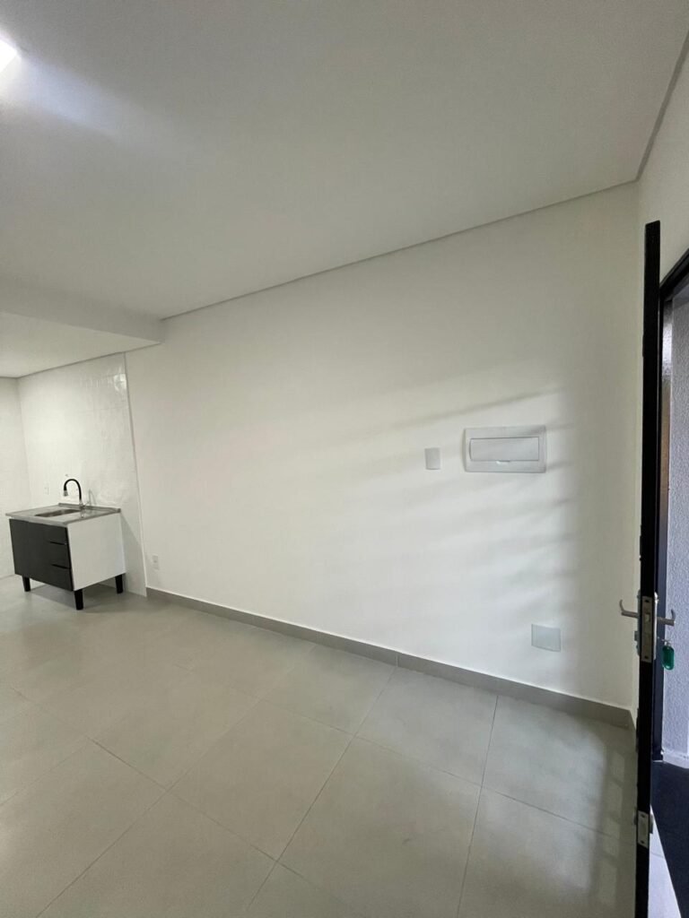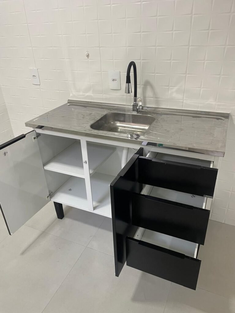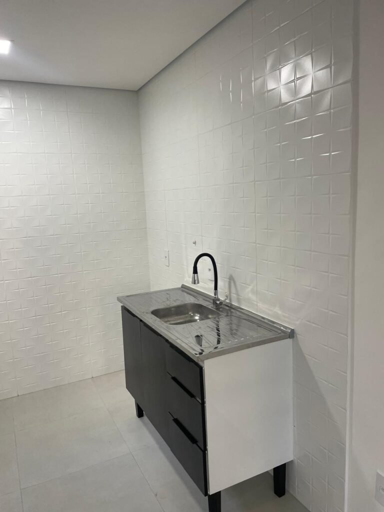 COZINHA -: Piso revestido de porcelanato na cor cinza e em ordem, paredes revestidas de azulejo na cor branco em ordem, teto com gola de gesso e pintura nova na cor branco neve em ordem, 01 janela deslizante com esquadrias na cor preto em ordem, com 02 folhas de vidros lisos blindex em ordem, 01 fechadura em ordem, 01 soleira de mármore na cor preto em ordem, 05 espelhos marca Margirus sendo eles, 05 tomadas em ordem, 01 canopla de registro com válvula, 01 ralo com tampa em ordem, 01 armário marca Cozimax novo e em ordem, com 02 portas e 03 gavetas na cor preto e laterais brancas, 01 pia marca Fabrinox com cuba de inox em ordem, 01 luminária plafon embutida com led em ordem.