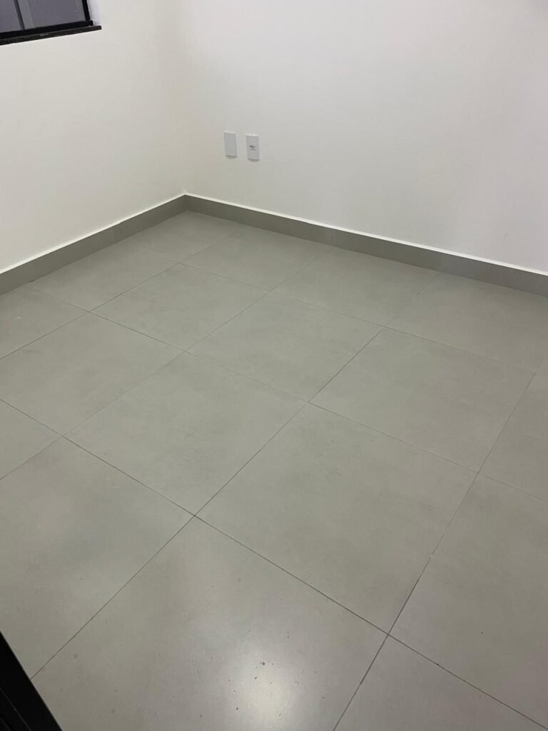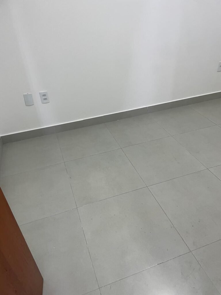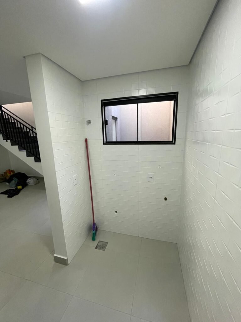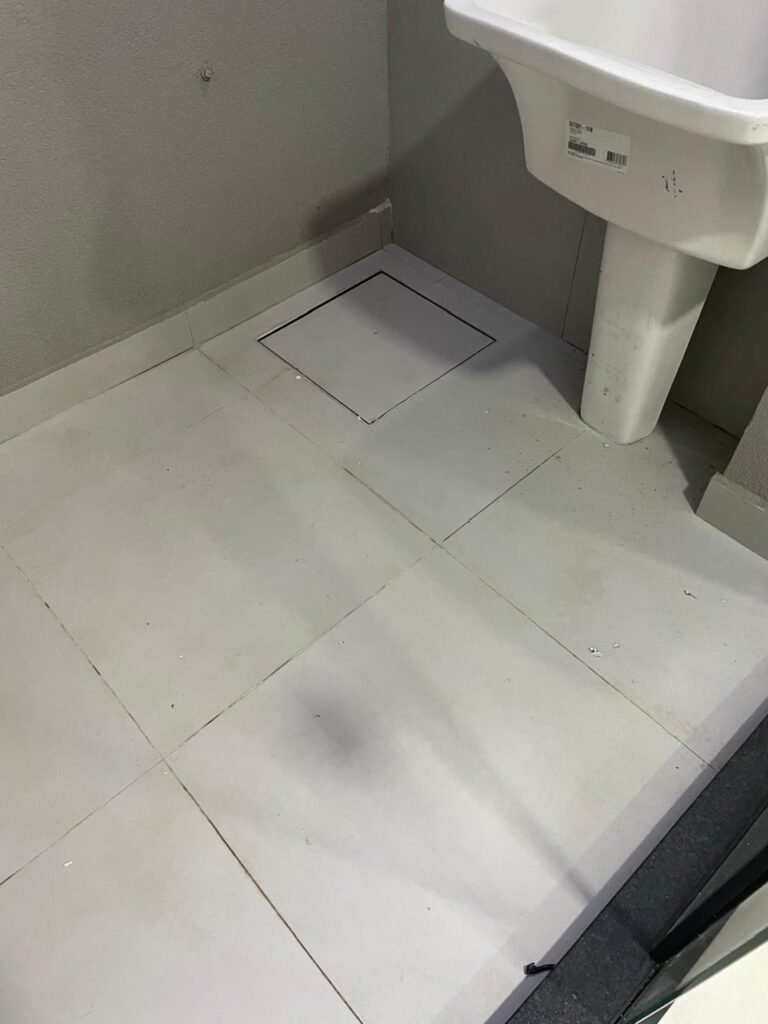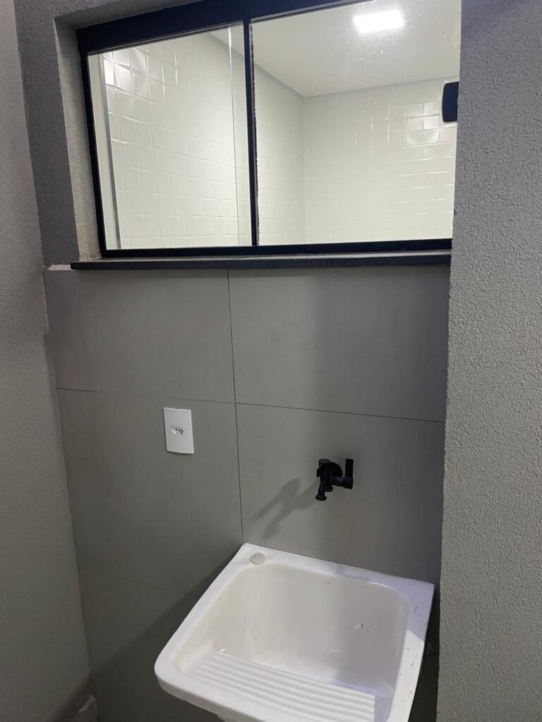 LAVANDERIA -: 01 porta deslizante com esquadrias na cor preto em ordem, 02 folhas de vidros lisos blindex em ordem, 01 fechadura marca Piller em ordem, 01 soleira de mármore cor preto em ordem, pisos e rodapés de porcelanato na cor cinza sendo que 01 está trincada e restante em ordem, 01 parede 1/2 revestida de porcelanato na cor cinza em ordem, restante das paredes em granfino, com pintura nova na cor cinza em ordem, 01 luminária tartaruga danificada, rufus com pintura na cor preto em ordem, 01 espelho com tomada marca Margirus em ordem, 02 tampas de inspeção sendo elas, 01 tampa de ferro e 01 tampa em piso de porcelanato em ordem, 01 ralo com tampa em inox em ordem, 01 tanque com coluna de cerâmica branco Fiori em ordem, 01 torneira com 02 bicas pretas novas em ordem.