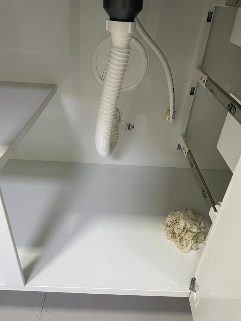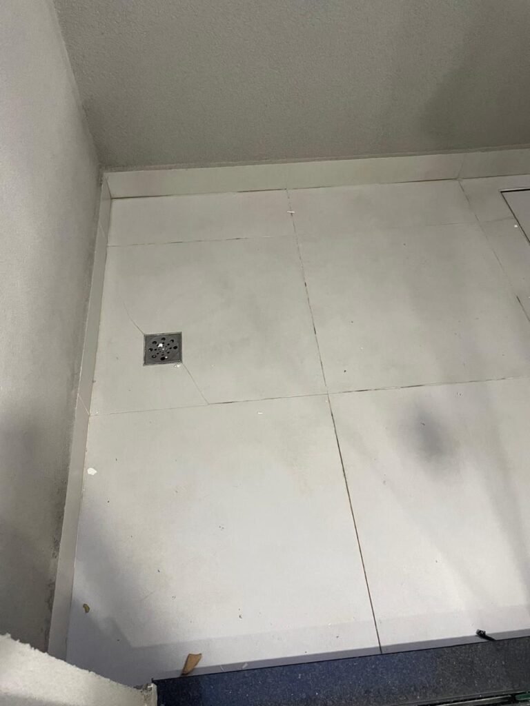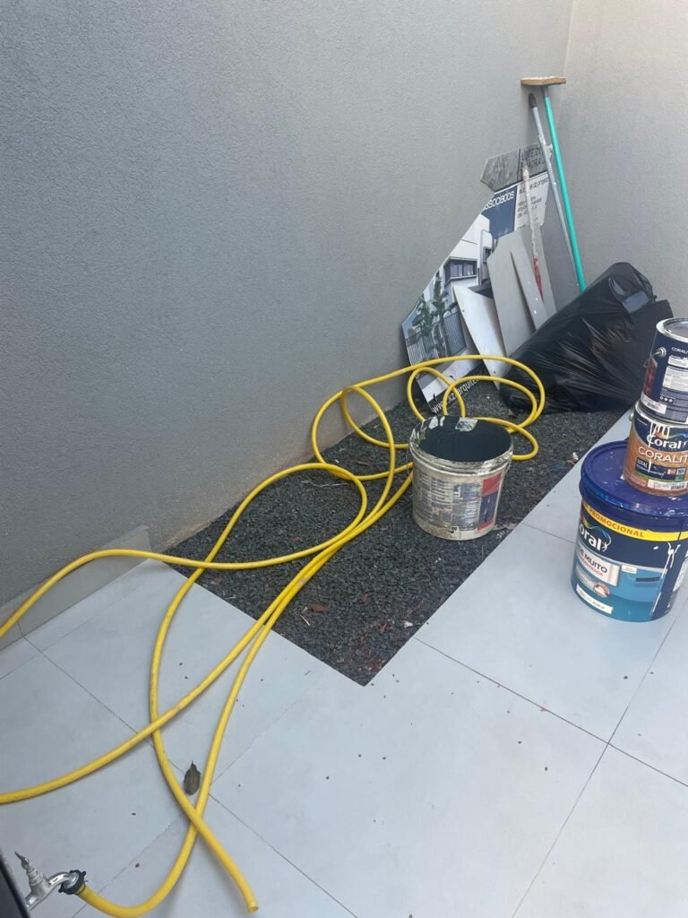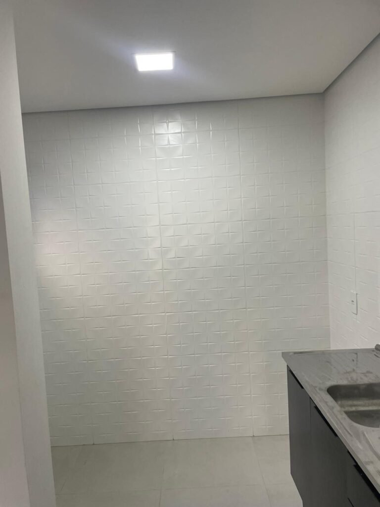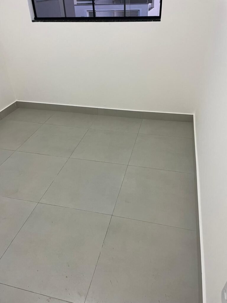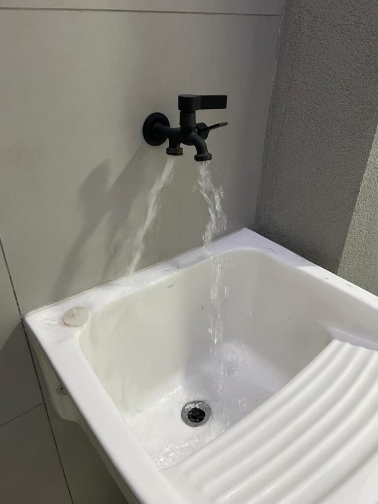 LAVANDERIA -: 01 porta deslizante com esquadrias na cor preto em ordem, 02 folhas de vidros lisos blindex em ordem, 01 fechadura marca Piller em ordem, 01 soleira de mármore cor preto em ordem, pisos e rodapés de porcelanato na cor cinza sendo que 01 está trincada e restante em ordem, 01 parede 1/2 revestida de porcelanato na cor cinza em ordem, restante das paredes em granfino, com pintura nova na cor cinza em ordem, 01 luminária tartaruga danificada, rufus com pintura na cor preto em ordem, 01 espelho com tomada marca Margirus em ordem, 02 tampas de inspeção sendo elas, 01 tampa de ferro e 01 tampa em piso de porcelanato em ordem, 01 ralo com tampa em inox em ordem, 01 tanque com coluna de cerâmica branco Fiori em ordem, 01 torneira com 02 bicas pretas novas em ordem.