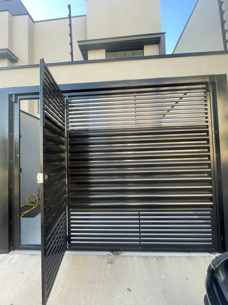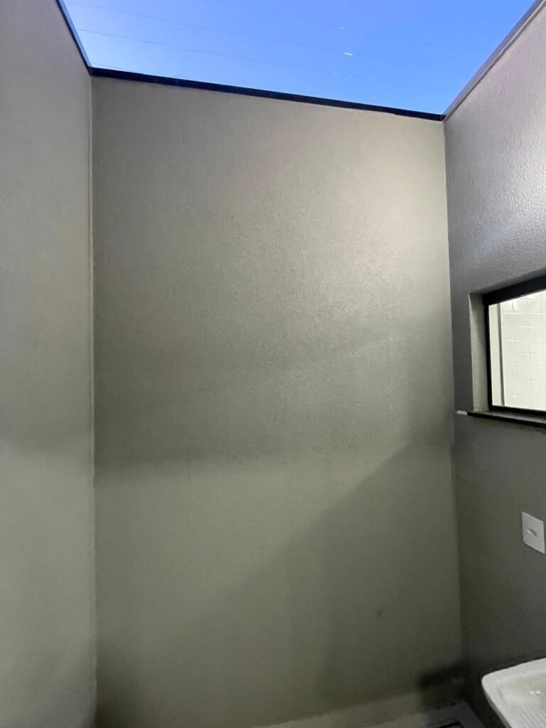 GARAGEM -: 01 portão de ferro basculante novo, com pintura na cor preto nova e em ordem, com 01 porta social em ordem, com 01 fechadura start e chaves em ordem, pisos e rodapés revestidos de porcelanato na cor cinza em ordem, paredes em granfino com pintura na cor cinza nova em ordem, 01 fileira em pedregulhos em ordem, 03 espelhos marca Margirus em ordem e sendo eles, 01 espelho cego, 01 tomada 220w e 01 interruptor ambos em ordem, 01 pré instalação, 01 forro de gesso com pintura na cor branco neve nova e em ordem, 01 luminária plafon embutida e com led em ordem.