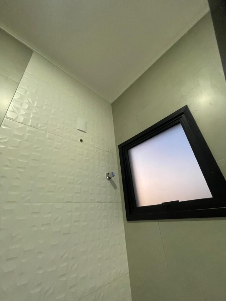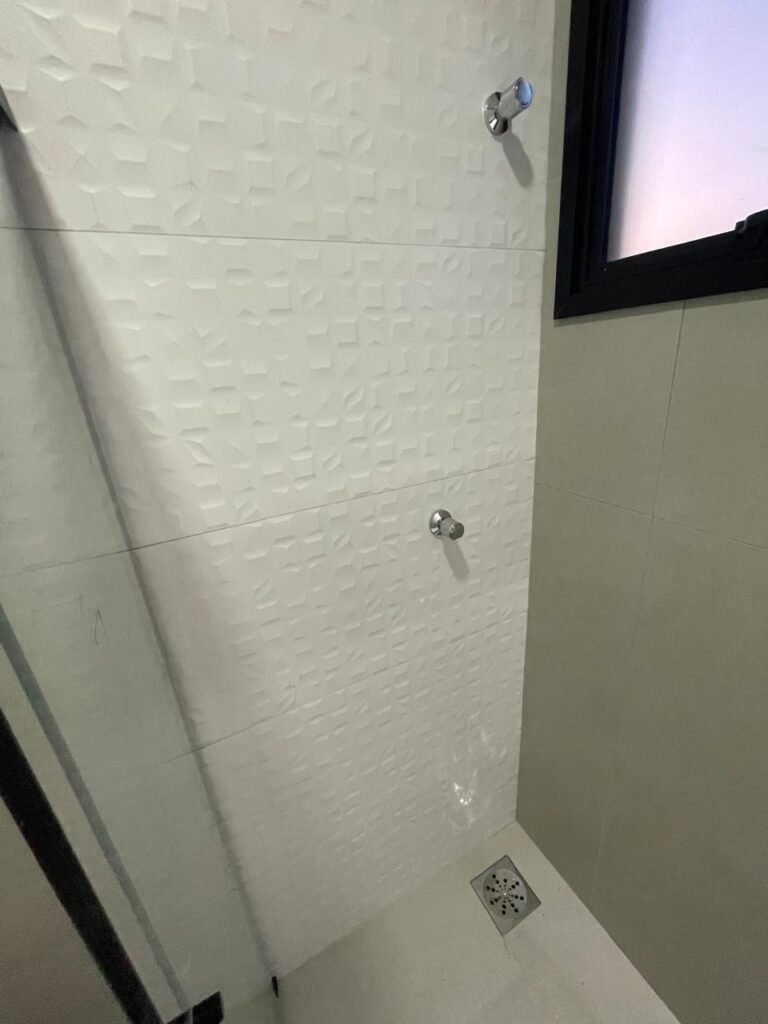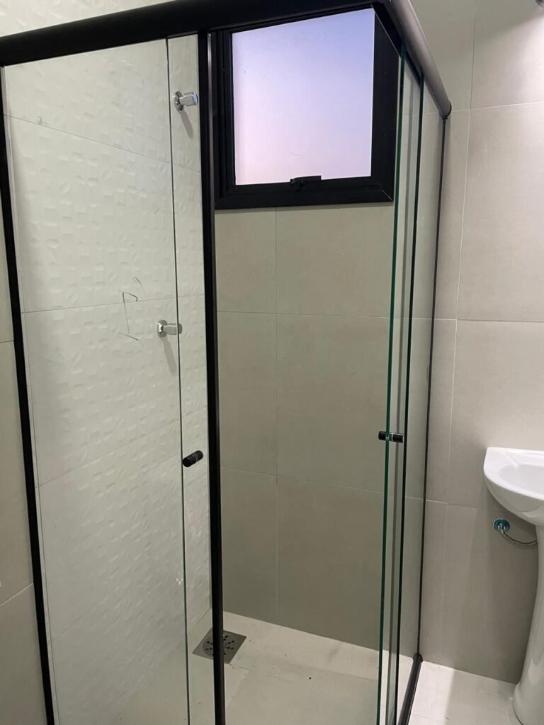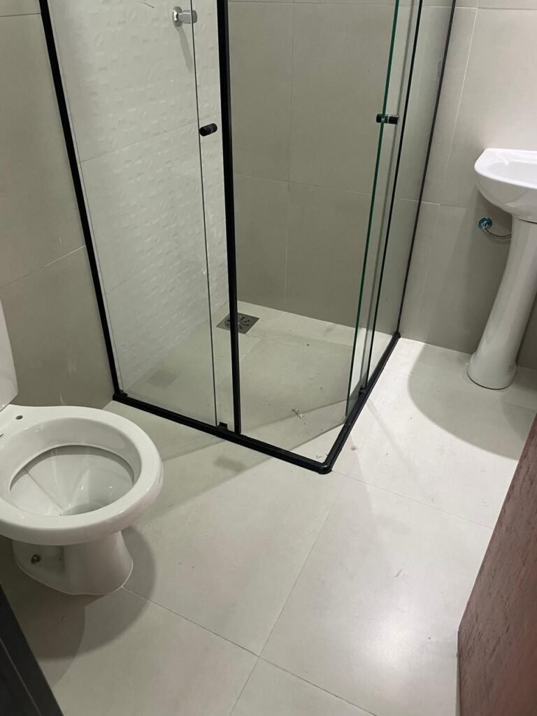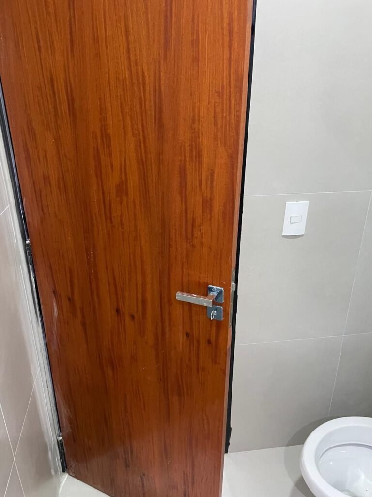 BANHEIRO -: 01 filete de mármore cor preta em ordem, 01 porta de madeira envernizada em ordem, maçanetas quadradas em ordem, 01 fechadura em inox em ordem com chave embutida, batente de com pintura na cor preto em ordem, 01 box com esquadrias na cor preta, com 04 puxadores, com 04 folhas de vidros lisos blindex em ordem, 02 ralos sendo 01 maior com tampa de inox e 01 menor com tampa de inox em ordem, 03 espelhos marca Margirus sendo eles, 01 espelho com 01 interruptor, 01 espelho com 01 interruptor e 01 tomada, e 01 espelho cego de chuveiro ambos em ordem, 02 canoplas de registro em ordem, 01 buraco para instalação de chuveiro, 01 parede revestida de azulejos na cor branco até o teto, 01 vitro basculante com esquadrias na cor preta novas em ordem, com 01 fechadura em ordem, e 01 folha de vidro fosco em ordem.