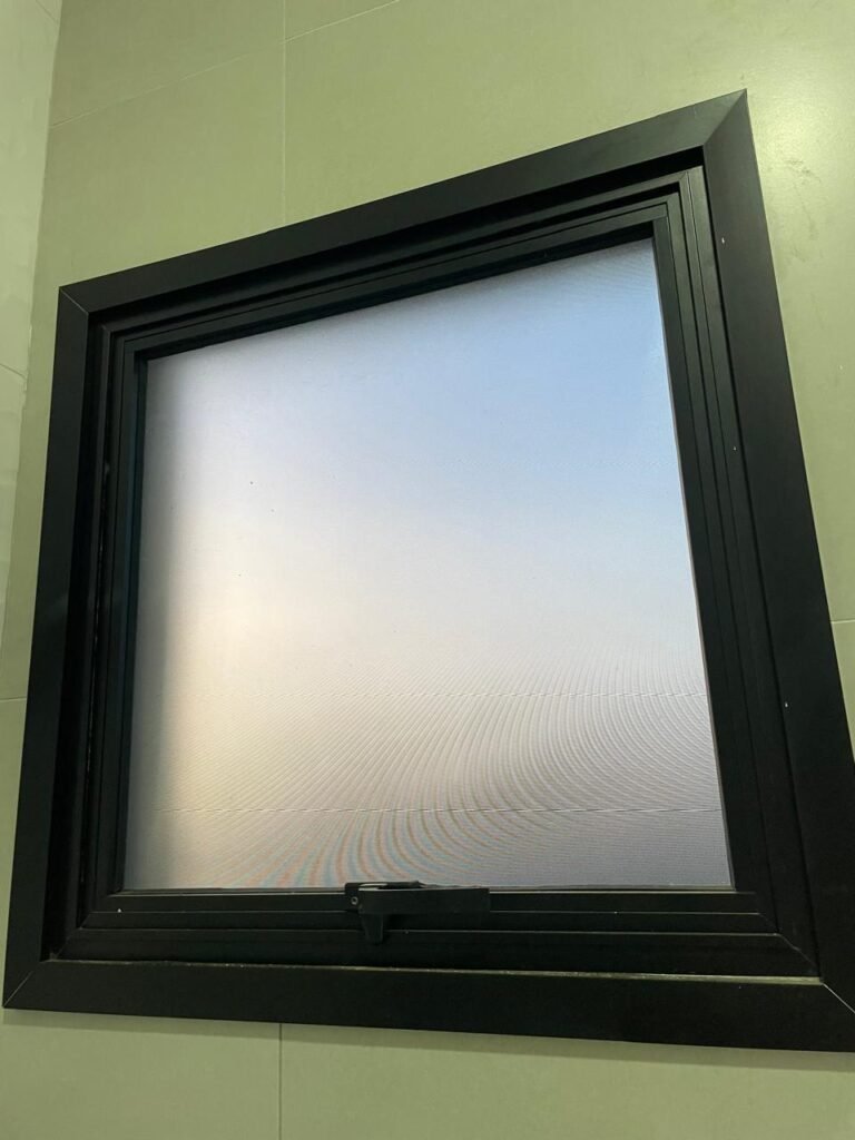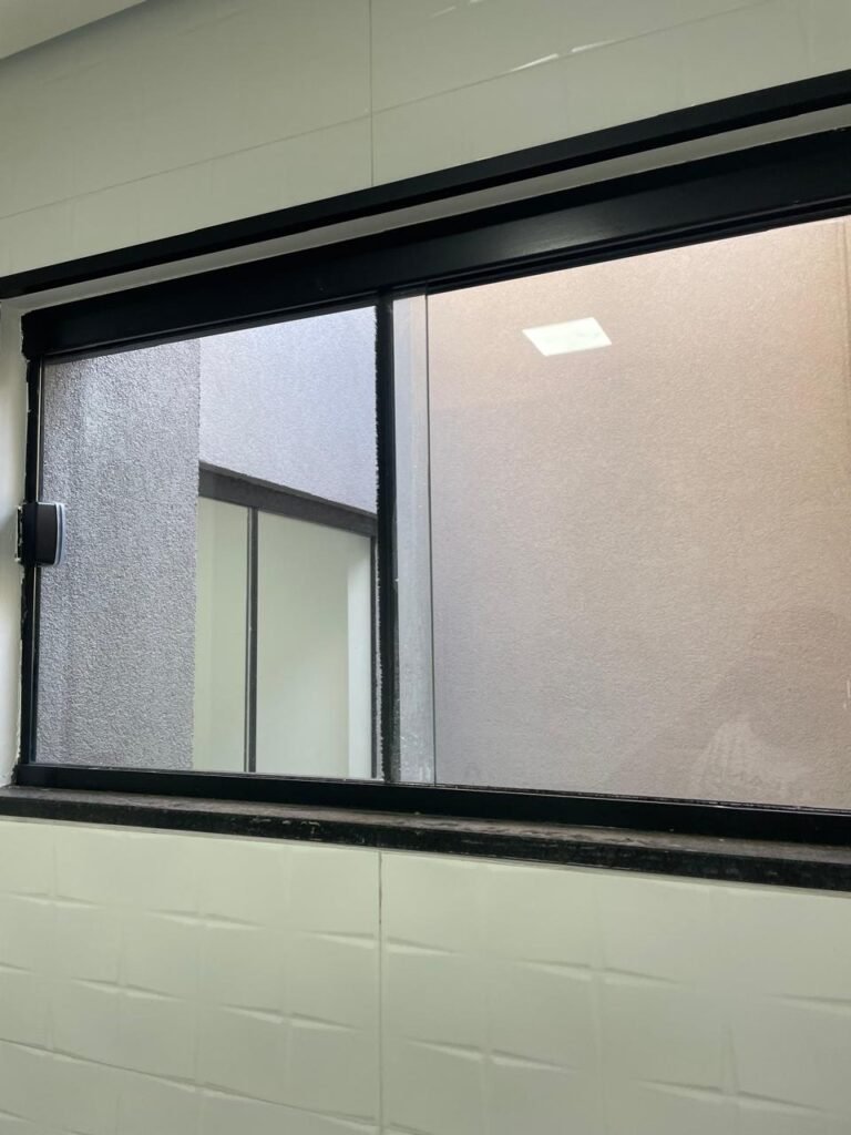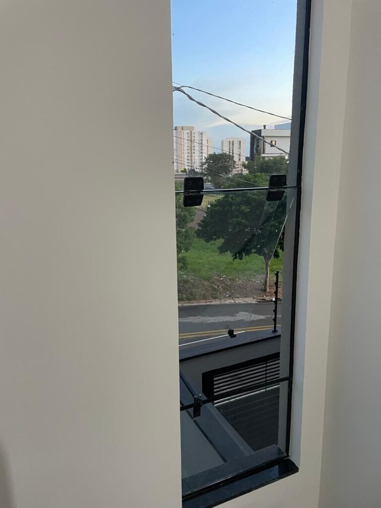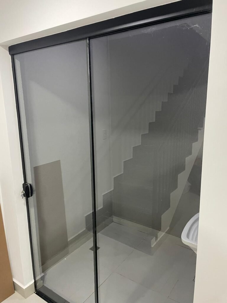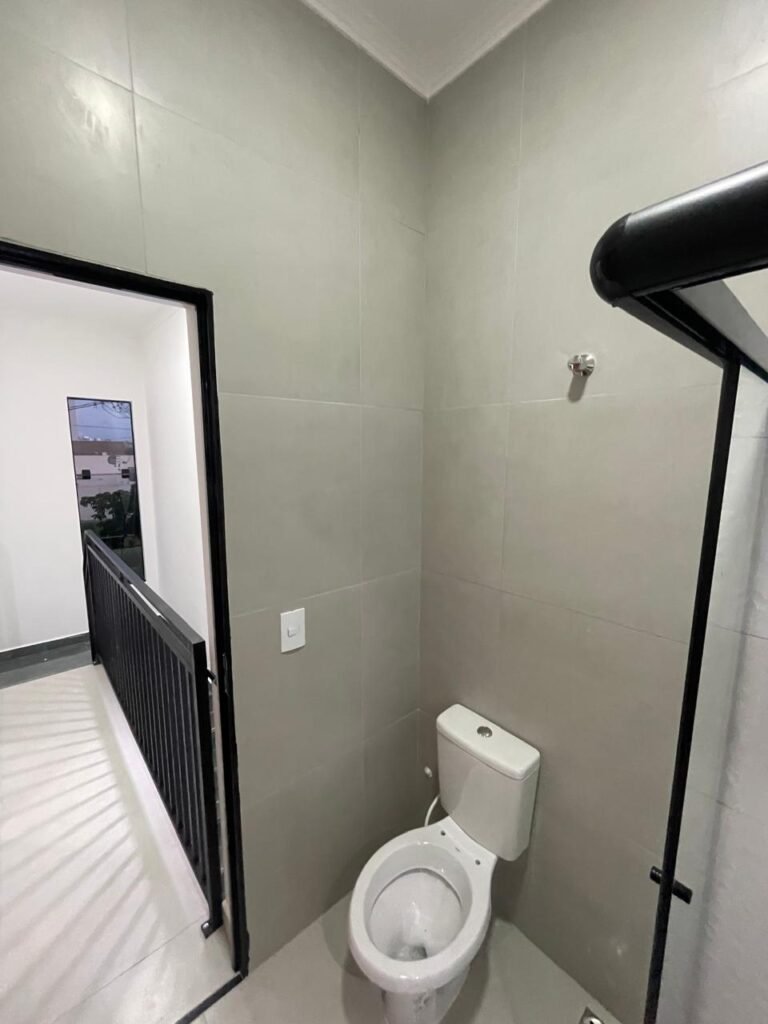 BANHEIRO -: 01 filete de mármore cor preta em ordem, 01 porta de madeira envernizada em ordem, maçanetas quadradas em ordem, 01 fechadura em inox em ordem com chave embutida, batente de com pintura na cor preto em ordem, 01 box com esquadrias na cor preta, com 04 puxadores, com 04 folhas de vidros lisos blindex em ordem, 02 ralos sendo 01 maior com tampa de inox e 01 menor com tampa de inox em ordem, 03 espelhos marca Margirus sendo eles, 01 espelho com 01 interruptor, 01 espelho com 01 interruptor e 01 tomada, e 01 espelho cego de chuveiro ambos em ordem, 02 canoplas de registro em ordem, 01 buraco para instalação de chuveiro, 01 parede revestida de azulejos na cor branco até o teto, 01 vitro basculante com esquadrias na cor preta novas em ordem, com 01 fechadura em ordem, e 01 folha de vidro fosco em ordem.