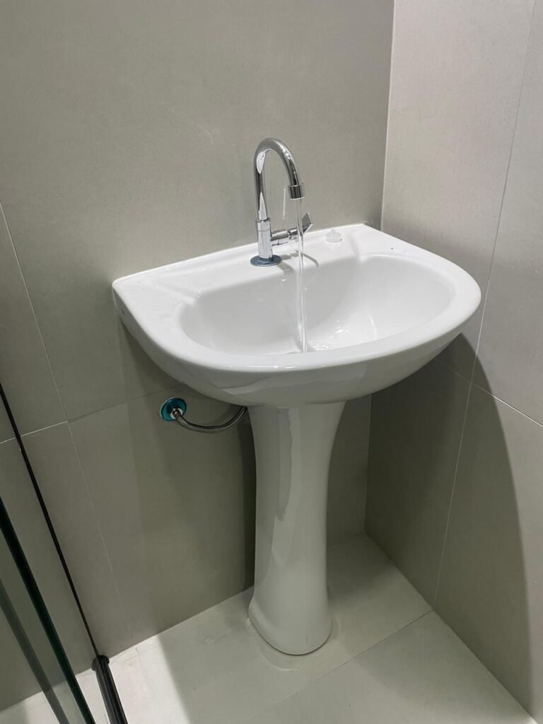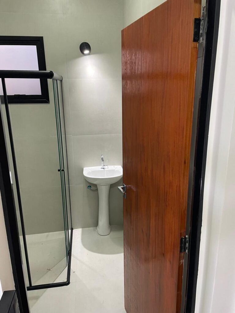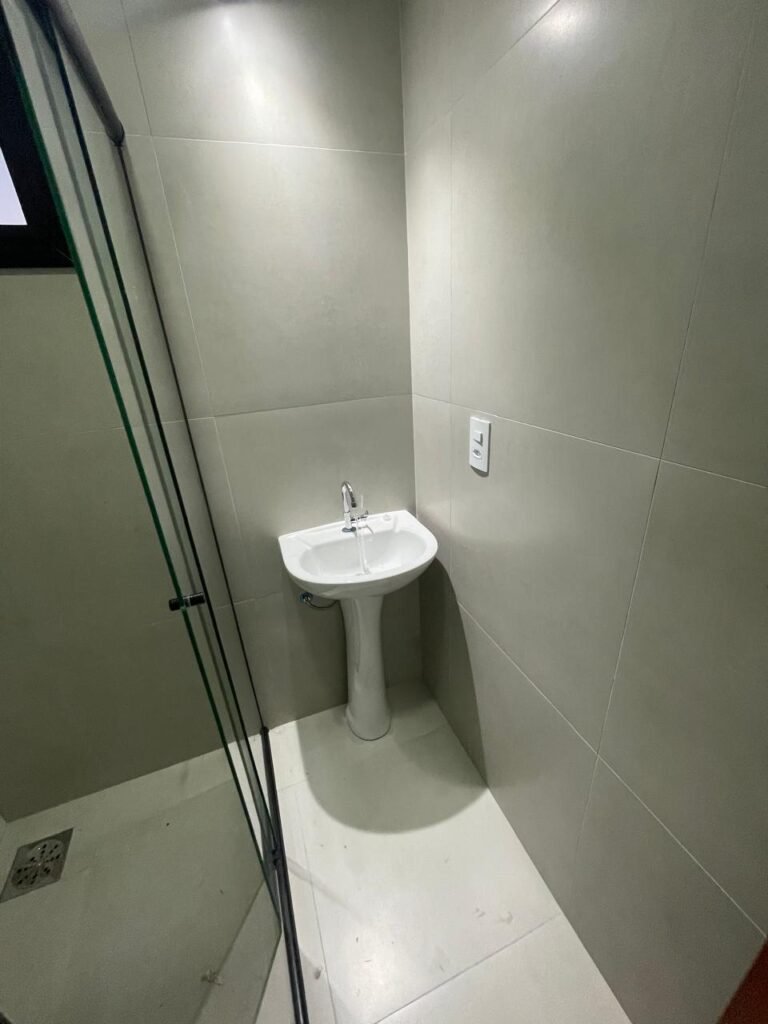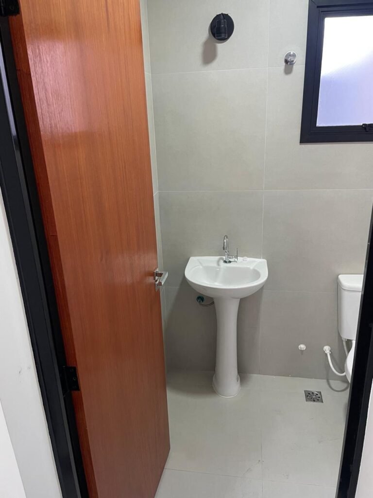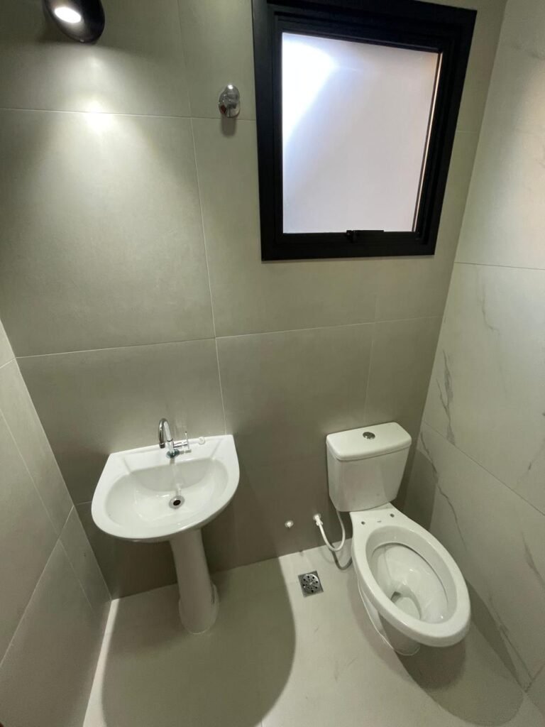 LAVABO -: 01 filete de soleira de mármore cor preto em ordem, 01 porta de madeira envernizada nova em ordem, maçaneta quadrada em inox nova em ordem, 01 fechadura com chave embutida em inox nova em ordem, batente com pintura nova na cor preto em ordem, paredes revestidas de porcelanato na cor cinza em ordem, teto com gola de gesso e pintura nova na cor branco neve em ordem, 01 luminária plafon de sobrepor com led em ordem, 01 spot com led em ordem, 01 vitrô basculante com esquadrias na cor preto em ordem, com 01 fechadura em ordem, 01 folha de vidro fosco em ordem, 01 canopla de registro em inox em ordem, 01 vaso sanitário com caixa acoplada, com descarga e válvula em ordem, ambos em cerâmica marca Incepa, 01 ralo de inox em ordem, 02 espelhos marca Margirus sendo eles, 01 espelho com 01 interruptor e 01 espelho com 01 tomada e 01 interruptor ambos em ordem, 01 pia com coluna em cerâmica cor branco, marca Celite em ordem, com 01 sifão embutido em ordem, com 01 torneira bica móvel em inox em ordem.