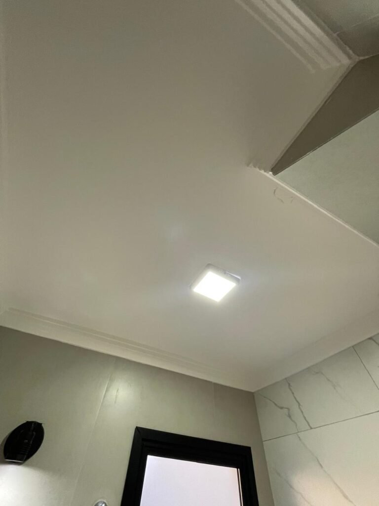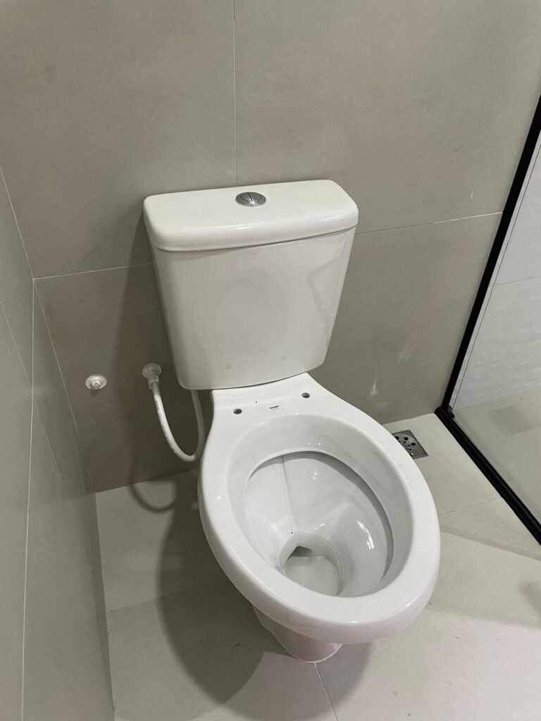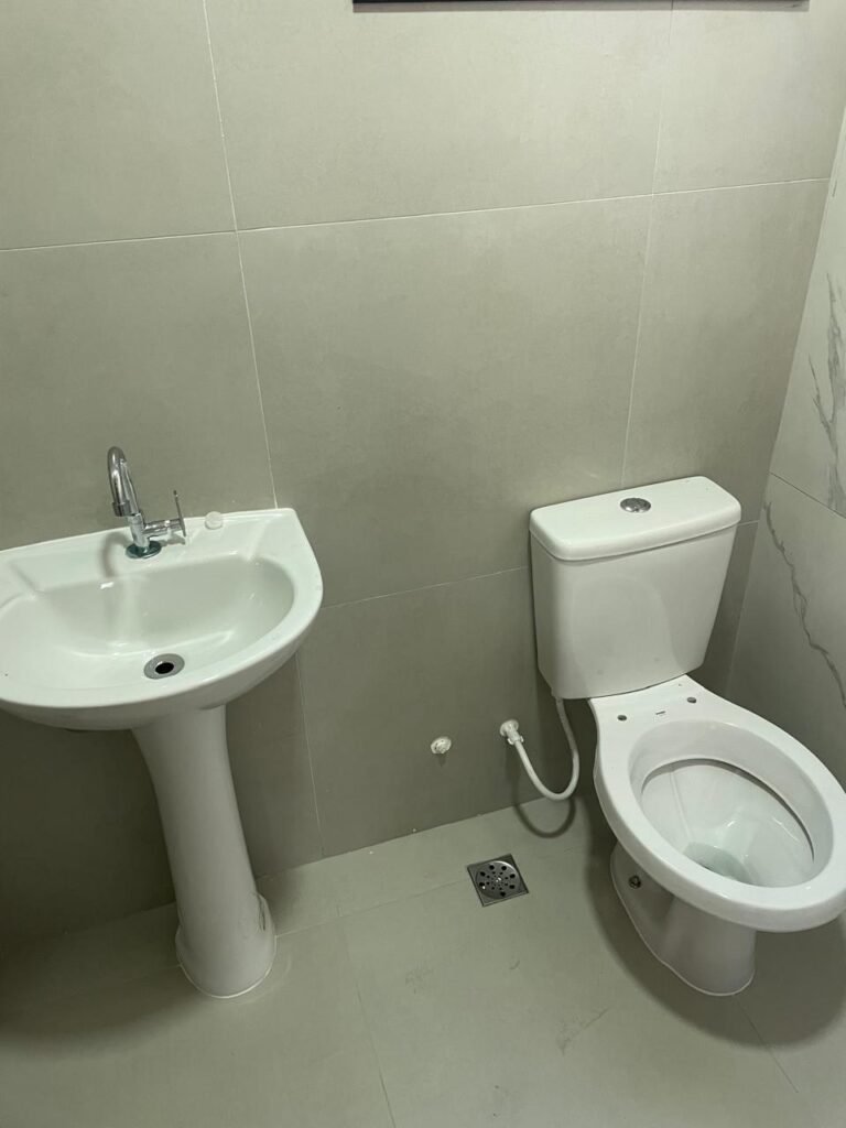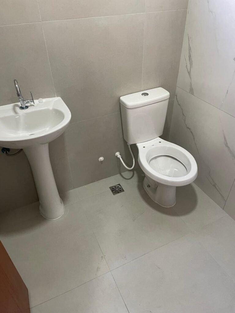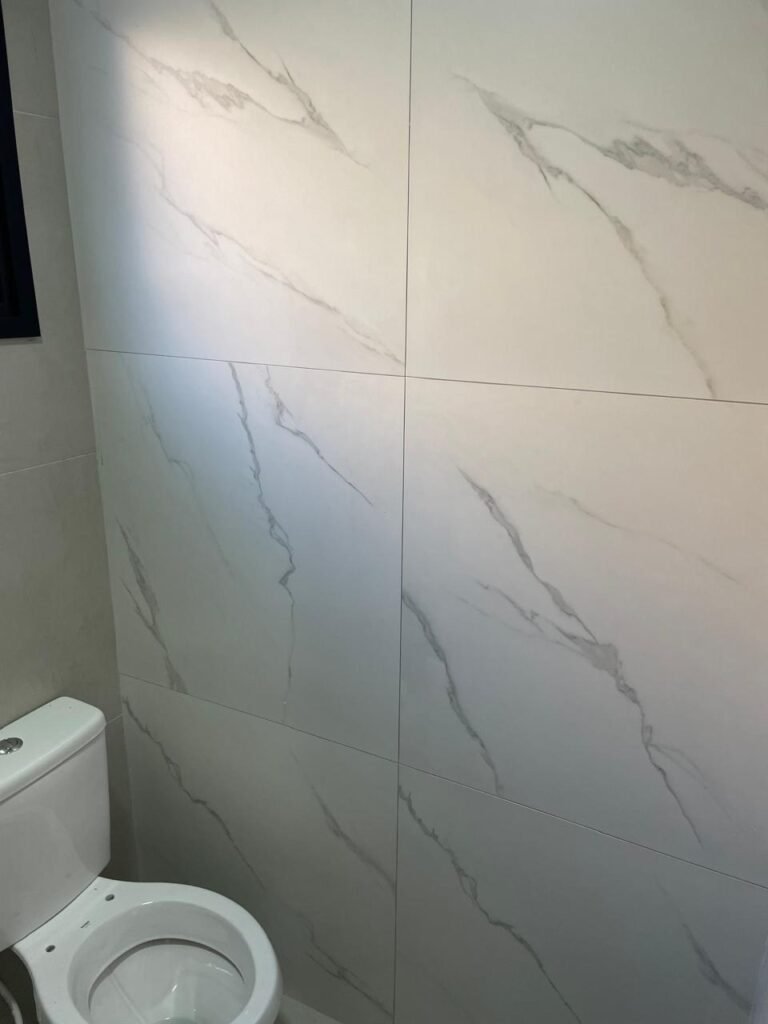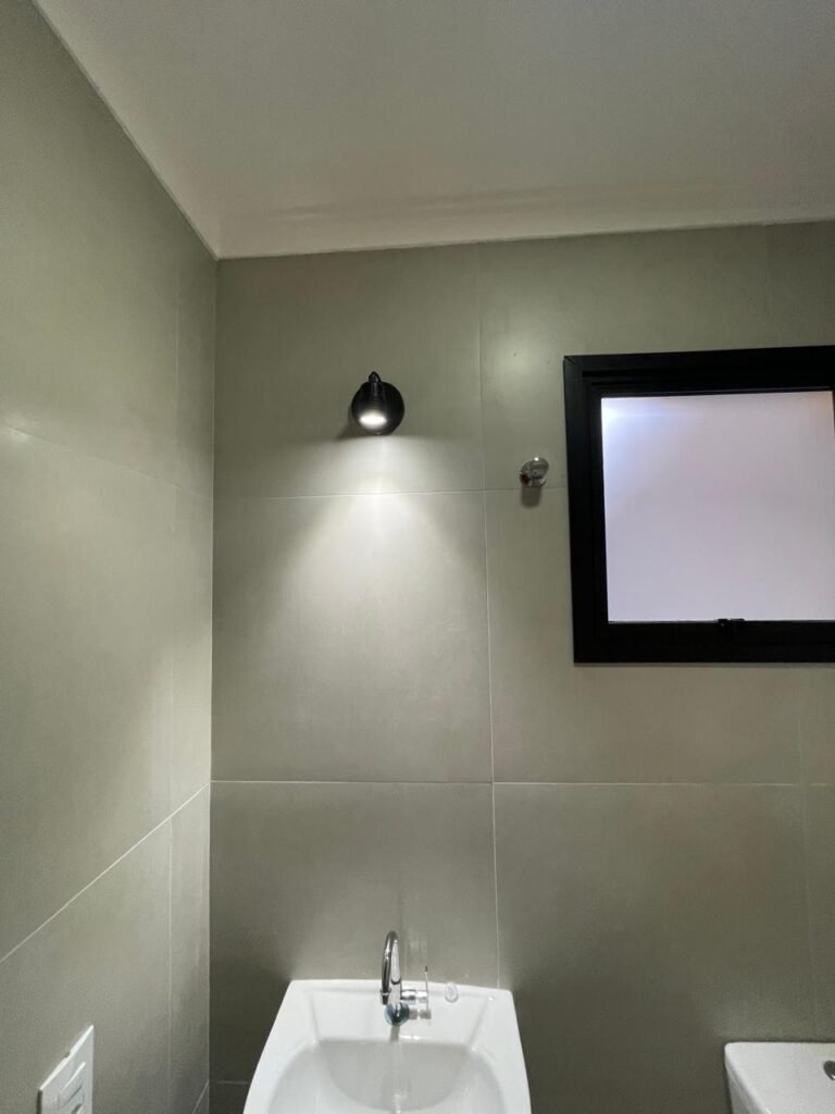 LAVABO -: 01 filete de soleira de mármore cor preto em ordem, 01 porta de madeira envernizada nova em ordem, maçaneta quadrada em inox nova em ordem, 01 fechadura com chave embutida em inox nova em ordem, batente com pintura nova na cor preto em ordem, paredes revestidas de porcelanato na cor cinza em ordem, teto com gola de gesso e pintura nova na cor branco neve em ordem, 01 luminária plafon de sobrepor com led em ordem, 01 spot com led em ordem, 01 vitrô basculante com esquadrias na cor preto em ordem, com 01 fechadura em ordem, 01 folha de vidro fosco em ordem, 01 canopla de registro em inox em ordem, 01 vaso sanitário com caixa acoplada, com descarga e válvula em ordem, ambos em cerâmica marca Incepa, 01 ralo de inox em ordem, 02 espelhos marca Margirus sendo eles, 01 espelho com 01 interruptor e 01 espelho com 01 tomada e 01 interruptor ambos em ordem, 01 pia com coluna em cerâmica cor branco, marca Celite em ordem, com 01 sifão embutido em ordem, com 01 torneira bica móvel em inox em ordem.
