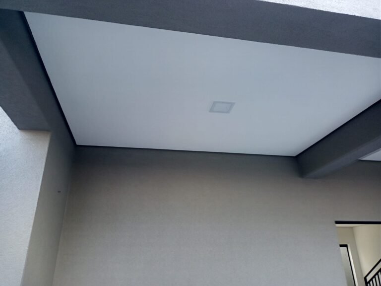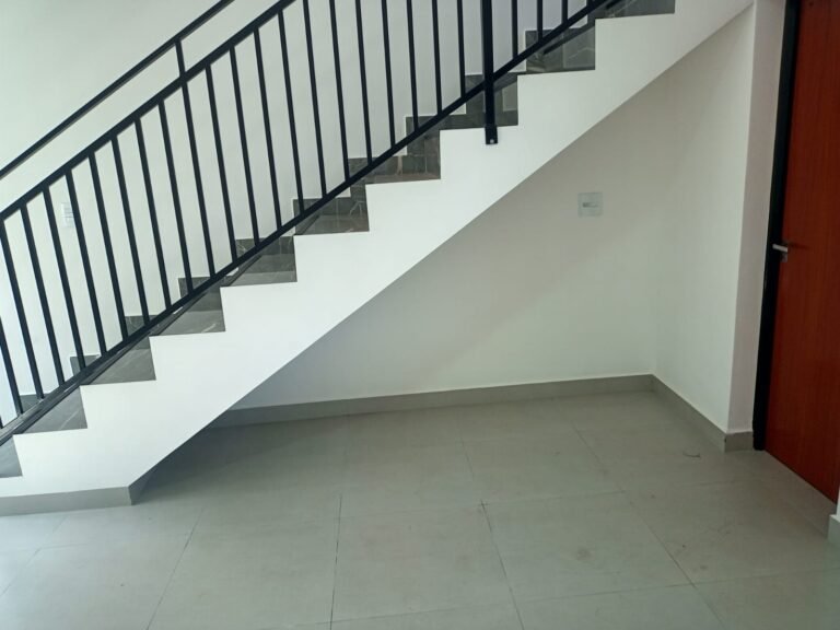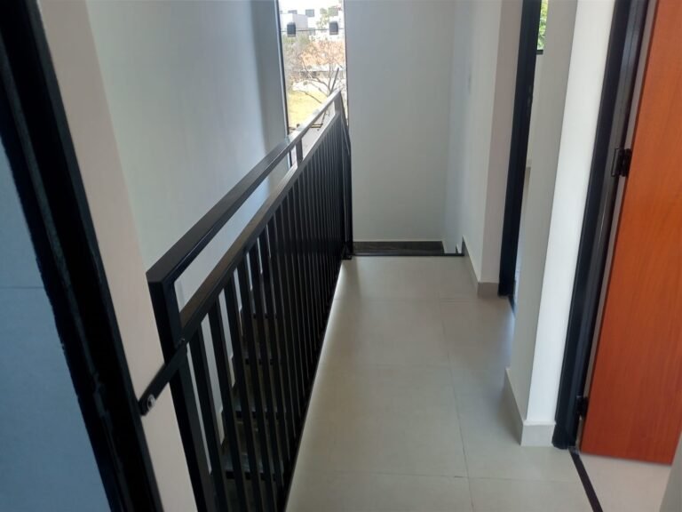 ESCADA-: 01 Escada com rodapé revestida de Porcelanato rajado em cinza e branco, 01 luminária plafon com led em ordem, 01 luminária de sobrepor com led em ordem, 01 janela basculante com trava em ordem, com 03 folhas de vidro lisos blindex, as paredes, o teto com gola de gesso e pintura nova na cor branco neve em ordem.