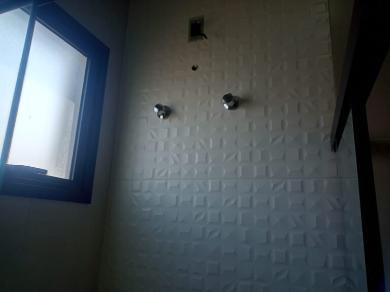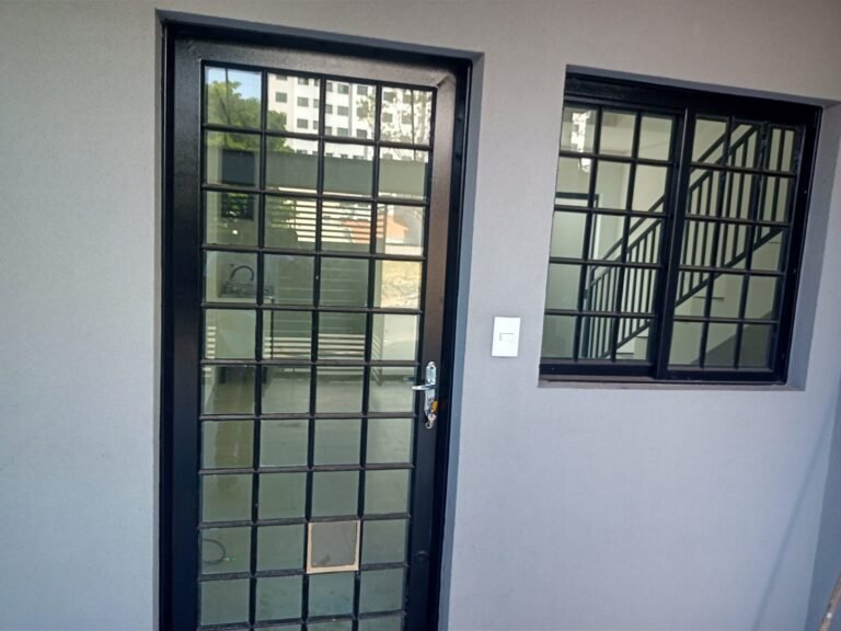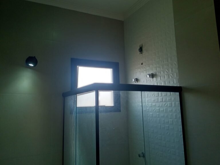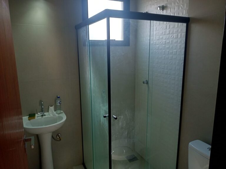 BANHEIRO-: 01 Soleira em mármore cor preto em ordem, 01 porta de madeira envernizada em ordem, com 01 maçaneta quadrada nova em ordem, 01 fechadura em inox com chave embutida em ordem, batente de ferro com pintura na cor preto em ordem, 01 box novo com esquadrias na cor preto, com 04 puxadores em ordem, com 04 folhas de vidros lisos blindex em ordem, 02 ralos de inox sendo 01 maior e 01 menor, ralo menor com tampa, 03 espelhos marca Margirus sendo, 01 com 01 interruptor, 01 com 01 interruptor e 01 tomada, e 01 espelho cego de chuveiro, 02 canoplas de registro com 01 acabamento incompleto e 01 em ordem, 01 pré-instalação de chuveiro,01 arandela de parede na cor preto em ordem,01 luminária em ordem, 01 parede revestida de azulejos novos na cor branco até o teto em ordem, 01 vitrô basculante com esquadrias na cor preto em ordem, com 01 fechadura em ordem, e 01 folha de vidro fosco em ordem.