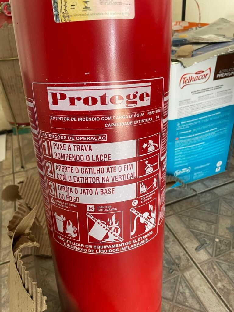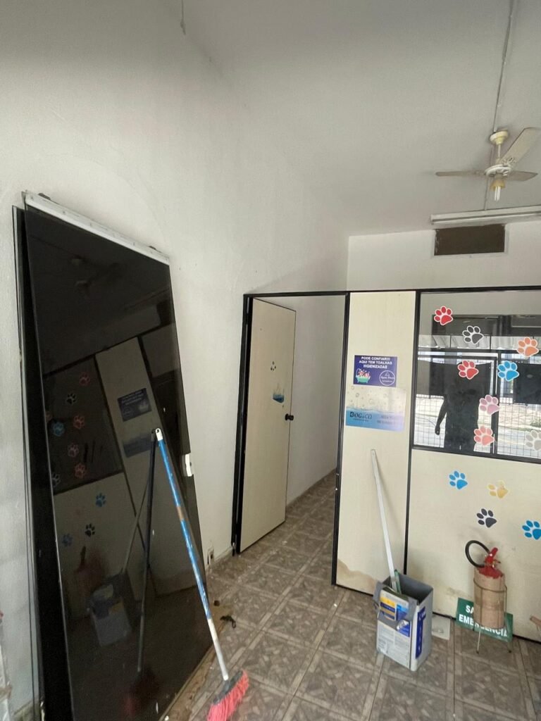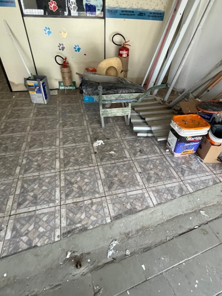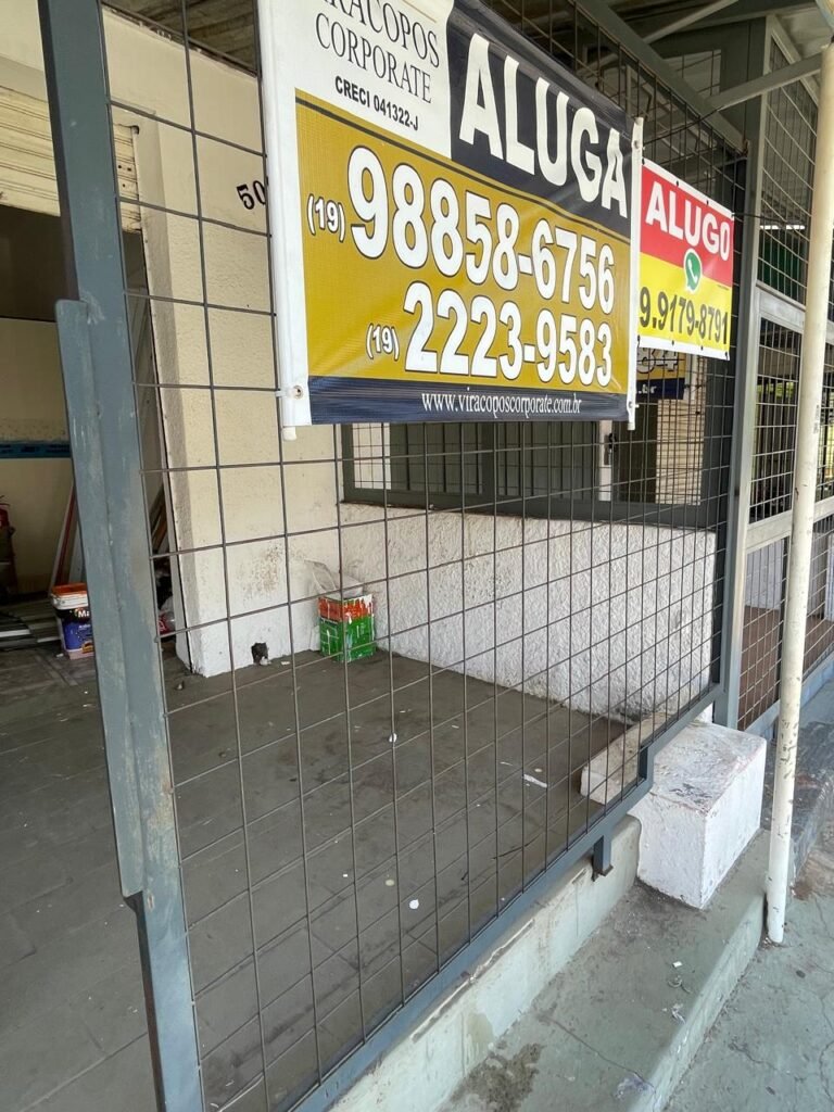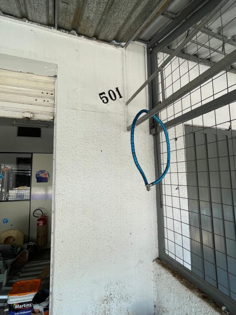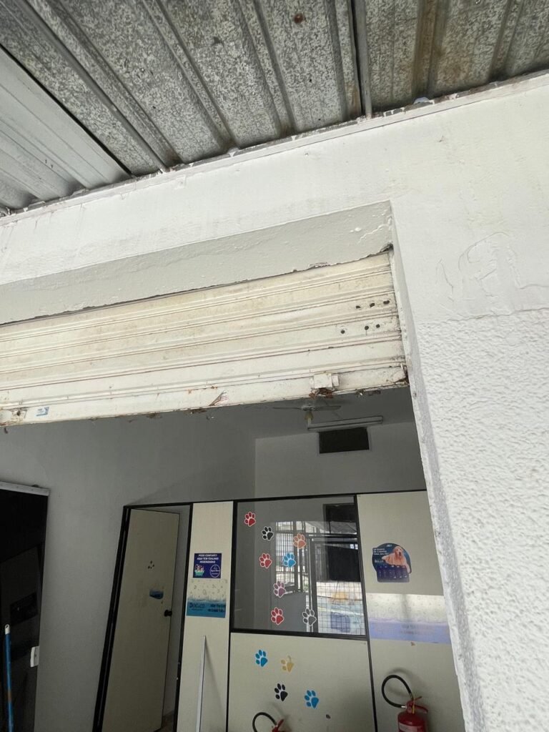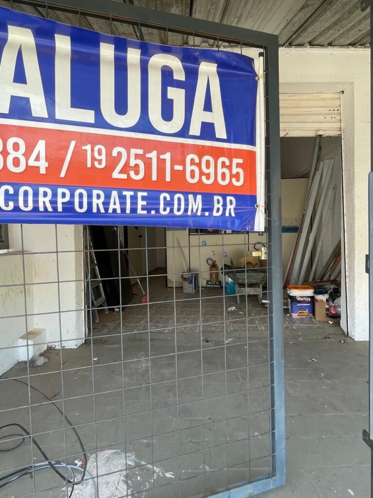SALÃO-: 01 porta de enrolar de ferro, com pintura na cor branco com desgaste natural, com 01 fechadura cadeado de chão em ordem, pisos e rodapés revestidos de pisos frios cerâmicos com desenhos, com manchas de tintas e com desgaste natural, paredes e teto com pintura na cor branco neve com desgaste natural, 01 caixa de disjuntores com tampa em ordem marca Internacional, sendo, 01 disjuntor C-40 DLB Lorenzetti, 02 extintores novos marca Protege, sendo 01 de pó químico 20-B:C e 01 com carga d’água 2-A, 07 módulos de energia de sobrepor sendo, 04 tomadas, 01 espelho de fio de dados e 01 com 02 interruptores, 04 espelhos de força sendo, 02 espelhos cegos com 01 deles danificado, 01 tomada com espelho desencaixado e 01 espelho com 03 interruptores de ventilador, 01 censor de presença com manchas de tintas, 02 luminárias com 02 lâmpadas florescentes tubulares cada, 01 ventilador de teto cor branco com manchas de tintas, com 01 luminária com 01 lâmpada Led, 01 divisória com esquadrias na cor preta, com 01 folha de vidro liso blindex com adesivos diversos, 01 porta social com 01 maçaneta com tranca interna e externa, 01 tela com rede com manchada de tinta cor branco e com esquadrias cor branco.