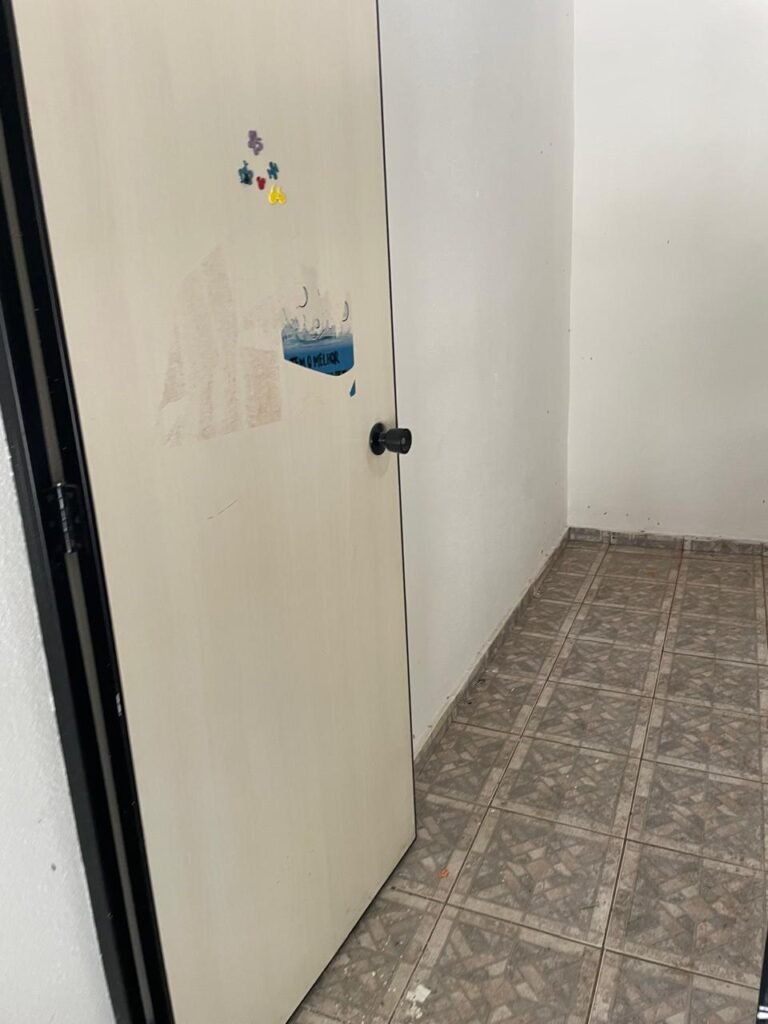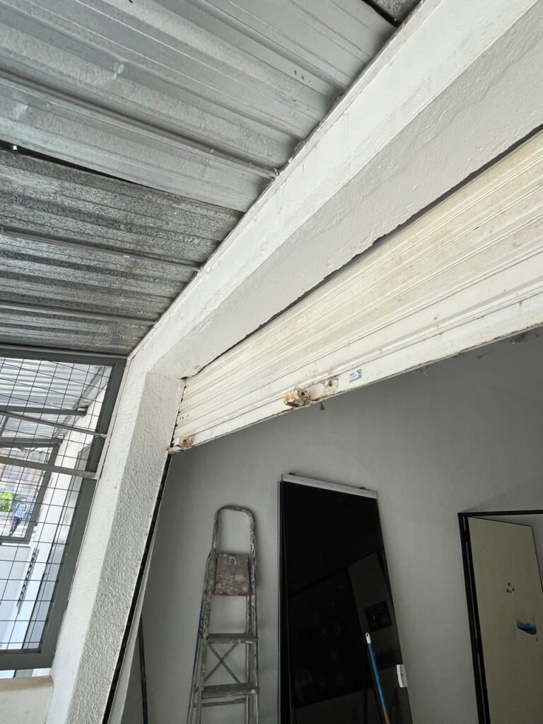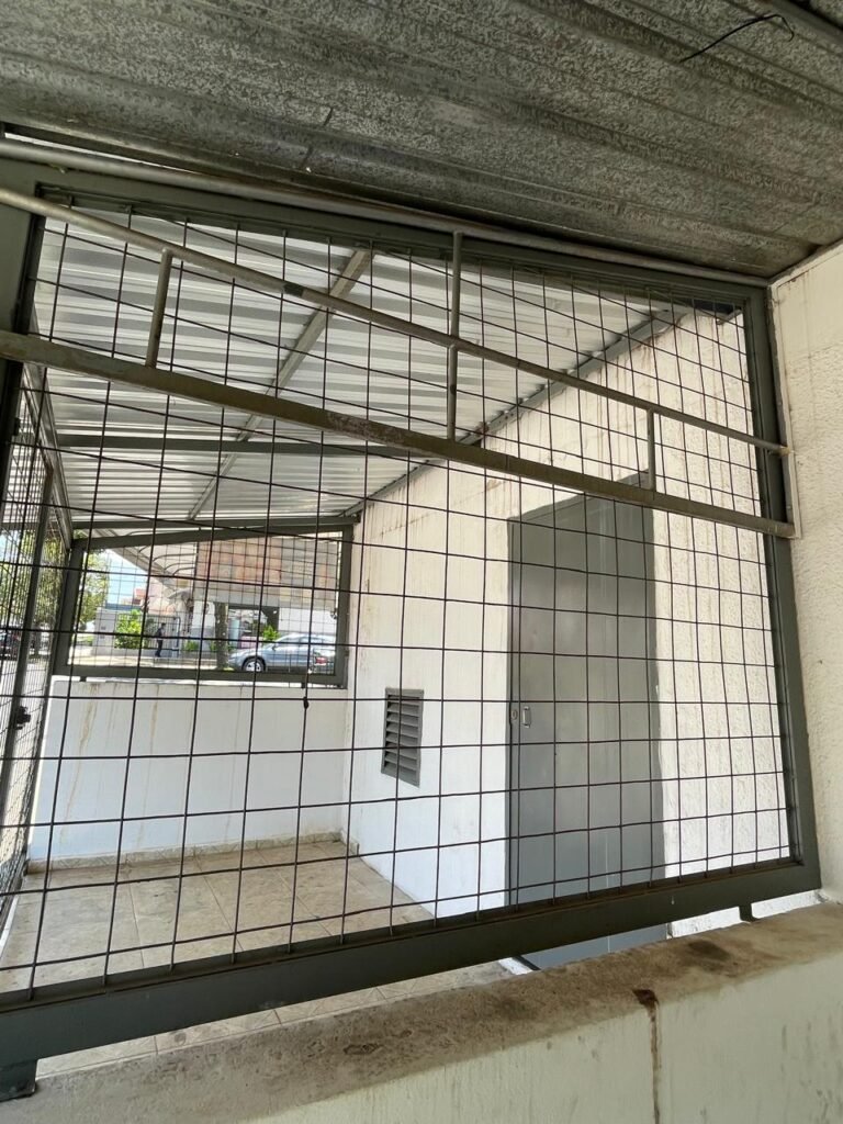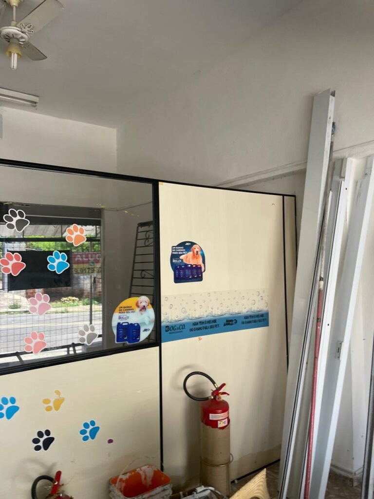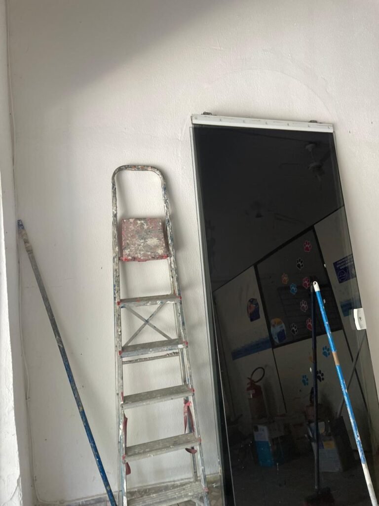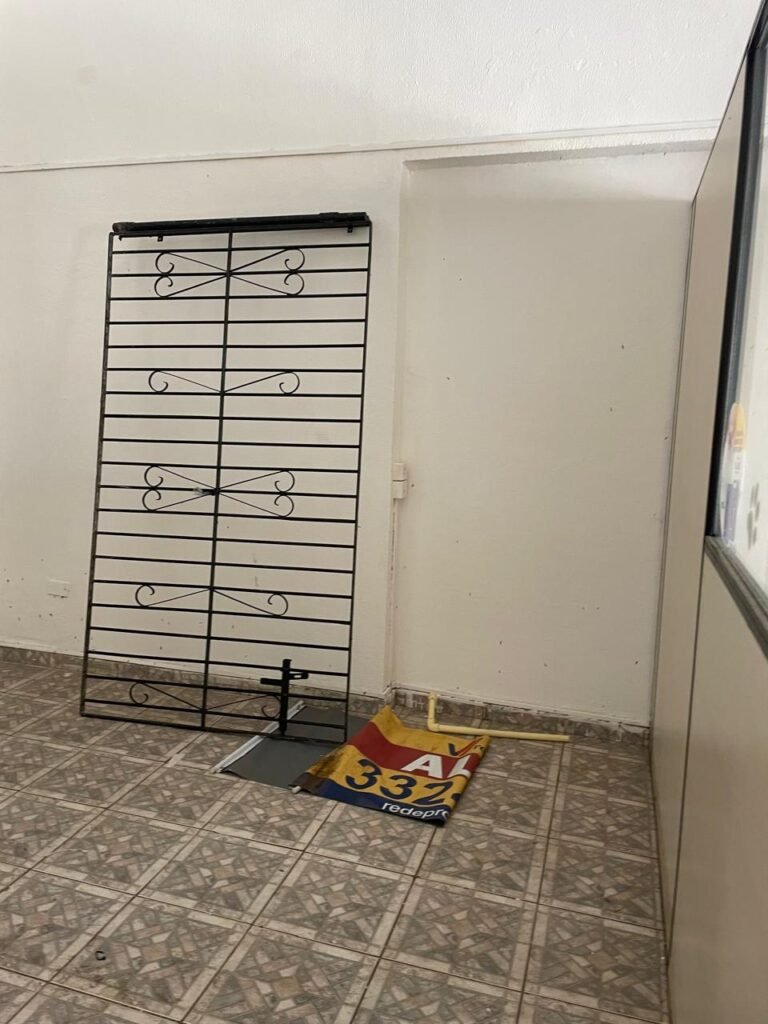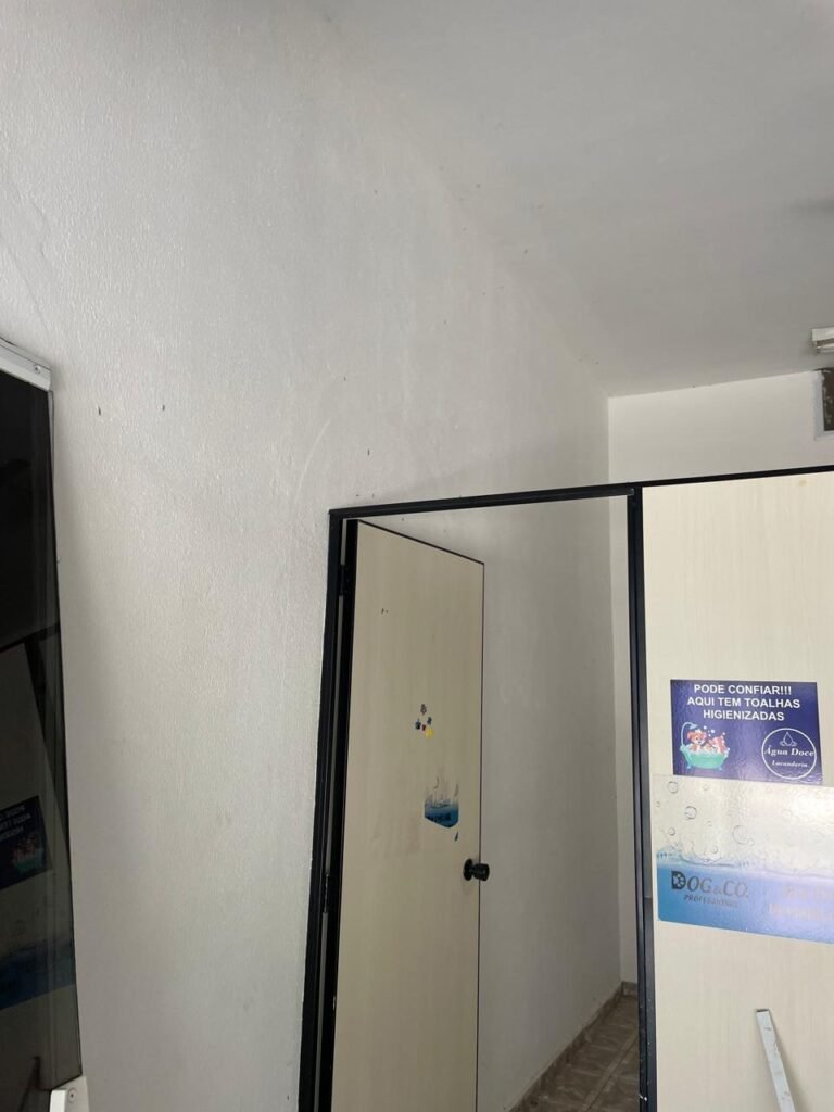 SALÃO-: 01 porta de enrolar de ferro, com pintura na cor branco com desgaste natural, com 01 fechadura cadeado de chão em ordem, pisos e rodapés revestidos de pisos frios cerâmicos com desenhos, com manchas de tintas e com desgaste natural, paredes e teto com pintura na cor branco neve com desgaste natural, 01 caixa de disjuntores com tampa em ordem marca Internacional, sendo, 01 disjuntor C-40 DLB Lorenzetti, 02 extintores novos marca Protege, sendo 01 de pó químico 20-B:C e 01 com carga d’água 2-A, 07 módulos de energia de sobrepor sendo, 04 tomadas, 01 espelho de fio de dados e 01 com 02 interruptores, 04 espelhos de força sendo, 02 espelhos cegos com 01 deles danificado, 01 tomada com espelho desencaixado e 01 espelho com 03 interruptores de ventilador, 01 censor de presença com manchas de tintas, 02 luminárias com 02 lâmpadas florescentes tubulares cada, 01 ventilador de teto cor branco com manchas de tintas, com 01 luminária com 01 lâmpada Led, 01 divisória com esquadrias na cor preta, com 01 folha de vidro liso blindex com adesivos diversos, 01 porta social com 01 maçaneta com tranca interna e externa, 01 tela com rede com manchada de tinta cor branco e com esquadrias cor branco.