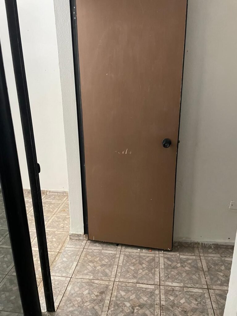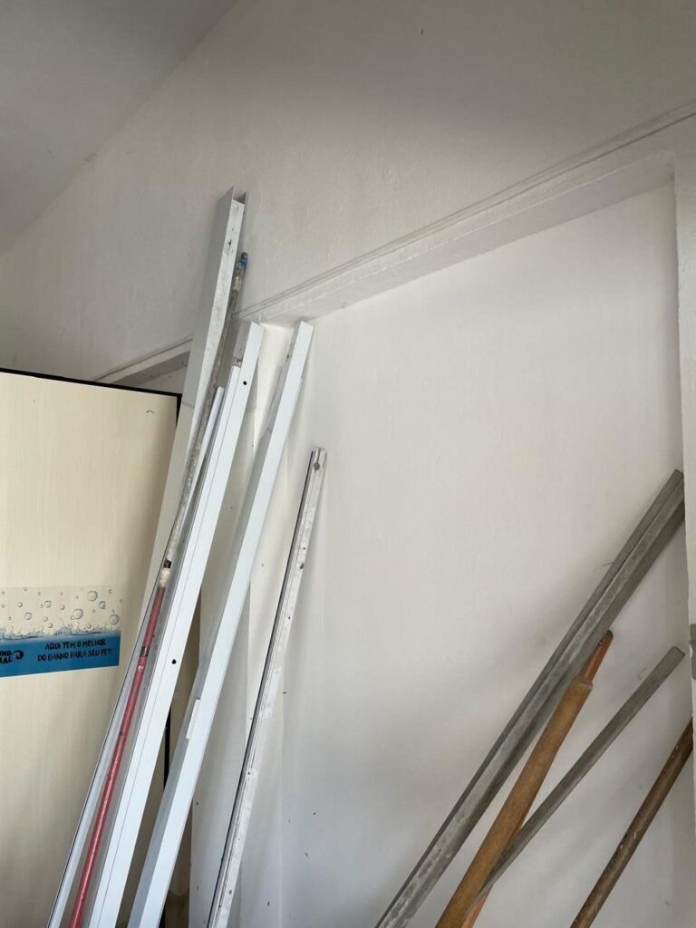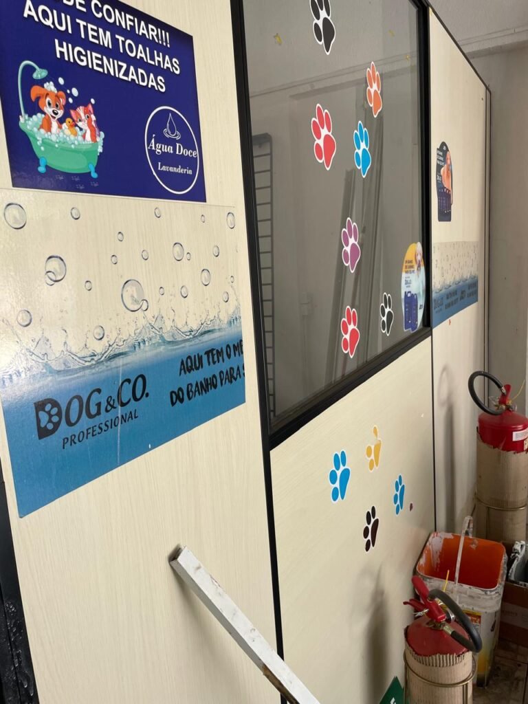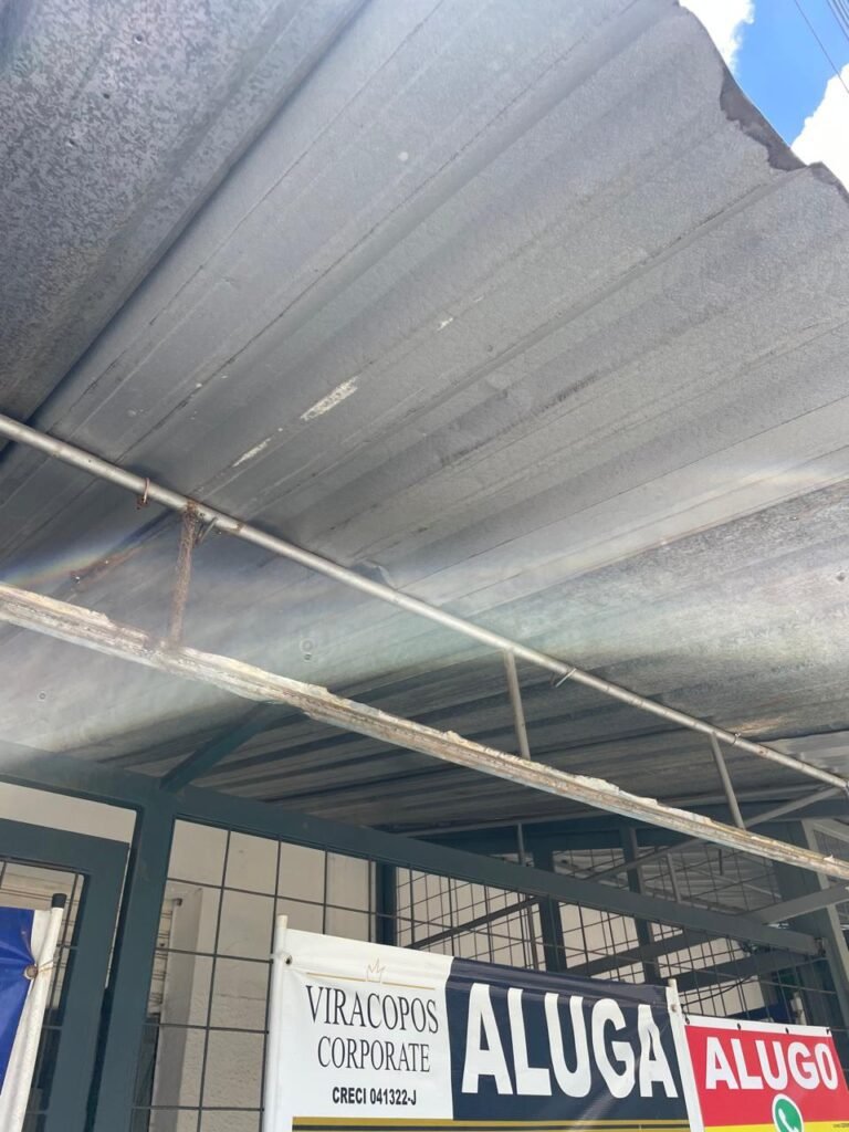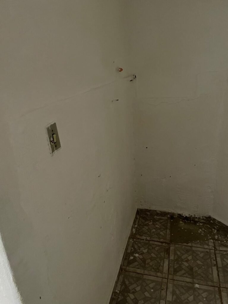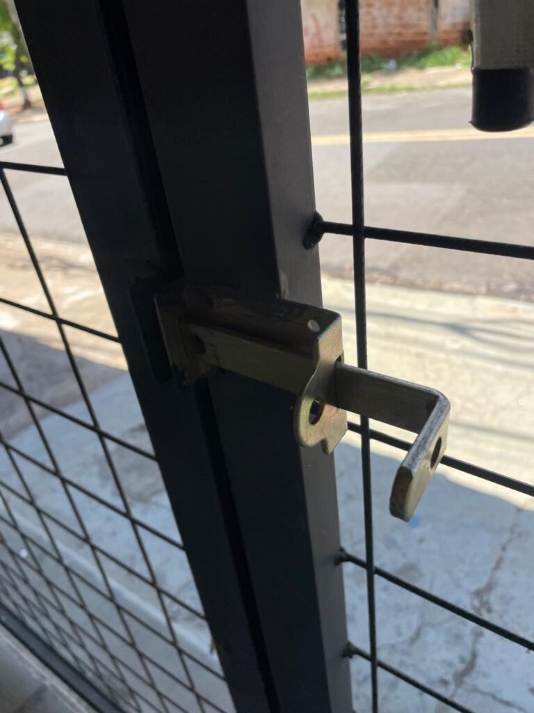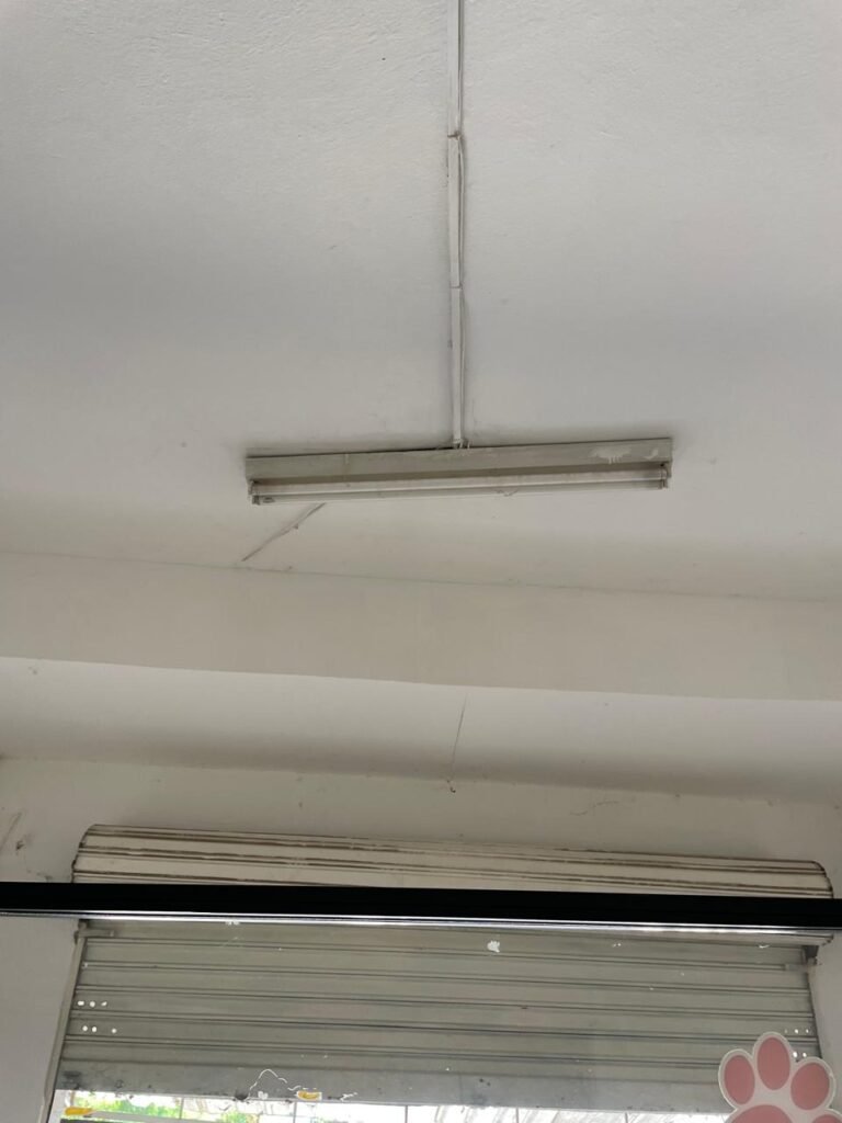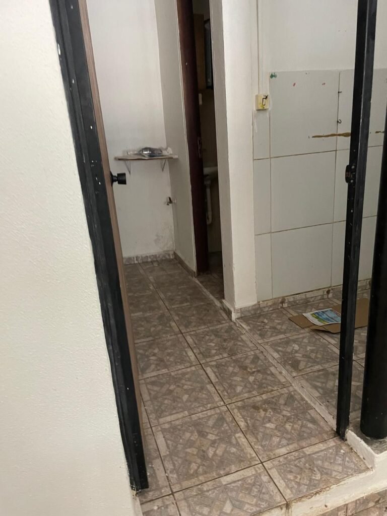 SALÃO-: 01 porta de enrolar de ferro, com pintura na cor branco com desgaste natural, com 01 fechadura cadeado de chão em ordem, pisos e rodapés revestidos de pisos frios cerâmicos com desenhos, com manchas de tintas e com desgaste natural, paredes e teto com pintura na cor branco neve com desgaste natural, 01 caixa de disjuntores com tampa em ordem marca Internacional, sendo, 01 disjuntor C-40 DLB Lorenzetti, 02 extintores novos marca Protege, sendo 01 de pó químico 20-B:C e 01 com carga d’água 2-A, 07 módulos de energia de sobrepor sendo, 04 tomadas, 01 espelho de fio de dados e 01 com 02 interruptores, 04 espelhos de força sendo, 02 espelhos cegos com 01 deles danificado, 01 tomada com espelho desencaixado e 01 espelho com 03 interruptores de ventilador, 01 censor de presença com manchas de tintas, 02 luminárias com 02 lâmpadas florescentes tubulares cada, 01 ventilador de teto cor branco com manchas de tintas, com 01 luminária com 01 lâmpada Led, 01 divisória com esquadrias na cor preta, com 01 folha de vidro liso blindex com adesivos diversos, 01 porta social com 01 maçaneta com tranca interna e externa, 01 tela com rede com manchada de tinta cor branco e com esquadrias cor branco.