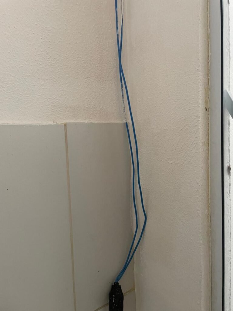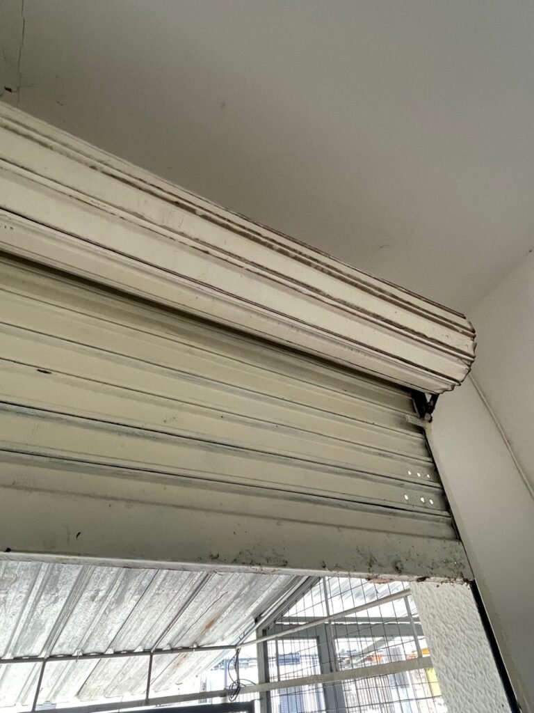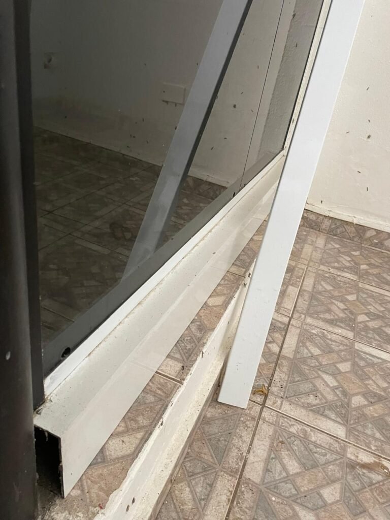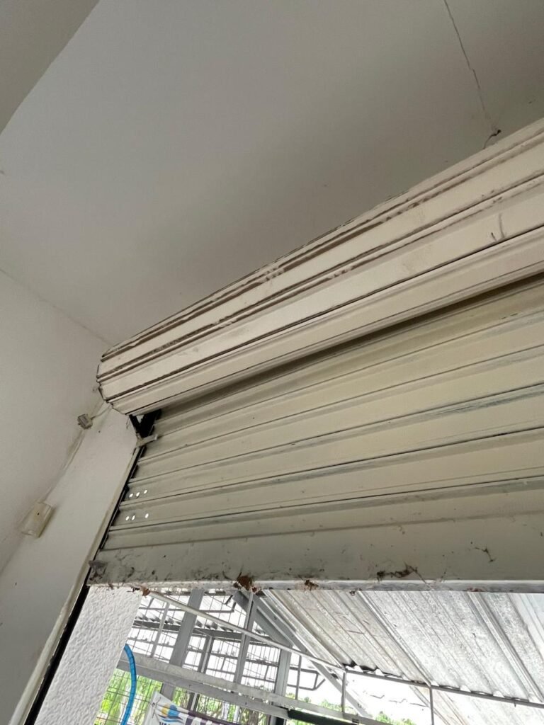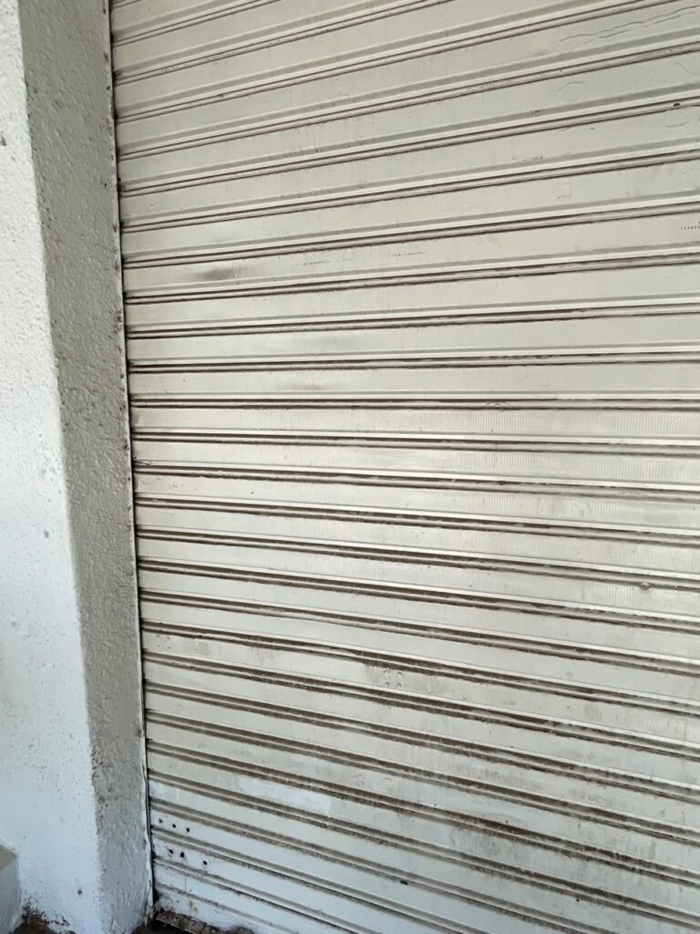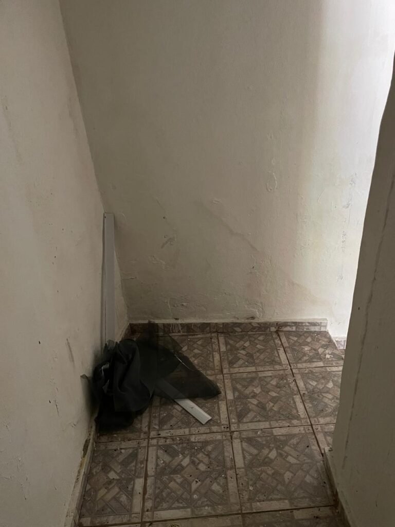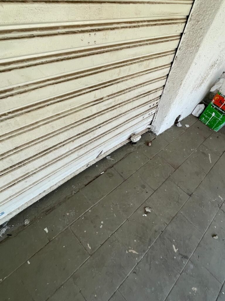 SALÃO-: 01 porta de enrolar de ferro, com pintura na cor branco com desgaste natural, com 01 fechadura cadeado de chão em ordem, pisos e rodapés revestidos de pisos frios cerâmicos com desenhos, com manchas de tintas e com desgaste natural, paredes e teto com pintura na cor branco neve com desgaste natural, 01 caixa de disjuntores com tampa em ordem marca Internacional, sendo, 01 disjuntor C-40 DLB Lorenzetti, 02 extintores novos marca Protege, sendo 01 de pó químico 20-B:C e 01 com carga d’água 2-A, 07 módulos de energia de sobrepor sendo, 04 tomadas, 01 espelho de fio de dados e 01 com 02 interruptores, 04 espelhos de força sendo, 02 espelhos cegos com 01 deles danificado, 01 tomada com espelho desencaixado e 01 espelho com 03 interruptores de ventilador, 01 censor de presença com manchas de tintas, 02 luminárias com 02 lâmpadas florescentes tubulares cada, 01 ventilador de teto cor branco com manchas de tintas, com 01 luminária com 01 lâmpada Led, 01 divisória com esquadrias na cor preta, com 01 folha de vidro liso blindex com adesivos diversos, 01 porta social com 01 maçaneta com tranca interna e externa, 01 tela com rede com manchada de tinta cor branco e com esquadrias cor branco.