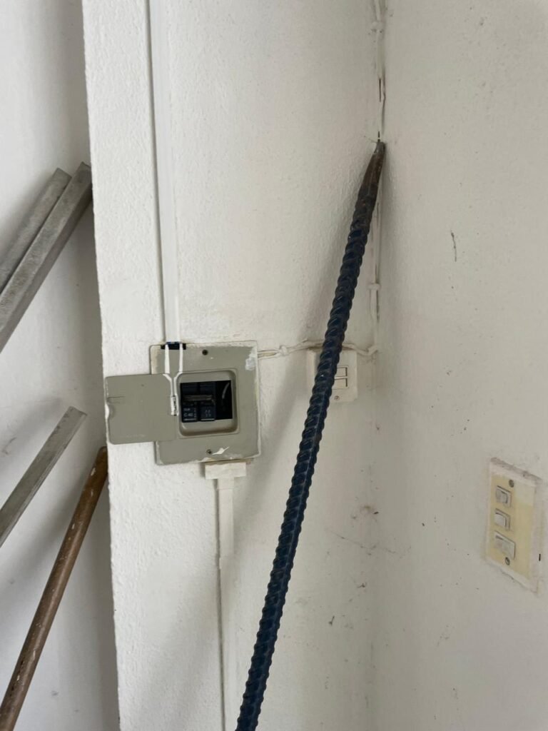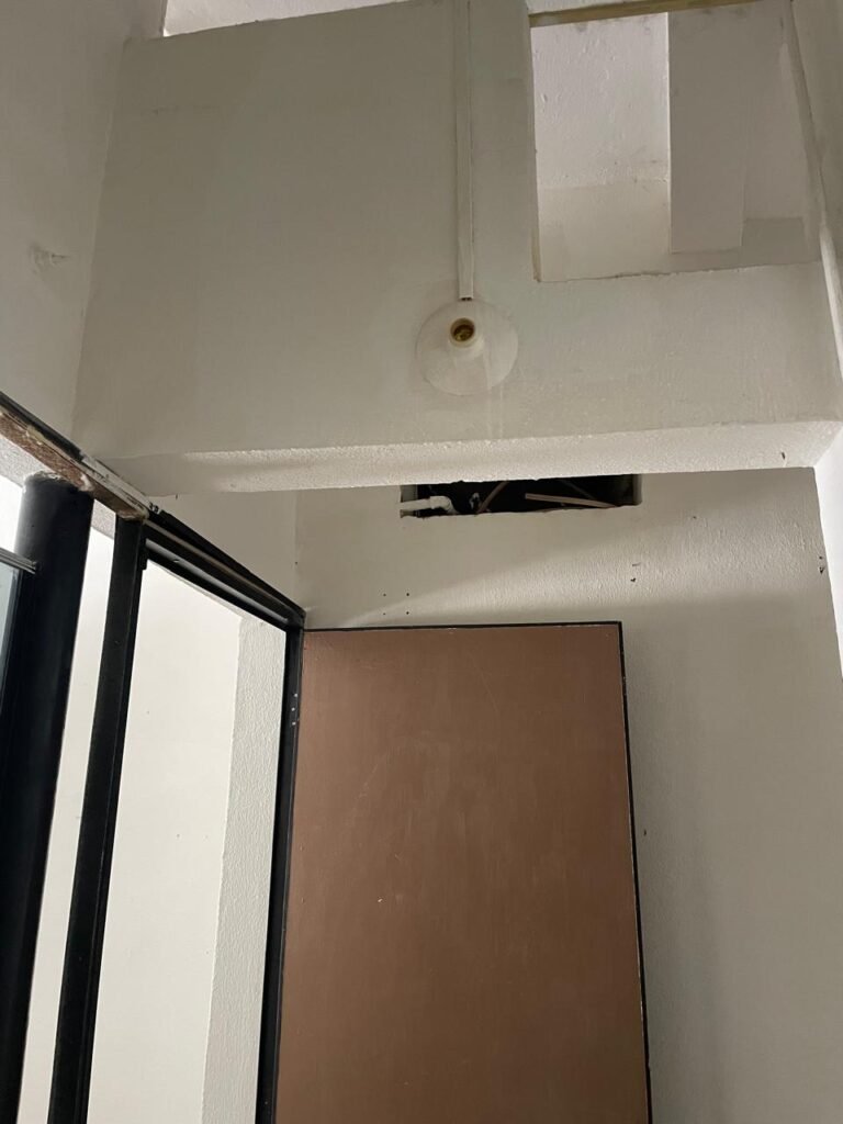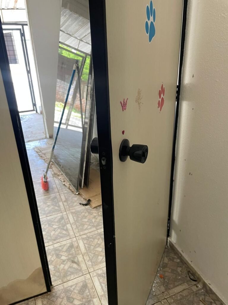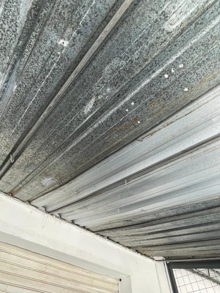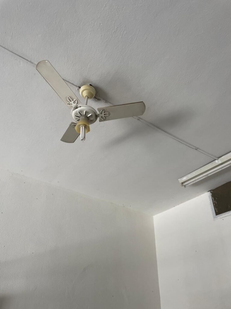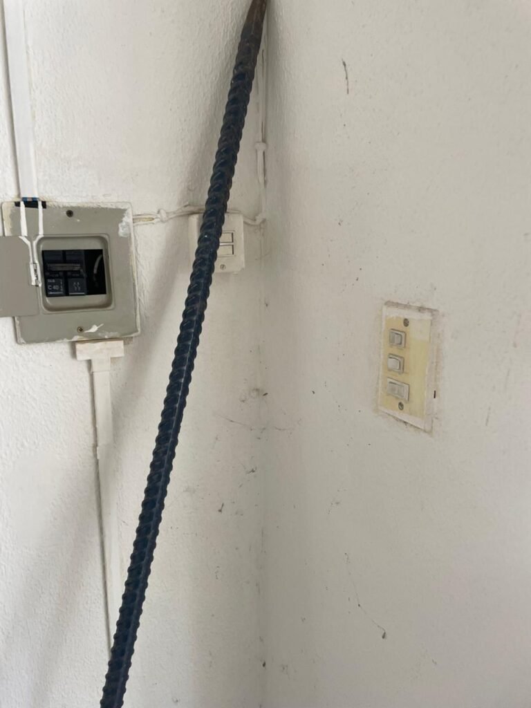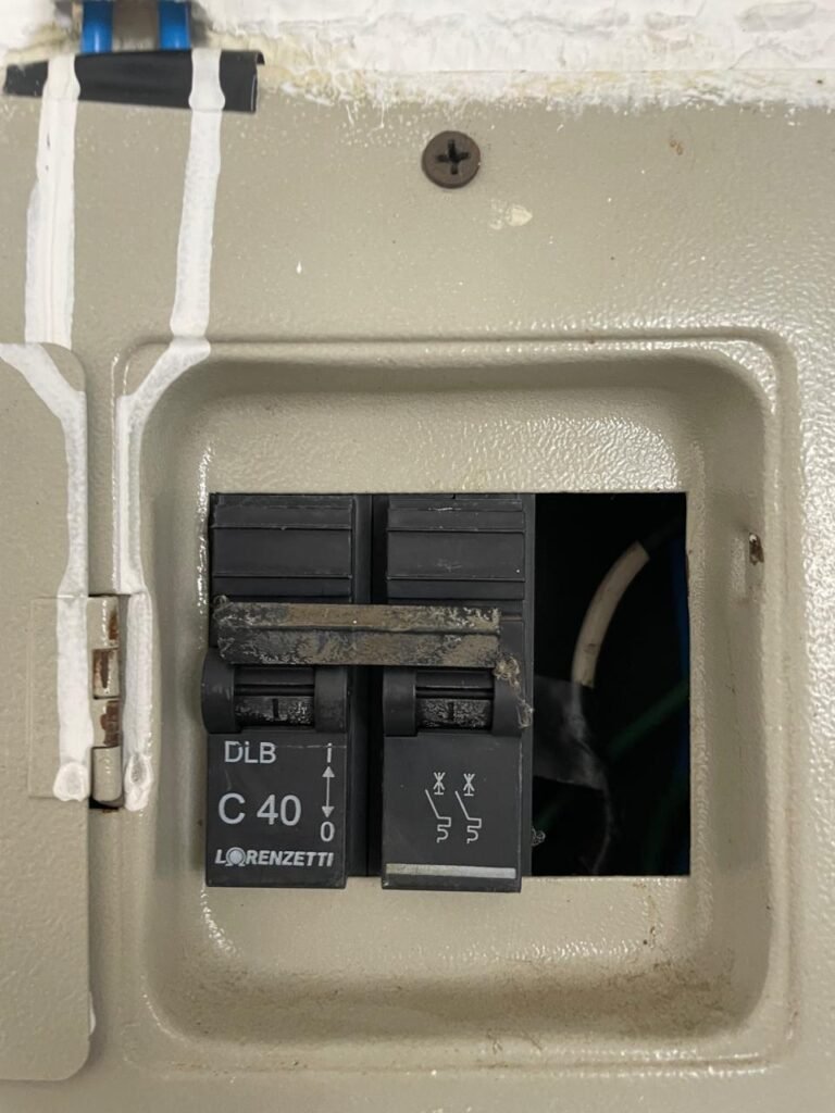SALÃO-: 01 porta de enrolar de ferro, com pintura na cor branco com desgaste natural, com 01 fechadura cadeado de chão em ordem, pisos e rodapés revestidos de pisos frios cerâmicos com desenhos, com manchas de tintas e com desgaste natural, paredes e teto com pintura na cor branco neve com desgaste natural, 01 caixa de disjuntores com tampa em ordem marca Internacional, sendo, 01 disjuntor C-40 DLB Lorenzetti, 02 extintores novos marca Protege, sendo 01 de pó químico 20-B:C e 01 com carga d’água 2-A, 07 módulos de energia de sobrepor sendo, 04 tomadas, 01 espelho de fio de dados e 01 com 02 interruptores, 04 espelhos de força sendo, 02 espelhos cegos com 01 deles danificado, 01 tomada com espelho desencaixado e 01 espelho com 03 interruptores de ventilador, 01 censor de presença com manchas de tintas, 02 luminárias com 02 lâmpadas florescentes tubulares cada, 01 ventilador de teto cor branco com manchas de tintas, com 01 luminária com 01 lâmpada Led, 01 divisória com esquadrias na cor preta, com 01 folha de vidro liso blindex com adesivos diversos, 01 porta social com 01 maçaneta com tranca interna e externa, 01 tela com rede com manchada de tinta cor branco e com esquadrias cor branco.