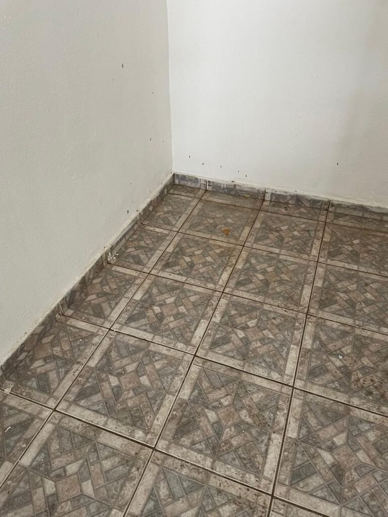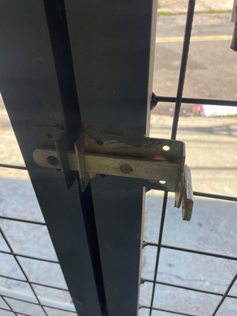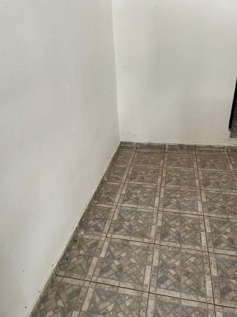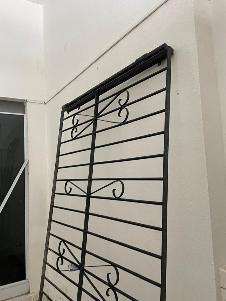 FACHADA-: Calçada de concreto com pintura na cor cinza, com desgaste natural, com trincas pela extensão e manchas de tintas, 01 degrau de alvenaria com pintura na cor cinza com desgaste natural, com trincas pela extensão e manchas de tintas , 01 portão de grades de ferro com desgaste natural, marcas de ferrugem, 01 fechadura com corrente e cadeado em ordem, piso e rodapés revestidos de pisos frios cerâmicos cor cinza com desgaste natural e com manchas de tintas, parede 1/2 de alvenaria com pintura na cor branco neve com desgaste natural e manchas pela extensão, restante de grades de ferro com pintura na cor cinza, com desgaste natural e manchas de tintas, telhado de telhas galvanizadas com desgaste natural e com alguns furos, restante em ordem, dígitos de ferro “5-0-1” com pintura na cor preto.