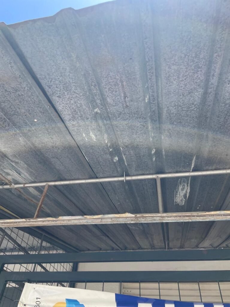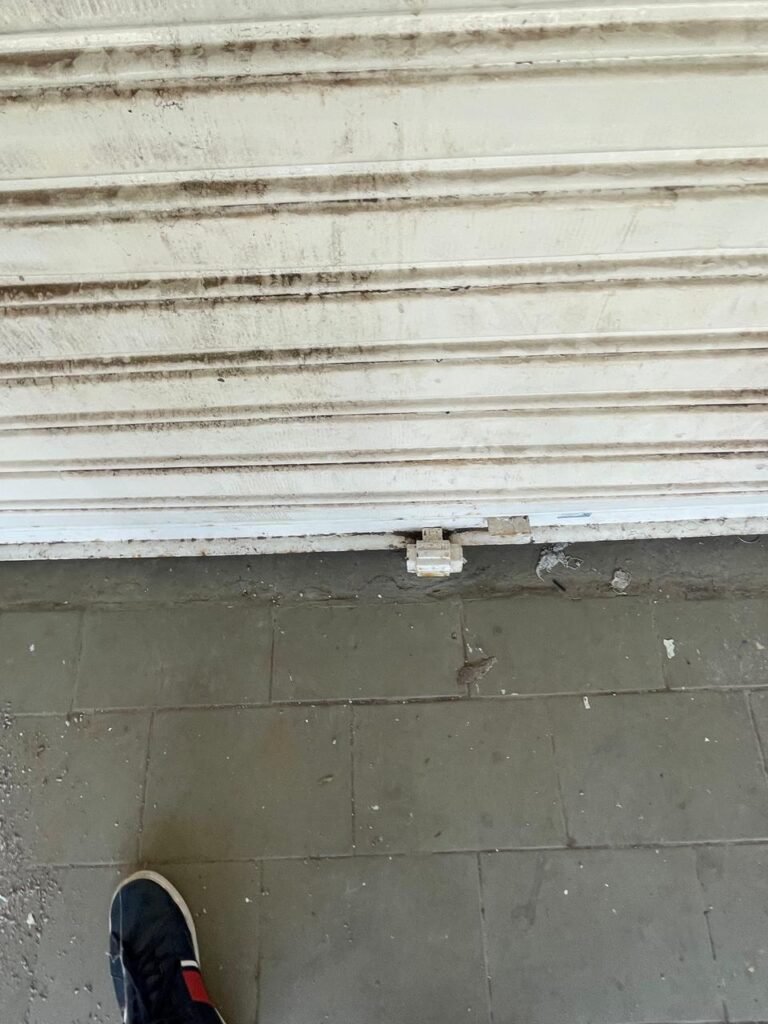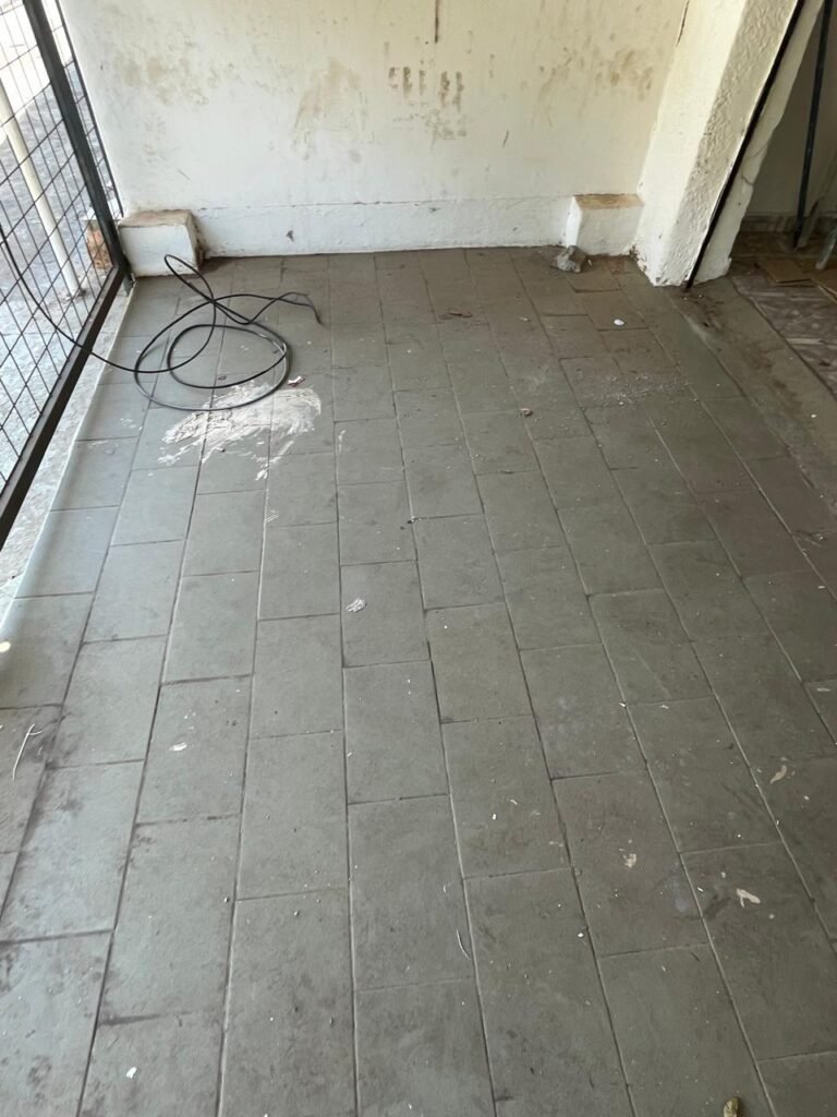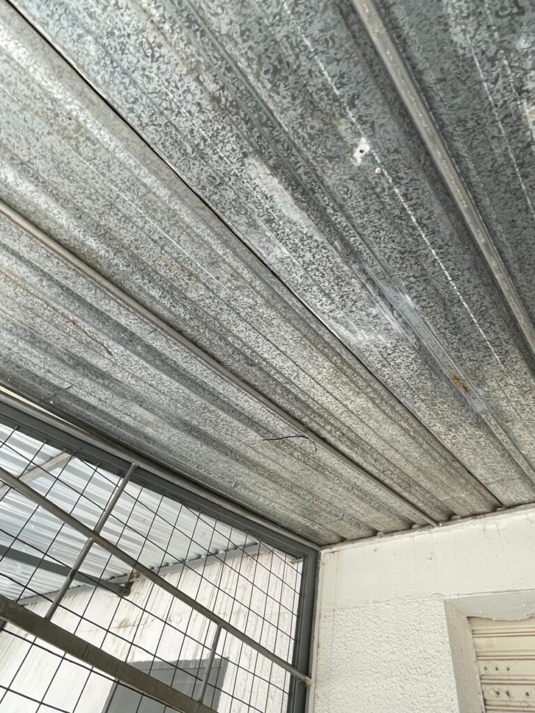 FACHADA-: Calçada de concreto com pintura na cor cinza, com desgaste natural, com trincas pela extensão e manchas de tintas, 01 degrau de alvenaria com pintura na cor cinza com desgaste natural, com trincas pela extensão e manchas de tintas , 01 portão de grades de ferro com desgaste natural, marcas de ferrugem, 01 fechadura com corrente e cadeado em ordem, piso e rodapés revestidos de pisos frios cerâmicos cor cinza com desgaste natural e com manchas de tintas, parede 1/2 de alvenaria com pintura na cor branco neve com desgaste natural e manchas pela extensão, restante de grades de ferro com pintura na cor cinza, com desgaste natural e manchas de tintas, telhado de telhas galvanizadas com desgaste natural e com alguns furos, restante em ordem, dígitos de ferro “5-0-1” com pintura na cor preto.