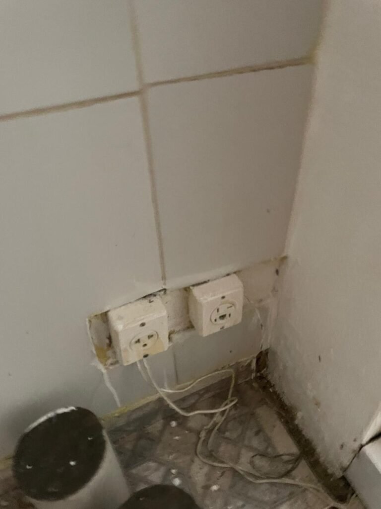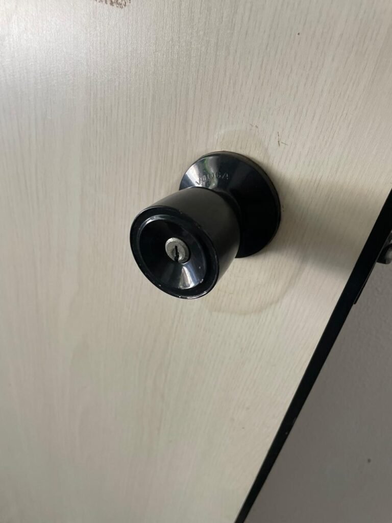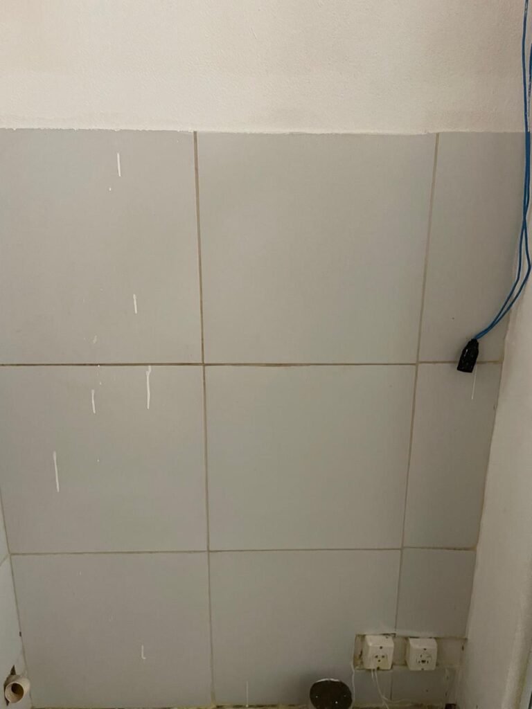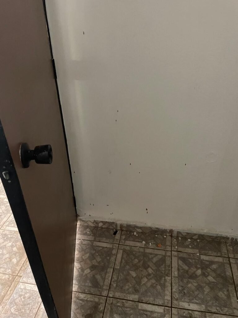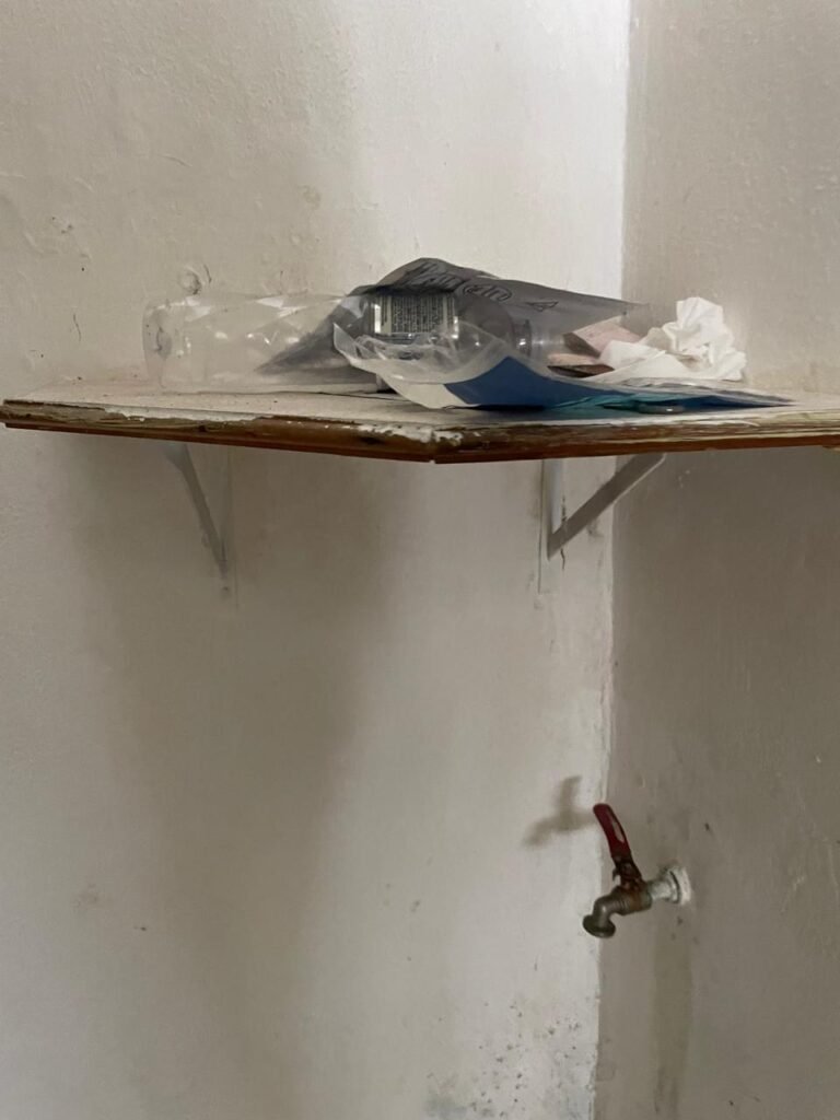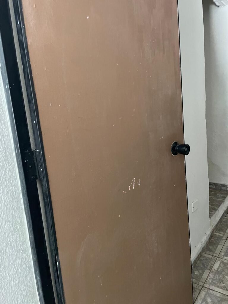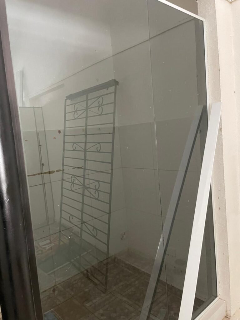 HALL BANHEIRO-: 01 divisória com 02 folhas de vidro blindex com insufilme cor preto, com 01 porta social de madeira com pintura na cor marrom com desgaste natural, com esquadrias na cor preto, com fechadura de tranca interna e externa com chave, pisos e rodapés revestidos de pisos frios cerâmicos com desenhos, com desgaste natural e com manchas de tintas, paredes com pintura na cor branco neve com desgaste natural, parte das paredes revestidas de pisos frios cerâmicos cor branco gelo com manchas de tinta e com adesivos diversos, 01 bocal de lâmpada, 02 módulos de energia de sobrepor sendo, 01 tomada com fiação aparente e 01 caixa de fios de dados com fiação aparente, 01 fiação aparente com tomada cor preta, 01 módulo de energia de sobrepor com 01 interruptor, manchado de tinta e com desgaste natural, 01 espelho cego, 01 prateleira de madeira fixa, com pintura na cor branco com desgaste natural, 01 torneira de jardim em ordem.