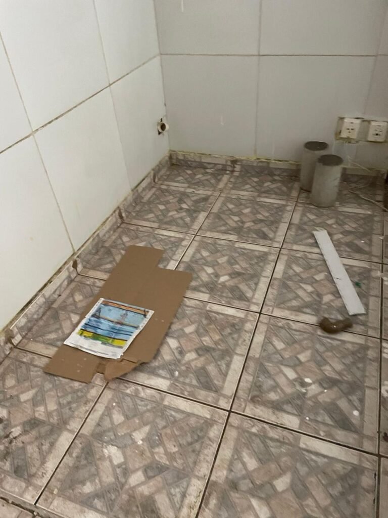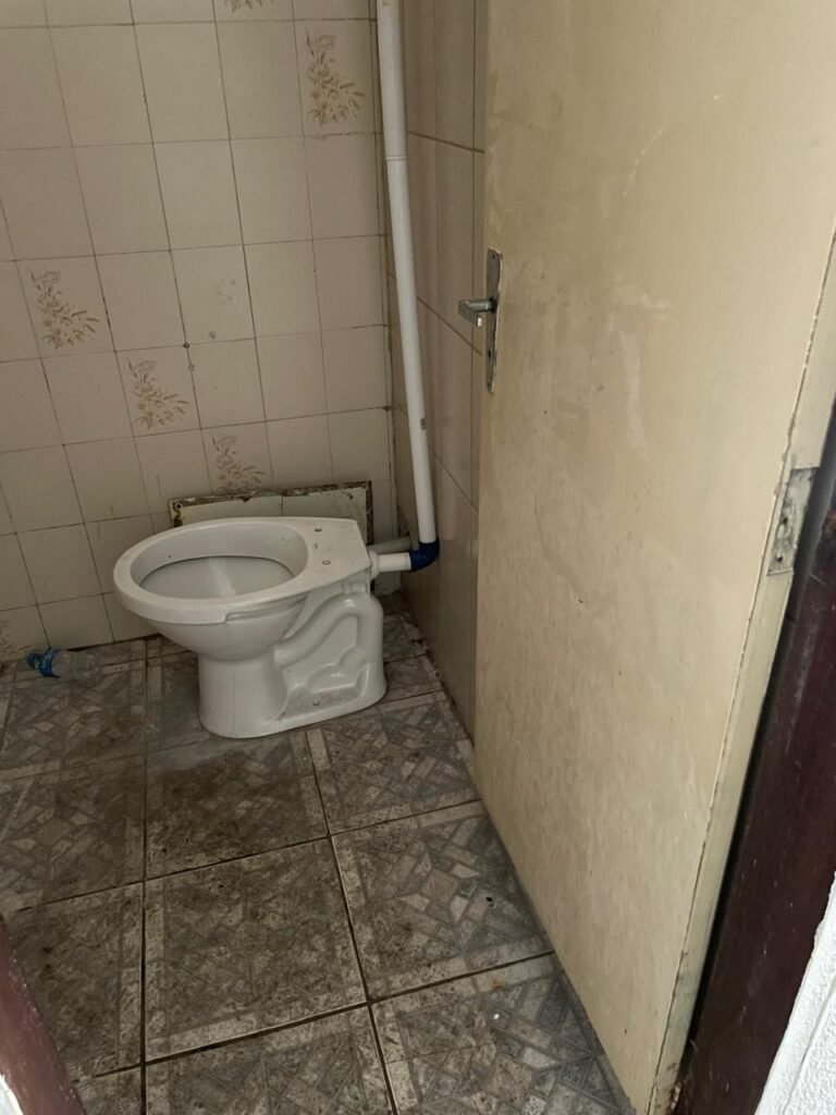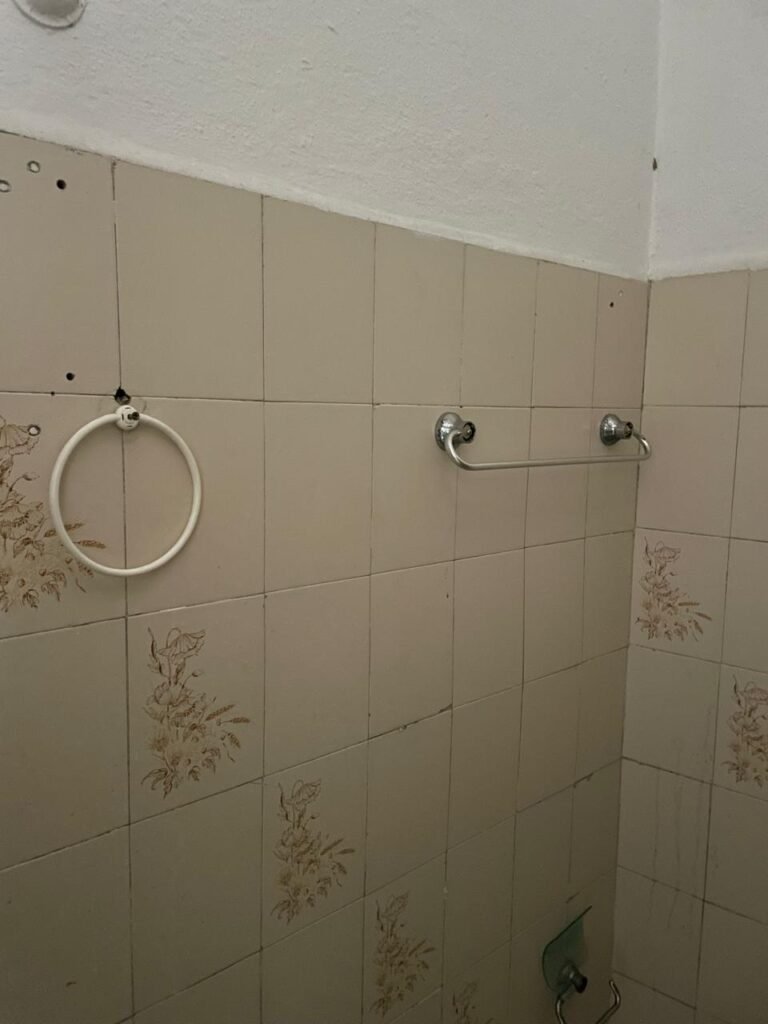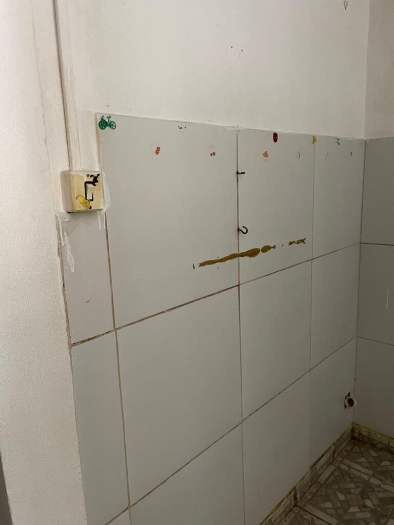 BANHEIRO-: 01 Porta de madeira com pintura creme com desgaste natural, com lascas saindo, com 01 maçaneta de inox, piso revestido de pisos frios cerâmicos com desenhos, com desgaste natural e com manchas de tintas, paredes 1/2 revestida de pisos cerâmicos sendo, 02 paredes com pisos cor creme com desenhos, e 01 parede de pisos frios cerâmicos com pontilhados, restante parede e teto com pintura na cor branco neve com desgaste natural e restante em ordem, 01 vaso sanitário de cerâmica marca Lorenzetti, com 01 caixa de descarga controlada marca Astra, 01 suporte de toalha em inox com desgaste natural, 01 suporte de papel higiênico, 01 suporte de toalha de rosto de plástico cor branco de plástico com 01 parafuso de suporte, 01 pia cerâmica com sifão de pvc, com 01 torneira em inox com desgaste natural, 01 armário com espelho, com desgaste natural e restante em ordem, 01 módulo de energia com 01 interruptor, 01 bocal lâmpada, 01 ralo sem tampa com cano pvc.