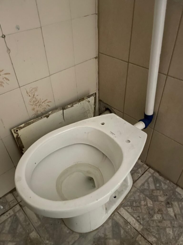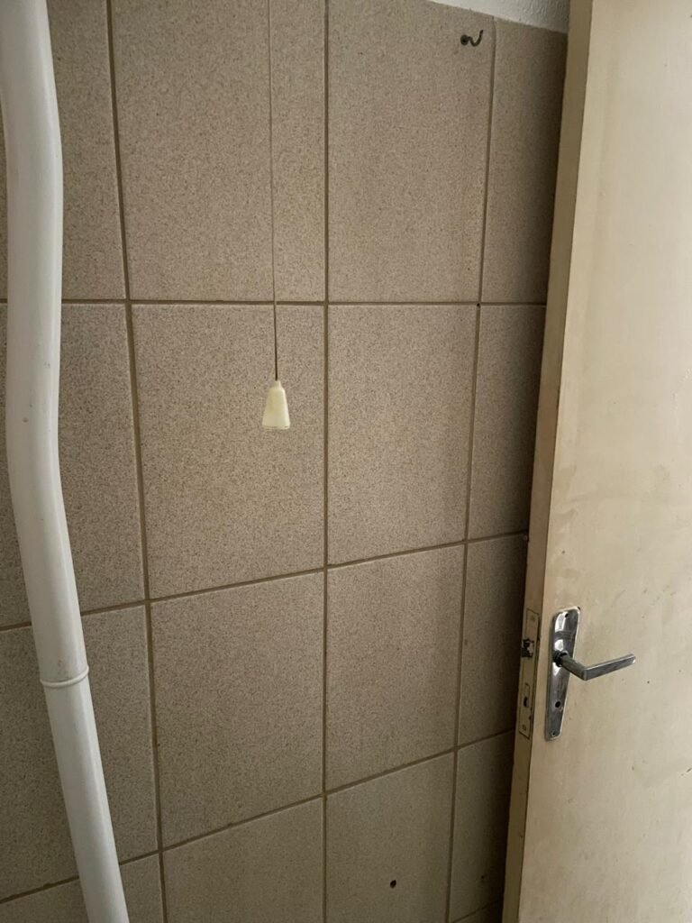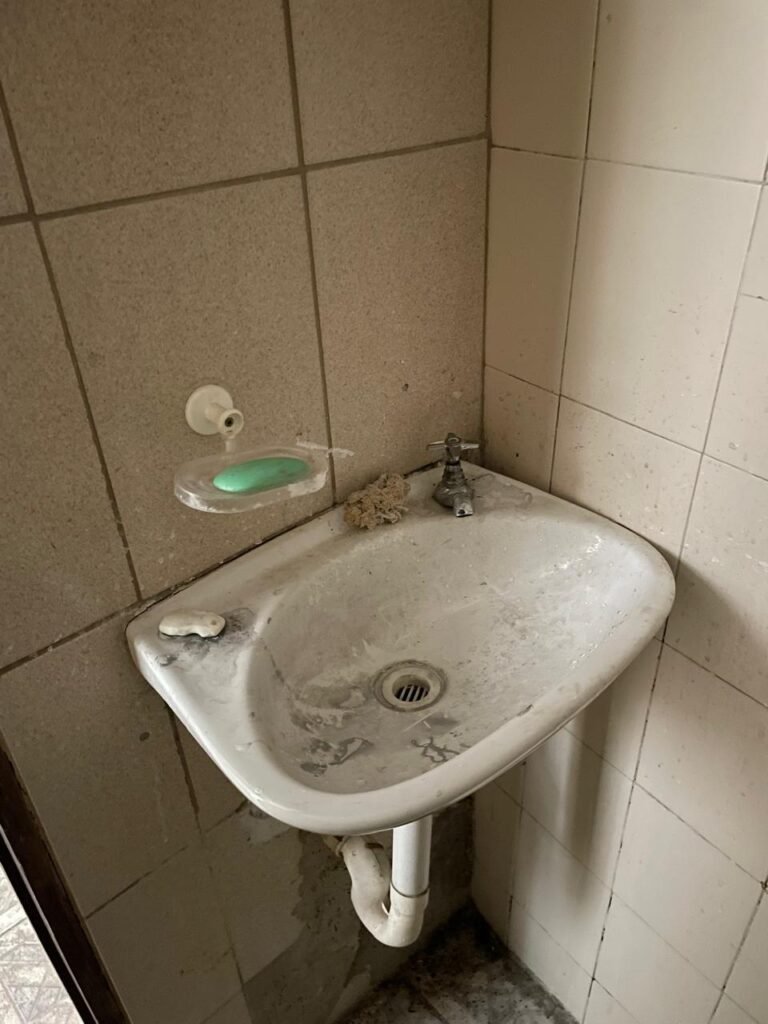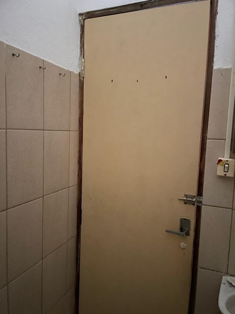 BANHEIRO-: 01 Porta de madeira com pintura creme com desgaste natural, com lascas saindo, com 01 maçaneta de inox, piso revestido de pisos frios cerâmicos com desenhos, com desgaste natural e com manchas de tintas, paredes 1/2 revestida de pisos cerâmicos sendo, 02 paredes com pisos cor creme com desenhos, e 01 parede de pisos frios cerâmicos com pontilhados, restante parede e teto com pintura na cor branco neve com desgaste natural e restante em ordem, 01 vaso sanitário de cerâmica marca Lorenzetti, com 01 caixa de descarga controlada marca Astra, 01 suporte de toalha em inox com desgaste natural, 01 suporte de papel higiênico, 01 suporte de toalha de rosto de plástico cor branco de plástico com 01 parafuso de suporte, 01 pia cerâmica com sifão de pvc, com 01 torneira em inox com desgaste natural, 01 armário com espelho, com desgaste natural e restante em ordem, 01 módulo de energia com 01 interruptor, 01 bocal lâmpada, 01 ralo sem tampa com cano pvc.