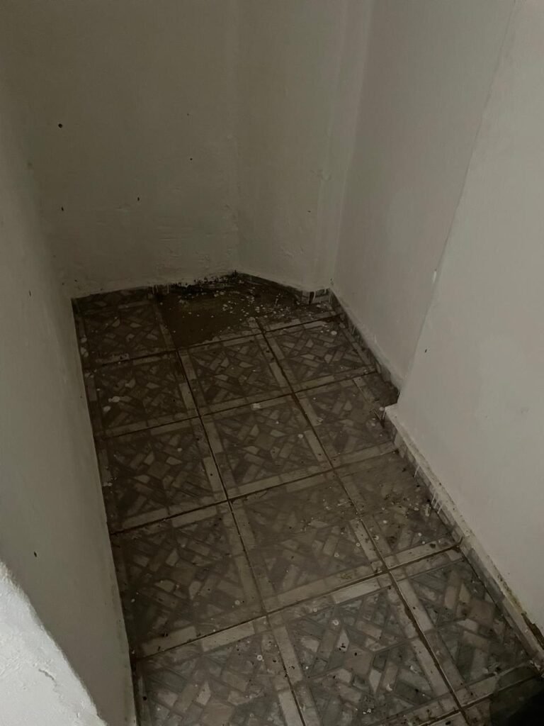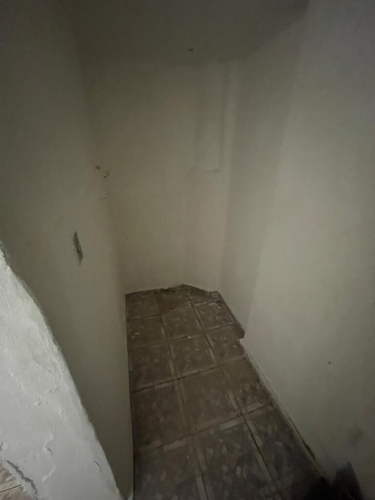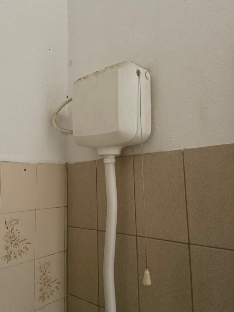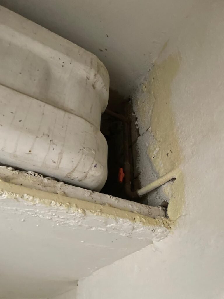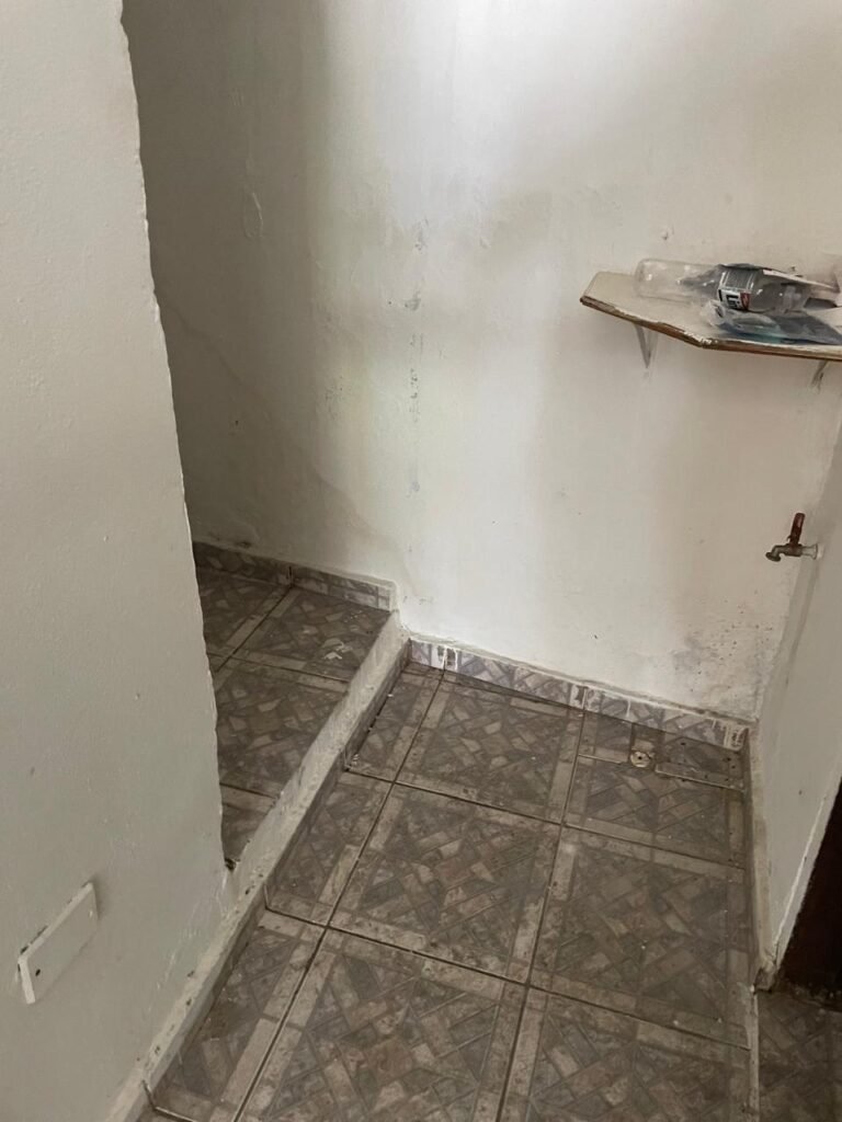 CÔMODO CAIXA DA ÁGUA-: Piso e rodapés revestidos de pisos frios cerâmicos com desenhos, com manchas de tinta e com desgaste natural, paredes e teto com pintura na cor branco neve com desgaste natural, 01 bocal de lâmpada com manchas de tinta, 01 espelho de luz com 01 interruptor, 01 canopla de registro marca Aqua cor laranja, 01 caixa d’água com pintura na cor branco e com sistemas de canos pvc, com 01 canopla marca Aqua cor laranja, 01 quadrado com tela na cor preta, com manchas de tinta cor branco e com base solta.
