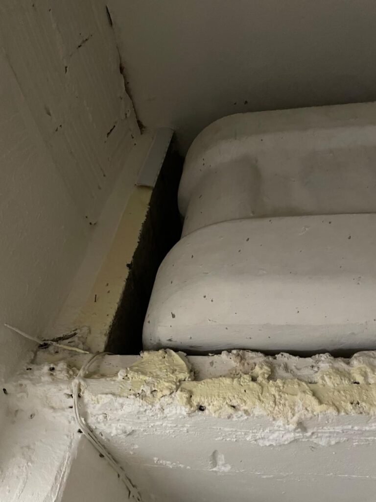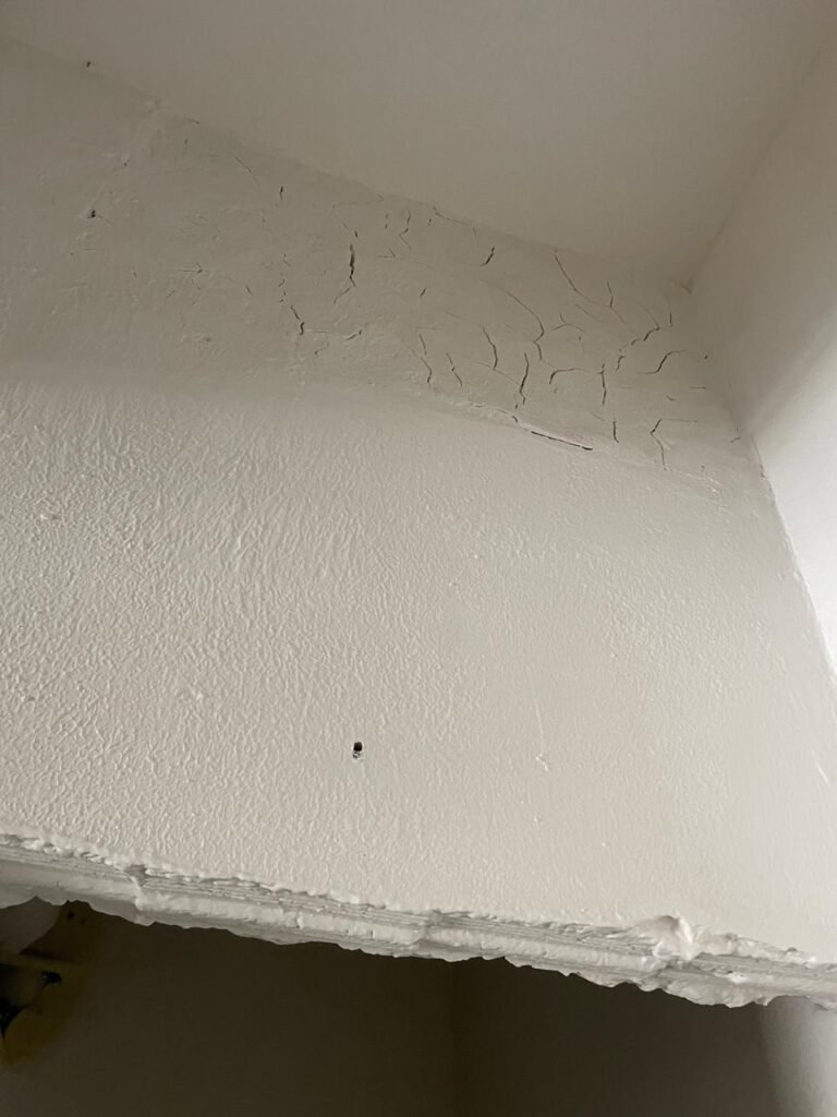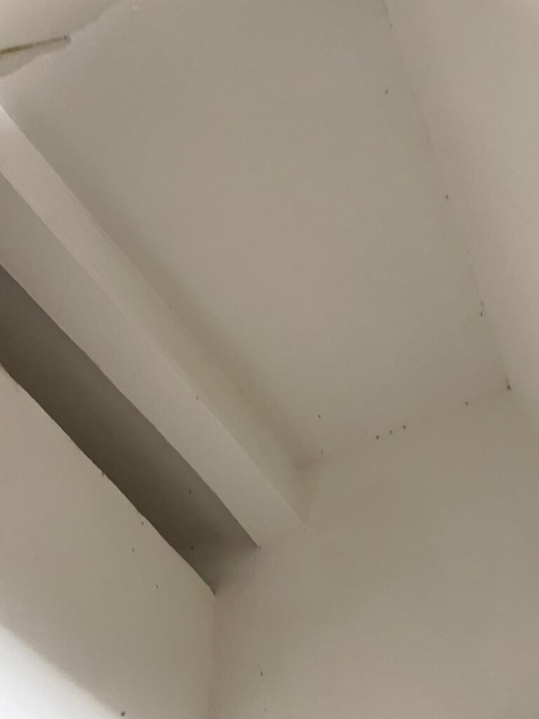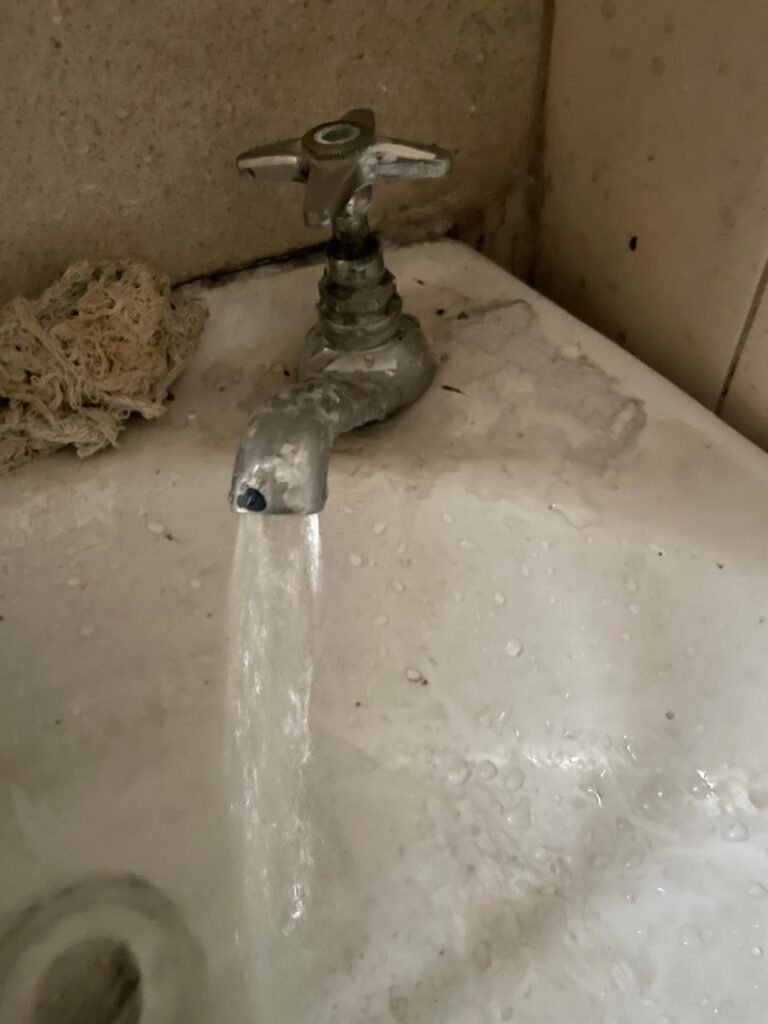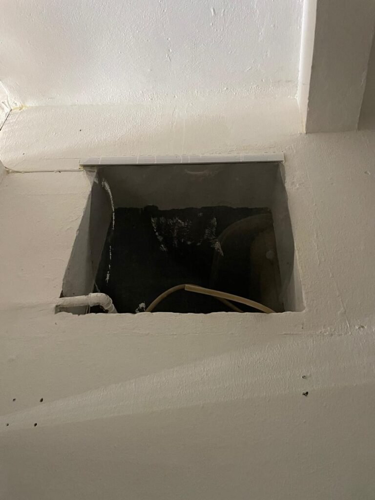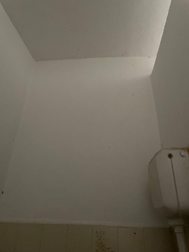 CÔMODO CAIXA DA ÁGUA-: Piso e rodapés revestidos de pisos frios cerâmicos com desenhos, com manchas de tinta e com desgaste natural, paredes e teto com pintura na cor branco neve com desgaste natural, 01 bocal de lâmpada com manchas de tinta, 01 espelho de luz com 01 interruptor, 01 canopla de registro marca Aqua cor laranja, 01 caixa d’água com pintura na cor branco e com sistemas de canos pvc, com 01 canopla marca Aqua cor laranja, 01 quadrado com tela na cor preta, com manchas de tinta cor branco e com base solta.