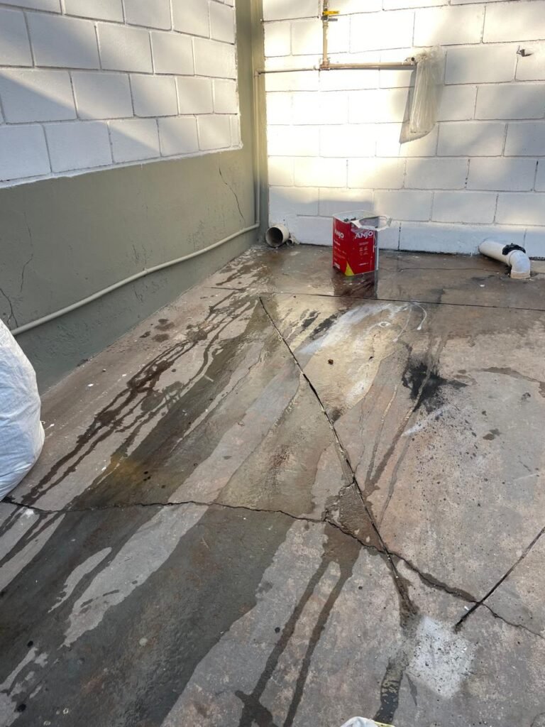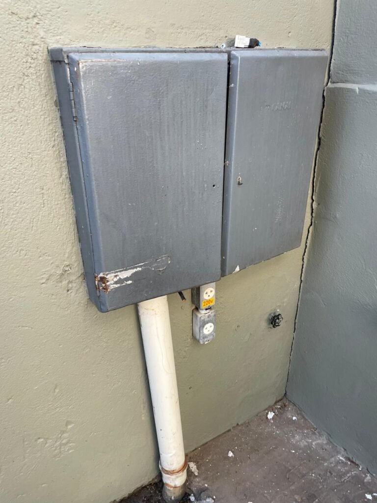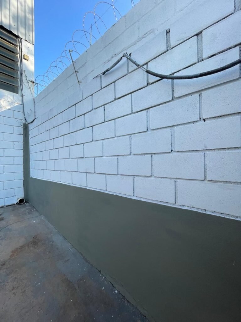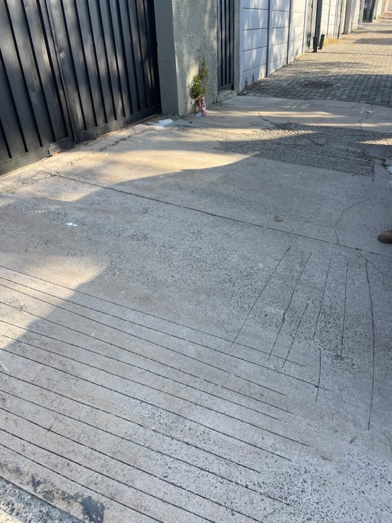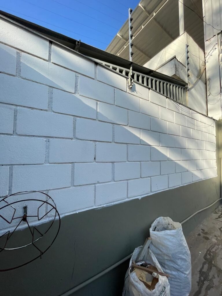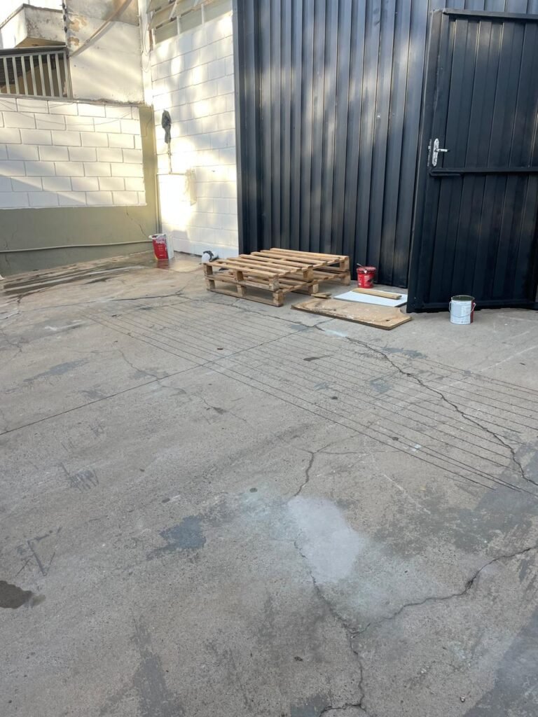 GARAGEM-: Piso de concreto desempenado com rachaduras pela extensão, desgastes naturais, manchas de tinta e restante em ordem, muros laterais com pintura na cor concreto barrada em ordem, restante em blocos de concreto com pintura nova na cor branco neve em ordem, parede com rachadura e restante em ordem, 01 quadro de proteção de medidor elétrico e 01 disjuntor não testado, 02 tantas em ordem e sem puxador, 02 tomadas não testadas (01 110v e 01 220v), 01 canopla de registro em ordem, 01 suporte de ferro para mangueira enferrujado e com manchas de tinta, canos PVC com canopla de registro e pontos de água em ordem, parede do barracão 1/2 em blocos de concreto com pintura nova na cor branco neve em ordem, restante em chapas de telhas galvanizadas com pintura na cor branco em ordem.