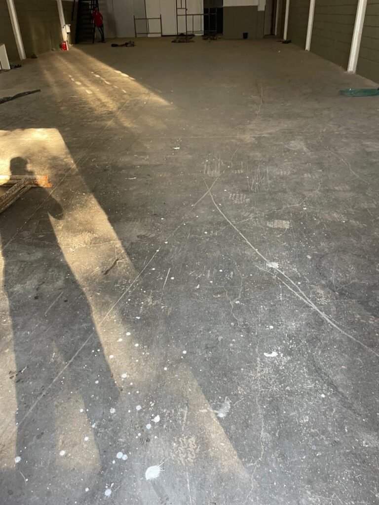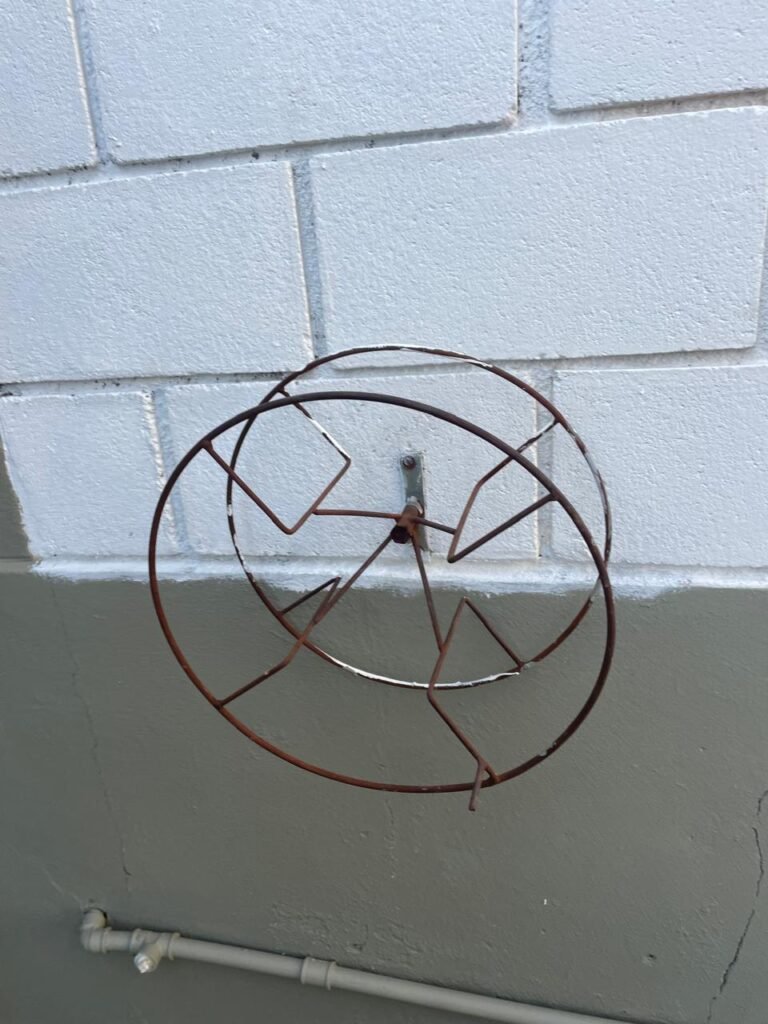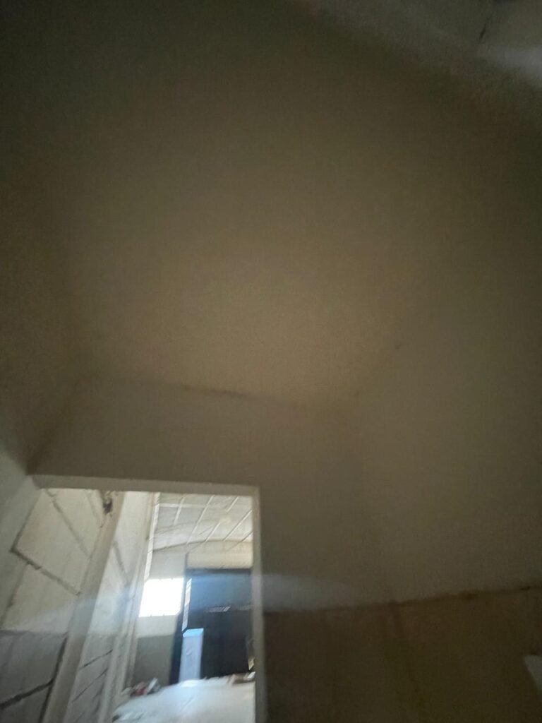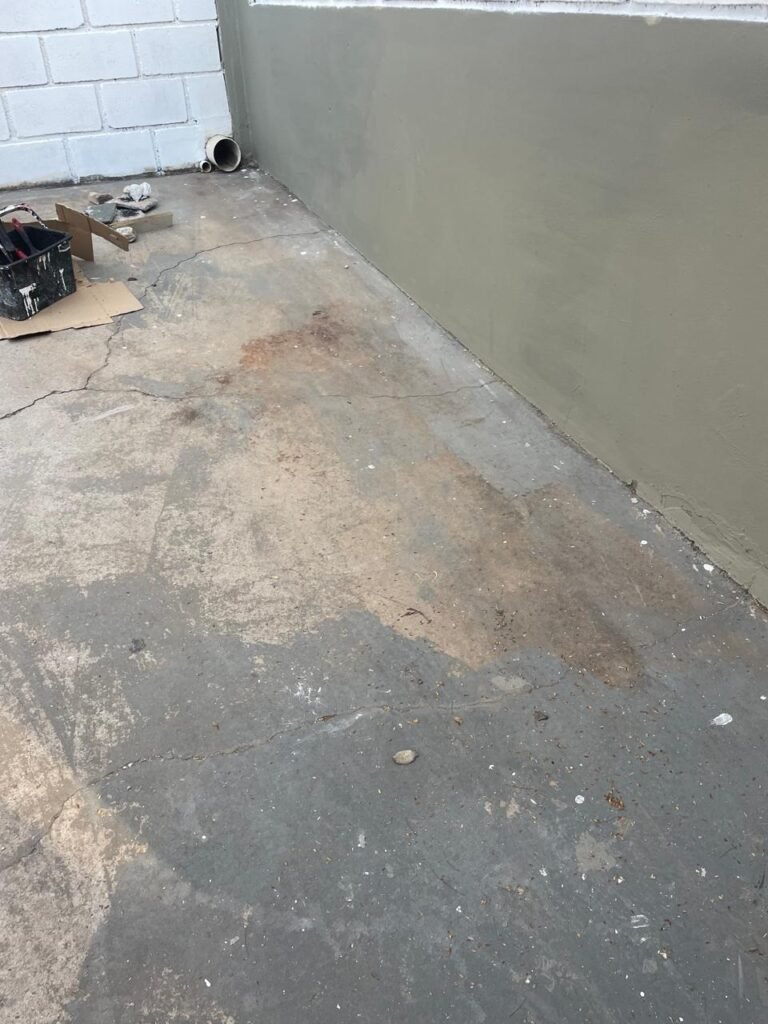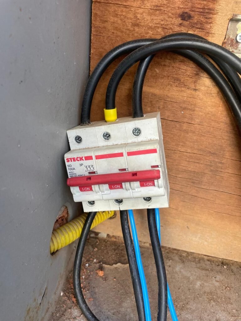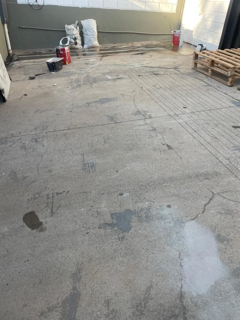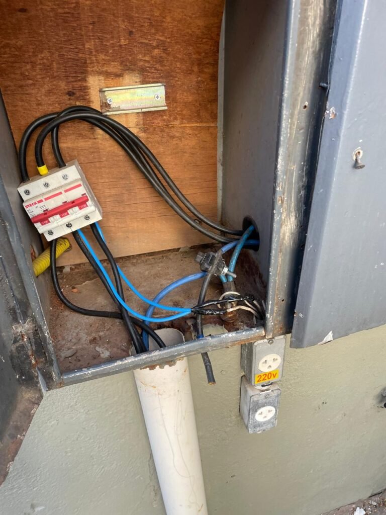 GARAGEM-: Piso de concreto desempenado com rachaduras pela extensão, desgastes naturais, manchas de tinta e restante em ordem, muros laterais com pintura na cor concreto barrada em ordem, restante em blocos de concreto com pintura nova na cor branco neve em ordem, parede com rachadura e restante em ordem, 01 quadro de proteção de medidor elétrico e 01 disjuntor não testado, 02 tantas em ordem e sem puxador, 02 tomadas não testadas (01 110v e 01 220v), 01 canopla de registro em ordem, 01 suporte de ferro para mangueira enferrujado e com manchas de tinta, canos PVC com canopla de registro e pontos de água em ordem, parede do barracão 1/2 em blocos de concreto com pintura nova na cor branco neve em ordem, restante em chapas de telhas galvanizadas com pintura na cor branco em ordem.