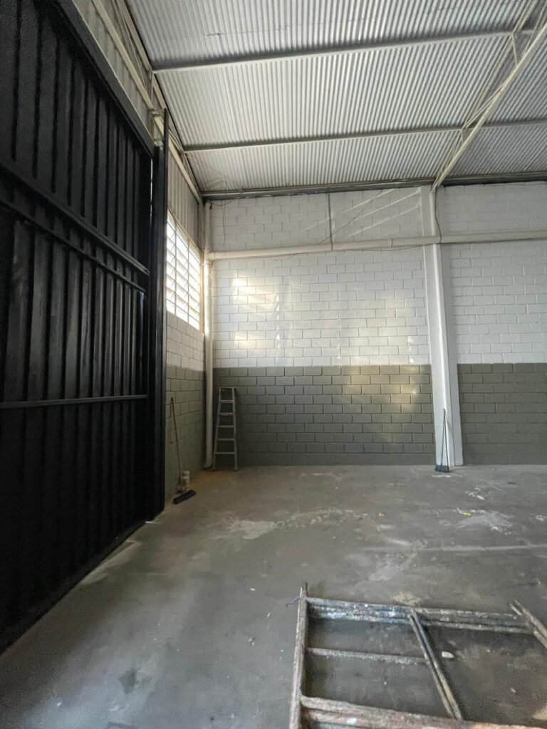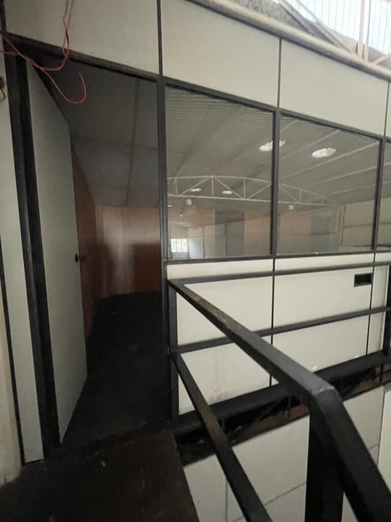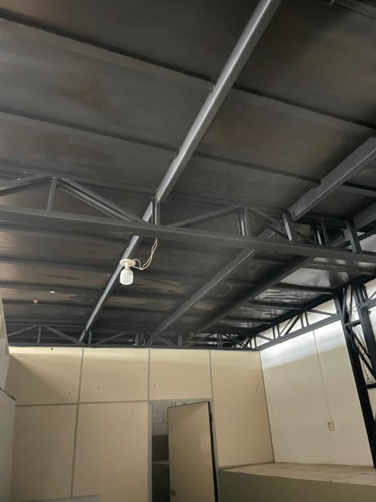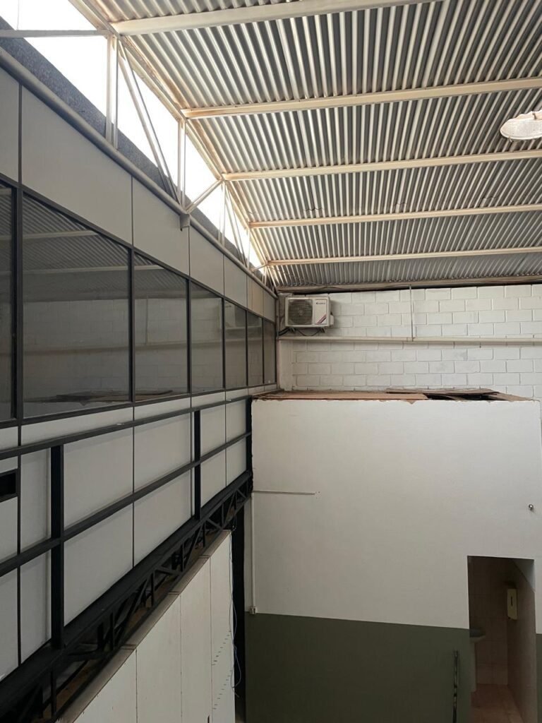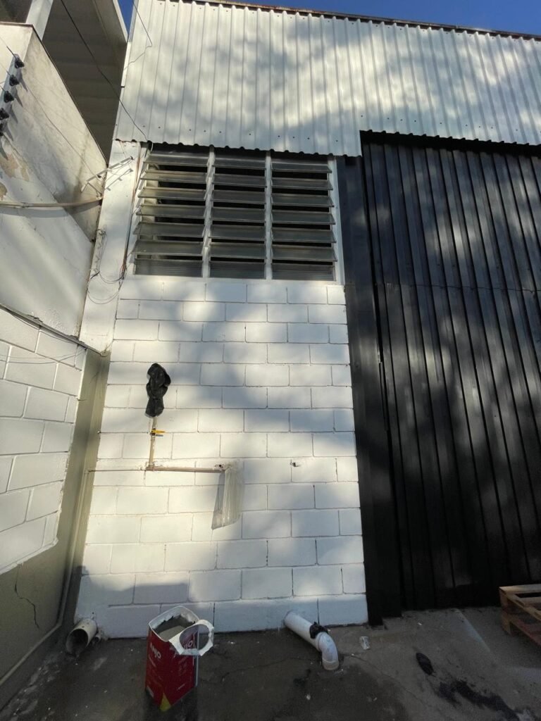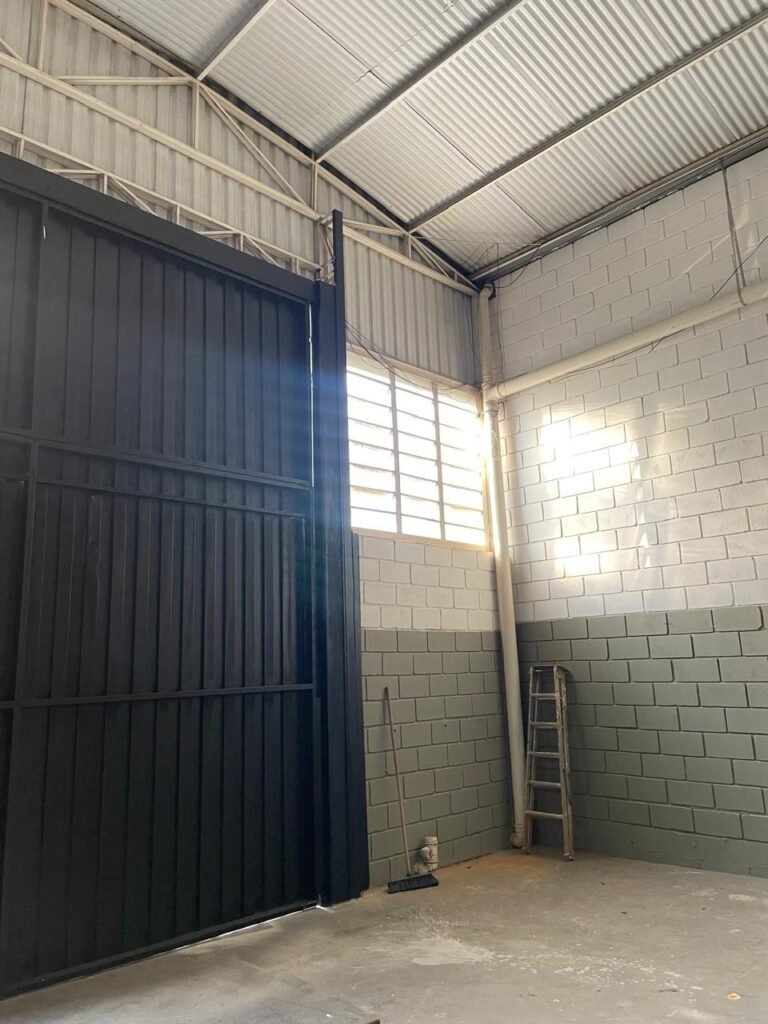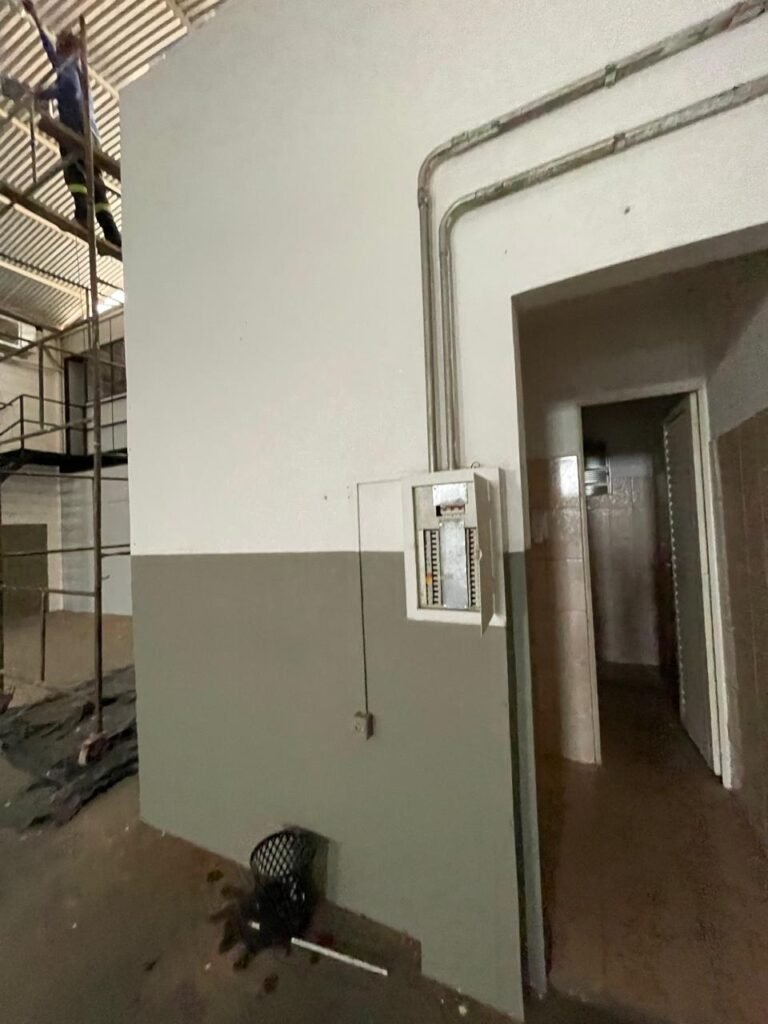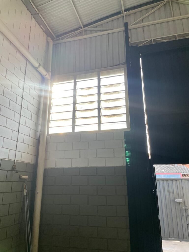 BARRACÃO-: 01 Portão de chapa dobrável de metalon em ordem, com pintura nova na cor preto em ordem, com 02 trincos ferrolhos em ordem, com 01 porta social embutida em ordem, com 01 fechadura ferrolho danificada, com 01 fechadura em inox marca Stam, com chave em ordem e com maçaneta com acabamento manchas de tinta e restante em ordem, piso de concreto usinado com pintura na cor cinza com desgastes naturais, descasques, manchas de tinta pela extensão e restante em ordem, paredes em blocos de concreto com pintura 1/2 na cor concreto nova e em ordem, restante na cor branco neve nova e em ordem, 04 conduletes cegos em ordem, 01 tomada não testada, 01 quadro de distribuição de disjuntores com tampa de ferro de proteção em ordem, disjuntores não testados, 01 escada de ferro em ordem, com corrimões e guarda corpo em ordem e com pintura nova na cor preto em ordem, 02 vitrôs basculantes com esquadrias de ferro em ordem com pintura na cor branco com desgastes naturais, contendo 24 vidros canelados em cada, sendo que em 01 vitrô possui 01 vidro quebrado, estrutura de ferro do telhado com pintura nova na cor branco em ordem, 04 luminárias pendentes com 01 lâmpada LED em cada não testadas, 06 exaustores de ar em ordem, telhado em telhas galvanizadas com pintura na cor branco em ordem, 02 condensadores em ordem.