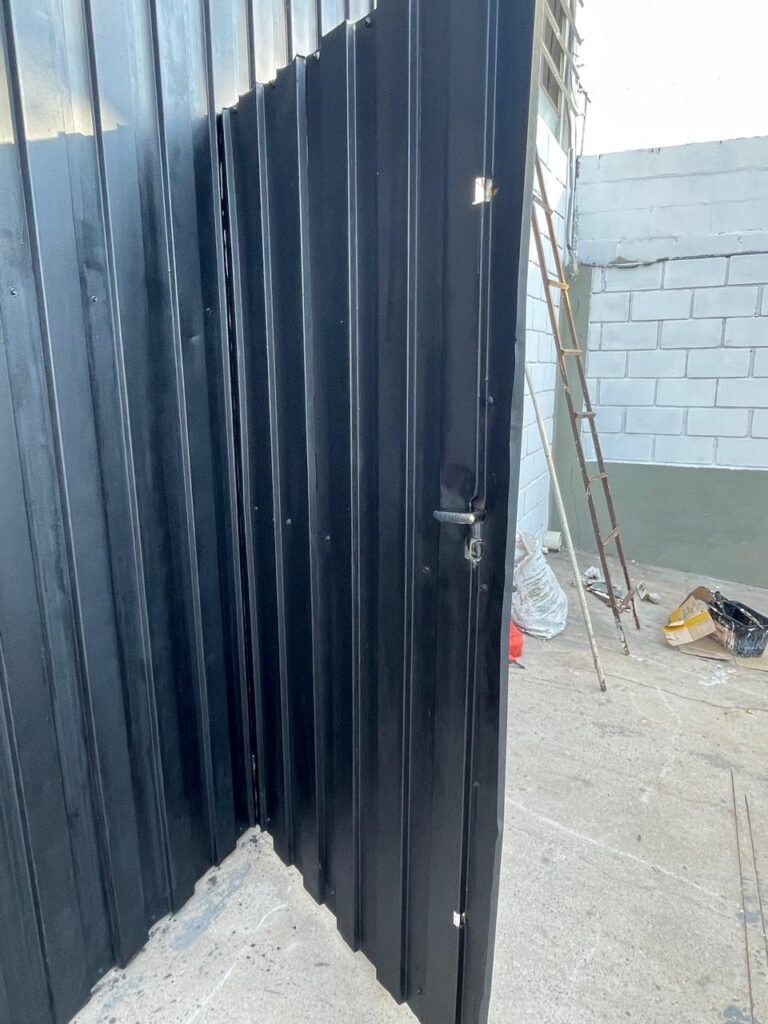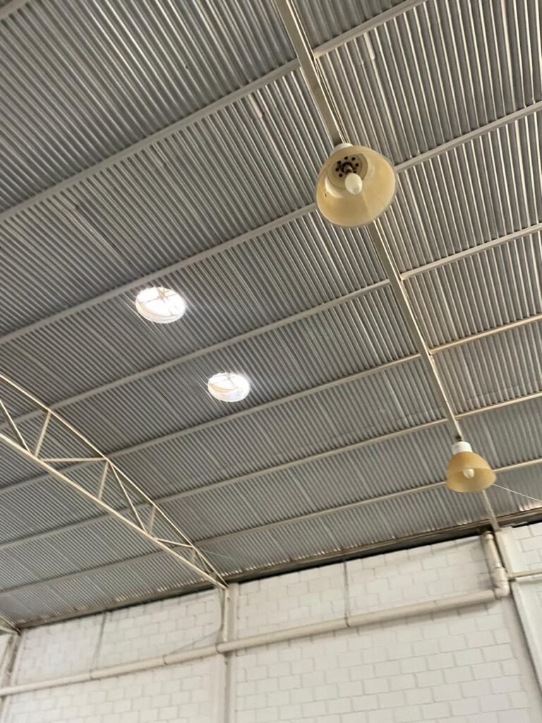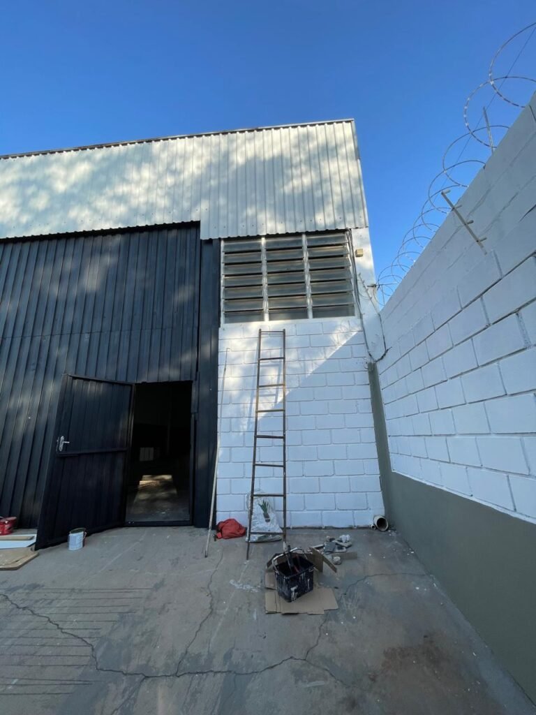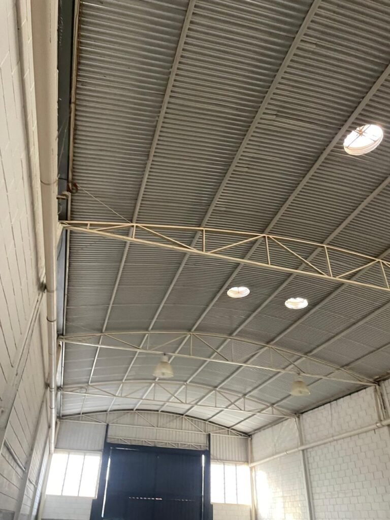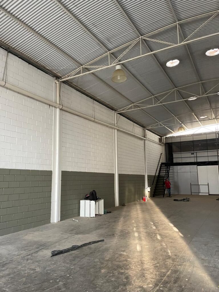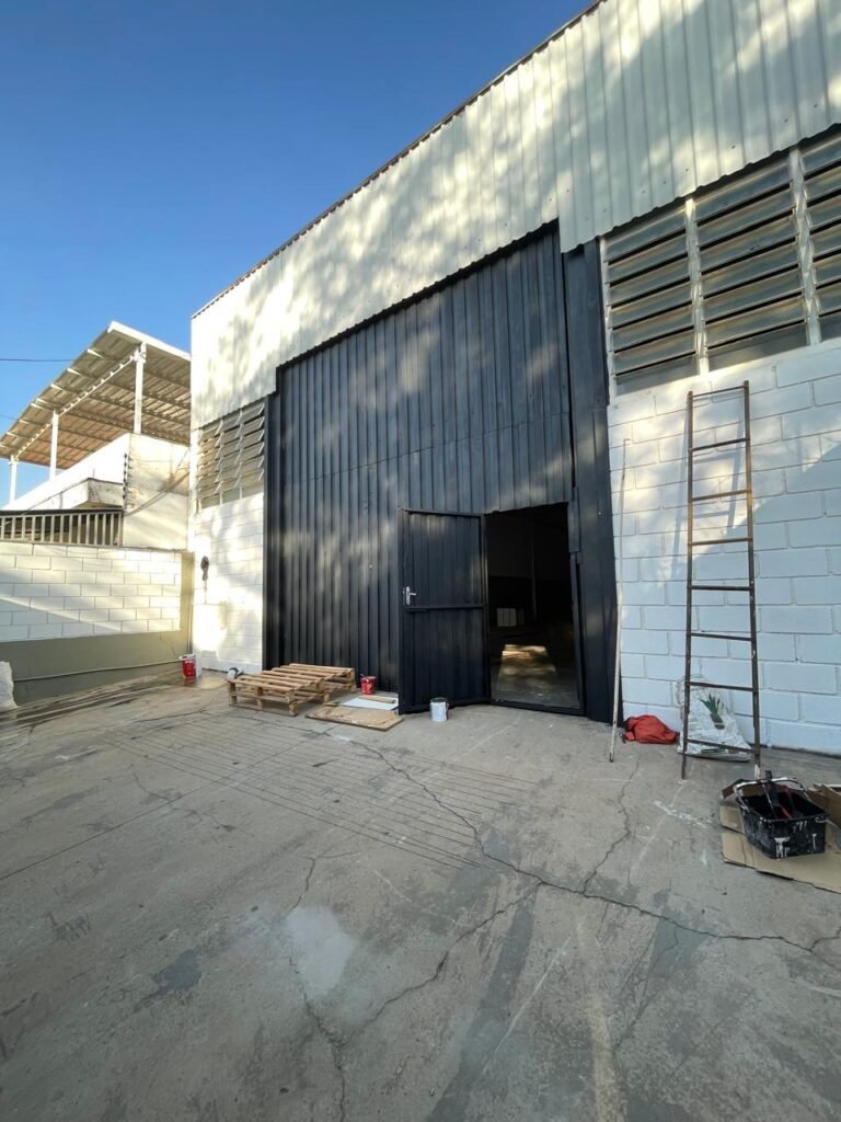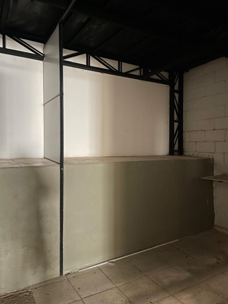 BARRACÃO-: 01 Portão de chapa dobrável de metalon em ordem, com pintura nova na cor preto em ordem, com 02 trincos ferrolhos em ordem, com 01 porta social embutida em ordem, com 01 fechadura ferrolho danificada, com 01 fechadura em inox marca Stam, com chave em ordem e com maçaneta com acabamento manchas de tinta e restante em ordem, piso de concreto usinado com pintura na cor cinza com desgastes naturais, descasques, manchas de tinta pela extensão e restante em ordem, paredes em blocos de concreto com pintura 1/2 na cor concreto nova e em ordem, restante na cor branco neve nova e em ordem, 04 conduletes cegos em ordem, 01 tomada não testada, 01 quadro de distribuição de disjuntores com tampa de ferro de proteção em ordem, disjuntores não testados, 01 escada de ferro em ordem, com corrimões e guarda corpo em ordem e com pintura nova na cor preto em ordem, 02 vitrôs basculantes com esquadrias de ferro em ordem com pintura na cor branco com desgastes naturais, contendo 24 vidros canelados em cada, sendo que em 01 vitrô possui 01 vidro quebrado, estrutura de ferro do telhado com pintura nova na cor branco em ordem, 04 luminárias pendentes com 01 lâmpada LED em cada não testadas, 06 exaustores de ar em ordem, telhado em telhas galvanizadas com pintura na cor branco em ordem, 02 condensadores em ordem.