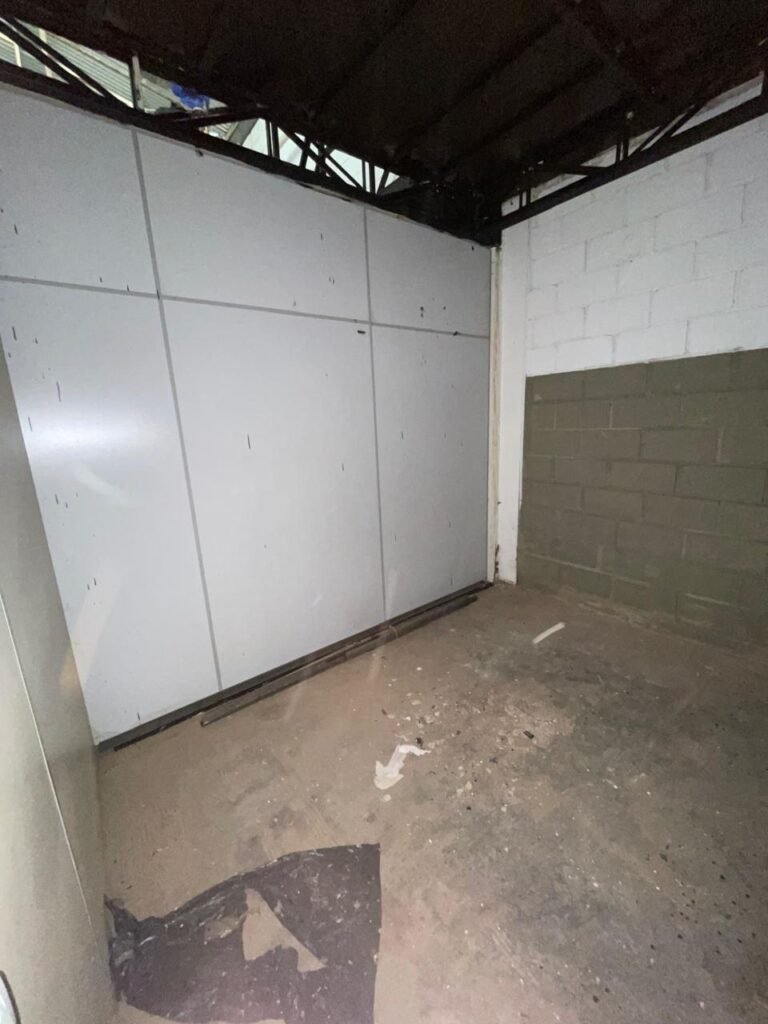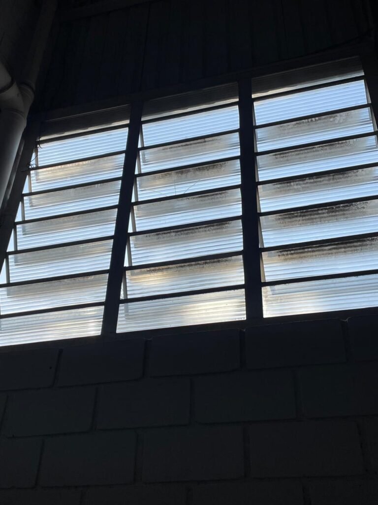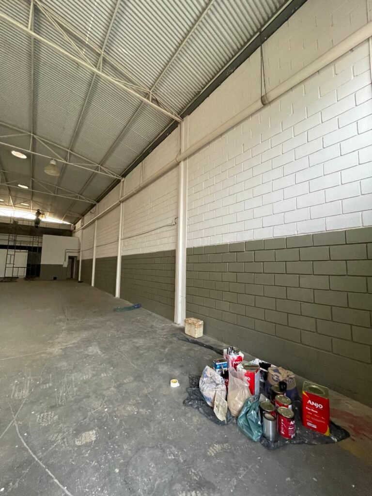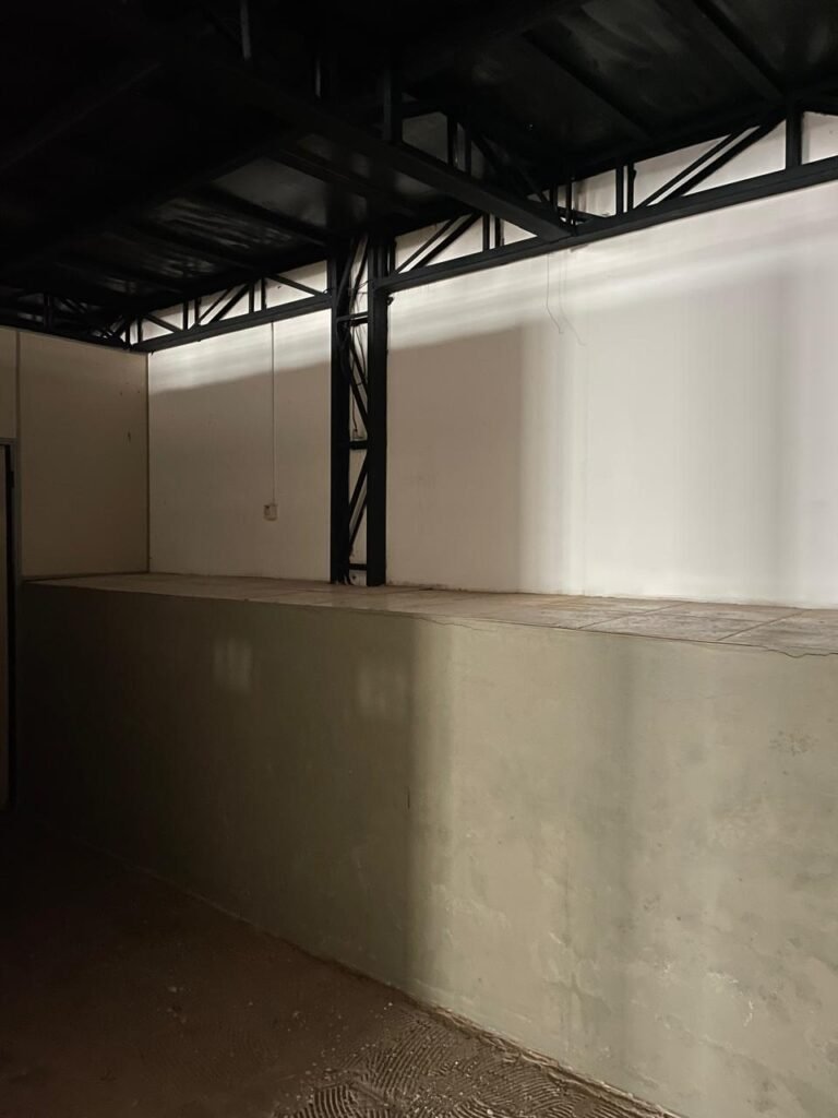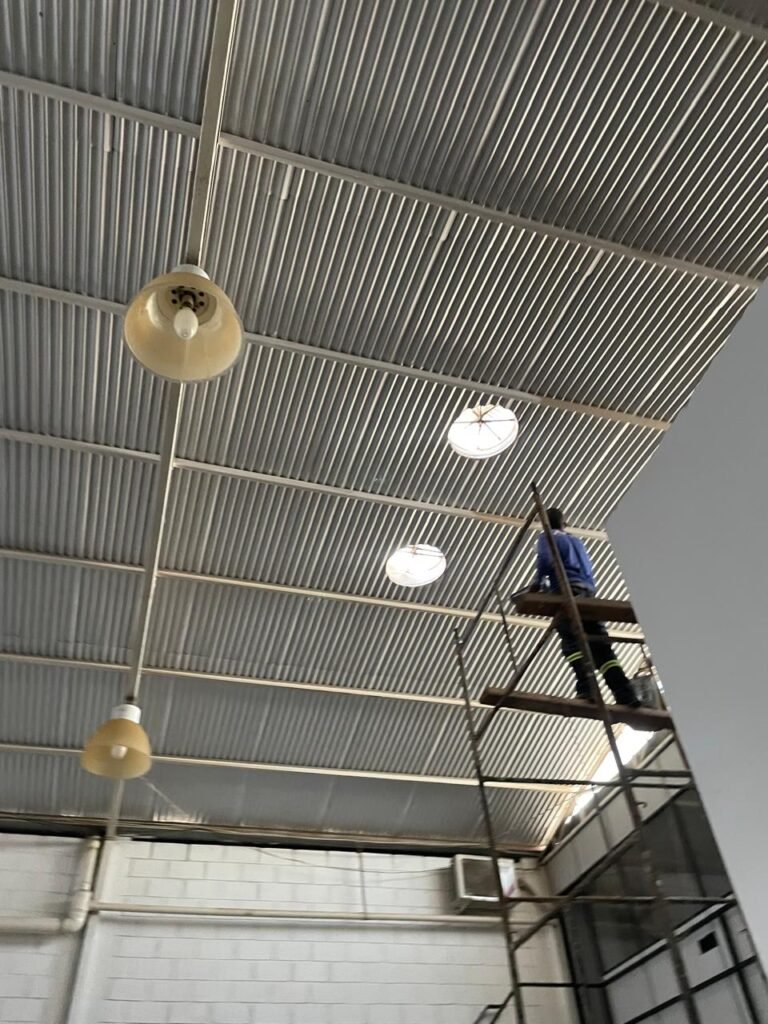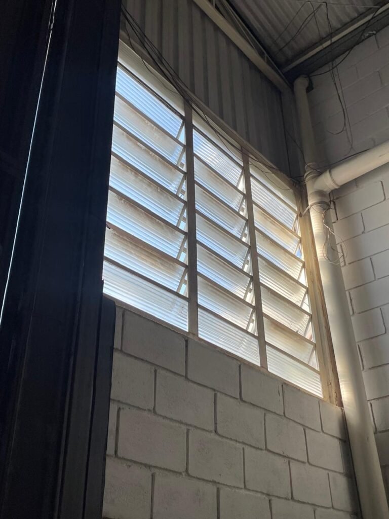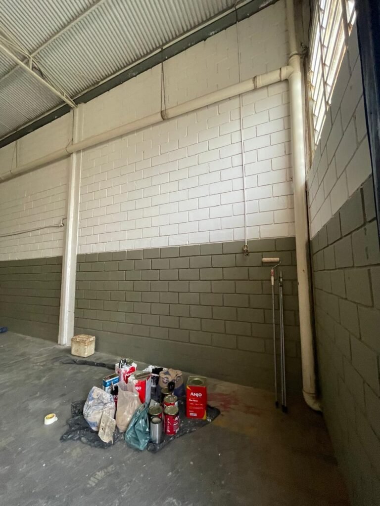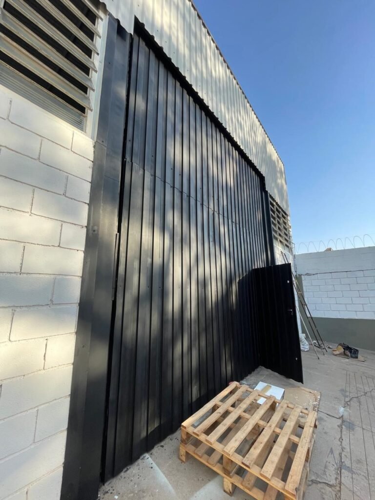 BARRACÃO-: 01 Portão de chapa dobrável de metalon em ordem, com pintura nova na cor preto em ordem, com 02 trincos ferrolhos em ordem, com 01 porta social embutida em ordem, com 01 fechadura ferrolho danificada, com 01 fechadura em inox marca Stam, com chave em ordem e com maçaneta com acabamento manchas de tinta e restante em ordem, piso de concreto usinado com pintura na cor cinza com desgastes naturais, descasques, manchas de tinta pela extensão e restante em ordem, paredes em blocos de concreto com pintura 1/2 na cor concreto nova e em ordem, restante na cor branco neve nova e em ordem, 04 conduletes cegos em ordem, 01 tomada não testada, 01 quadro de distribuição de disjuntores com tampa de ferro de proteção em ordem, disjuntores não testados, 01 escada de ferro em ordem, com corrimões e guarda corpo em ordem e com pintura nova na cor preto em ordem, 02 vitrôs basculantes com esquadrias de ferro em ordem com pintura na cor branco com desgastes naturais, contendo 24 vidros canelados em cada, sendo que em 01 vitrô possui 01 vidro quebrado, estrutura de ferro do telhado com pintura nova na cor branco em ordem, 04 luminárias pendentes com 01 lâmpada LED em cada não testadas, 06 exaustores de ar em ordem, telhado em telhas galvanizadas com pintura na cor branco em ordem, 02 condensadores em ordem.