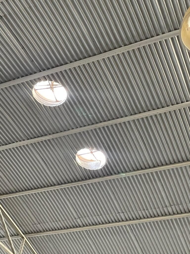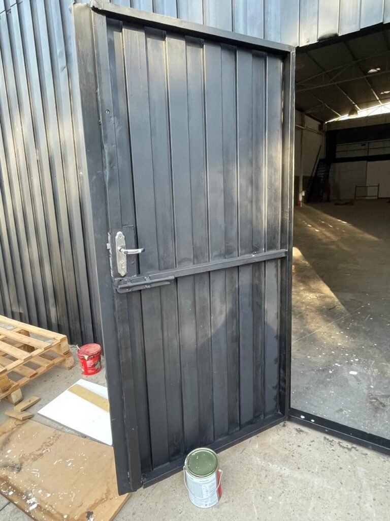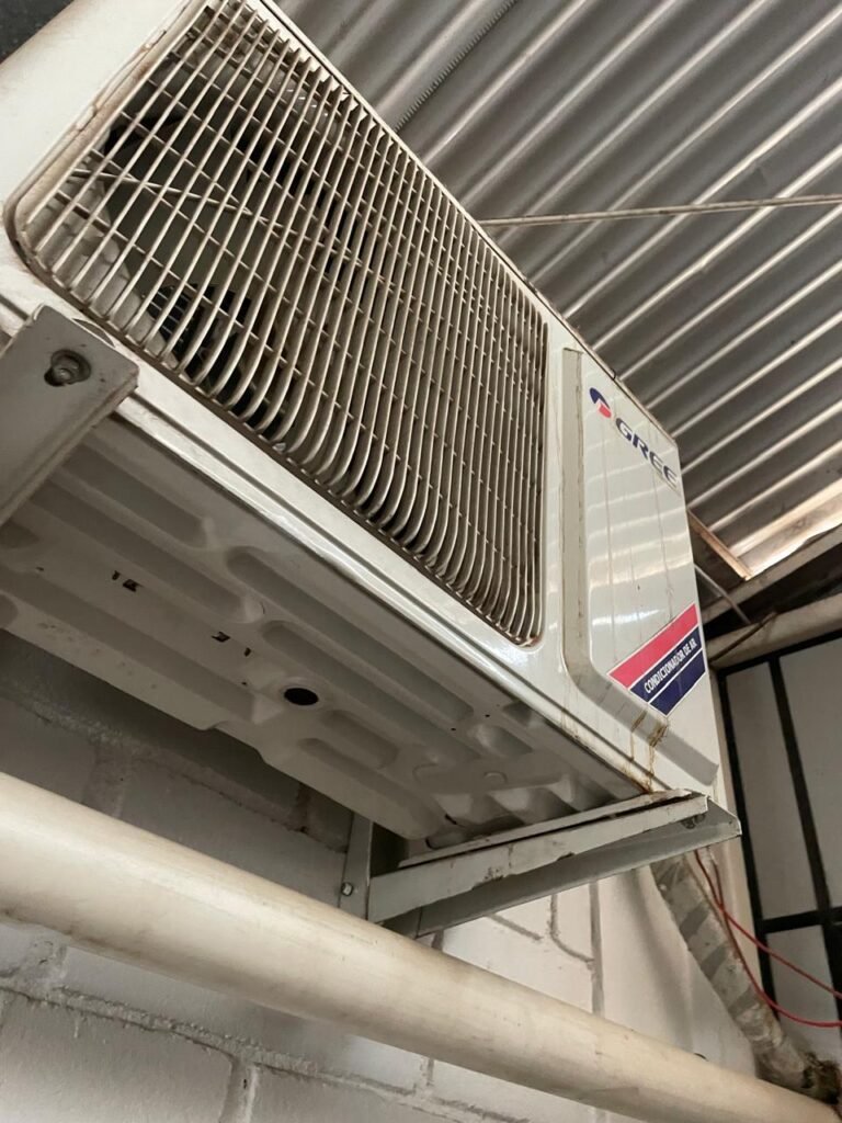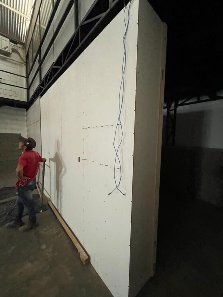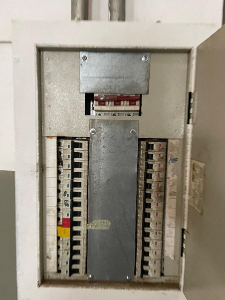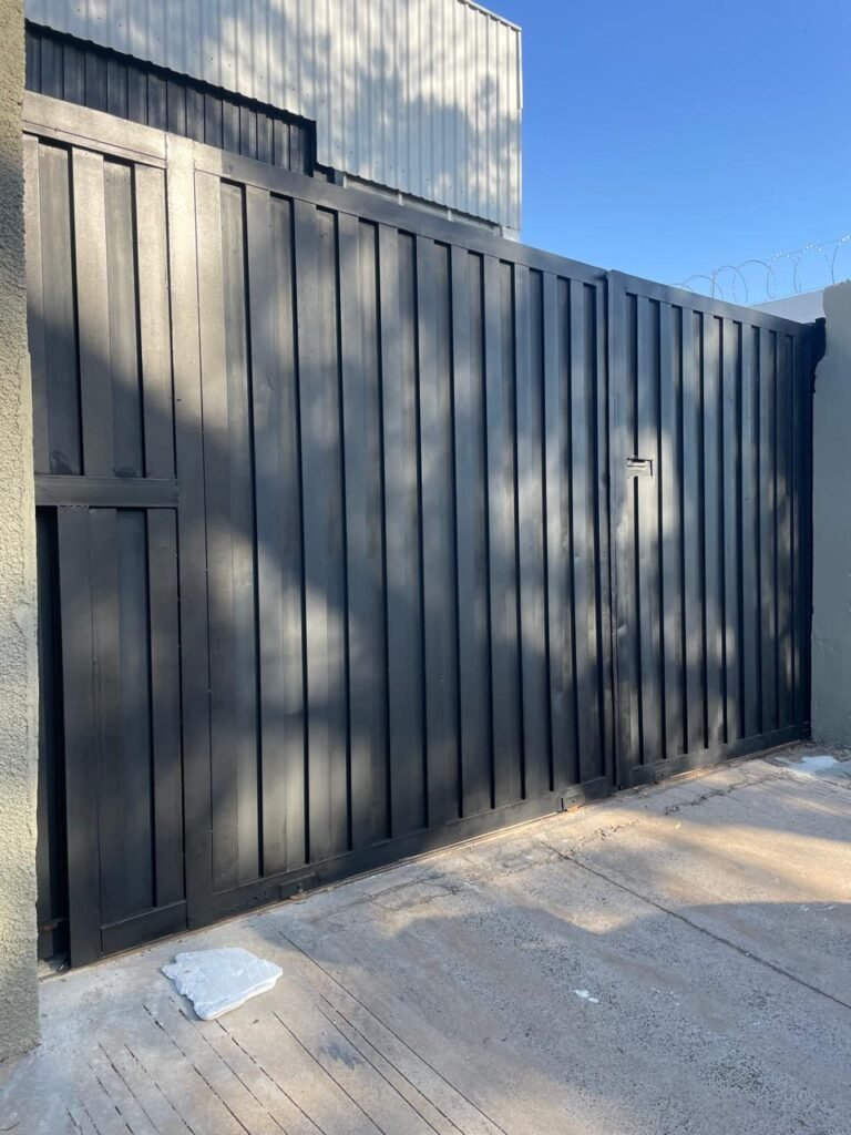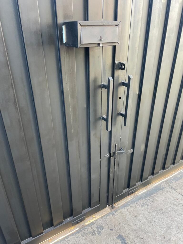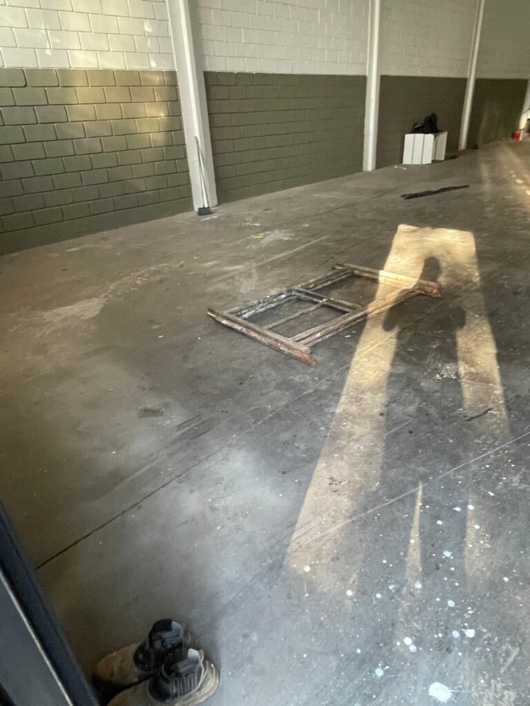 BARRACÃO-: 01 Portão de chapa dobrável de metalon em ordem, com pintura nova na cor preto em ordem, com 02 trincos ferrolhos em ordem, com 01 porta social embutida em ordem, com 01 fechadura ferrolho danificada, com 01 fechadura em inox marca Stam, com chave em ordem e com maçaneta com acabamento manchas de tinta e restante em ordem, piso de concreto usinado com pintura na cor cinza com desgastes naturais, descasques, manchas de tinta pela extensão e restante em ordem, paredes em blocos de concreto com pintura 1/2 na cor concreto nova e em ordem, restante na cor branco neve nova e em ordem, 04 conduletes cegos em ordem, 01 tomada não testada, 01 quadro de distribuição de disjuntores com tampa de ferro de proteção em ordem, disjuntores não testados, 01 escada de ferro em ordem, com corrimões e guarda corpo em ordem e com pintura nova na cor preto em ordem, 02 vitrôs basculantes com esquadrias de ferro em ordem com pintura na cor branco com desgastes naturais, contendo 24 vidros canelados em cada, sendo que em 01 vitrô possui 01 vidro quebrado, estrutura de ferro do telhado com pintura nova na cor branco em ordem, 04 luminárias pendentes com 01 lâmpada LED em cada não testadas, 06 exaustores de ar em ordem, telhado em telhas galvanizadas com pintura na cor branco em ordem, 02 condensadores em ordem.