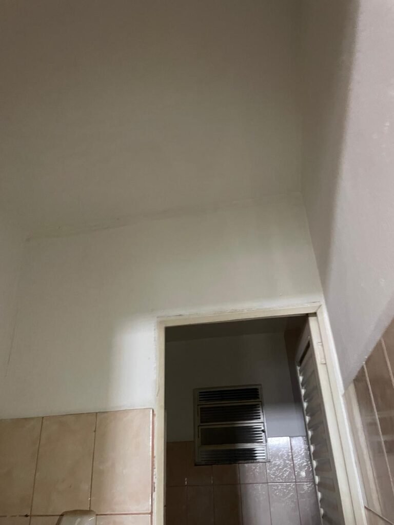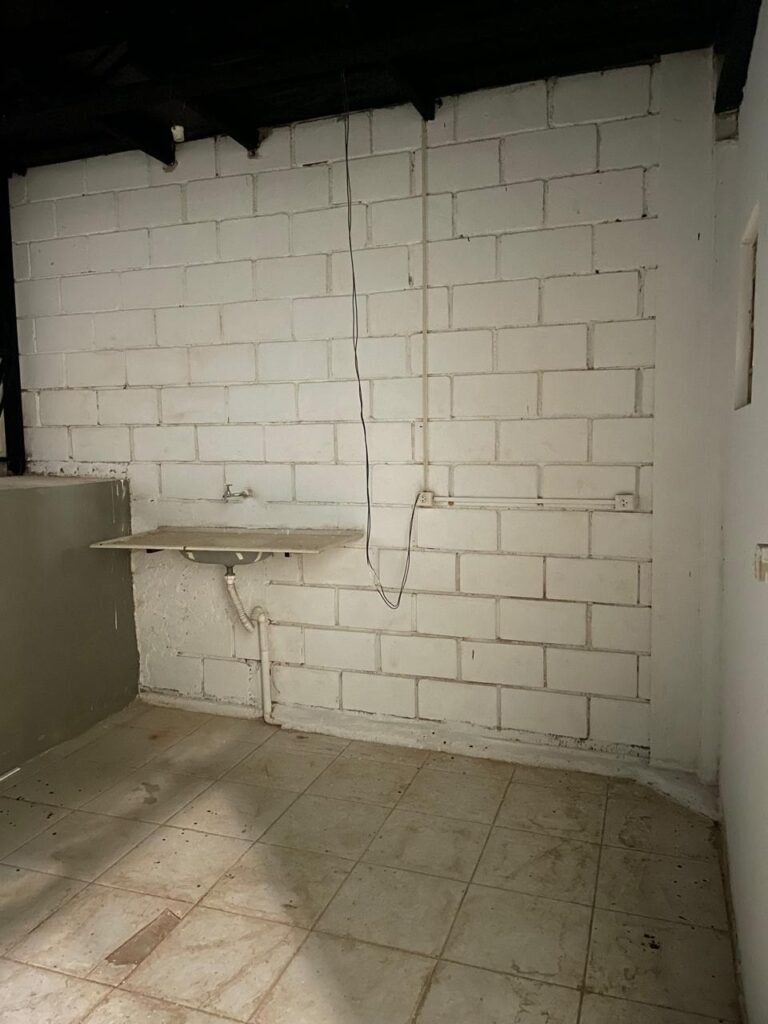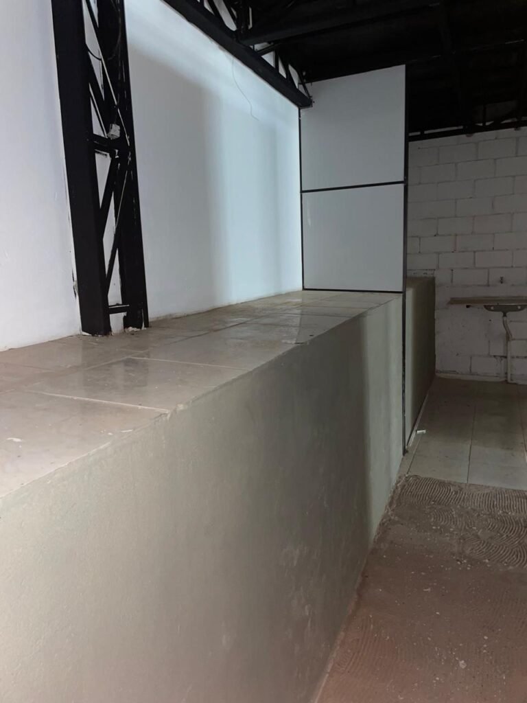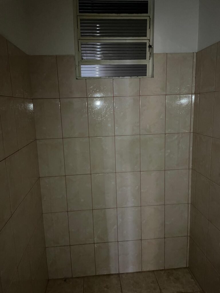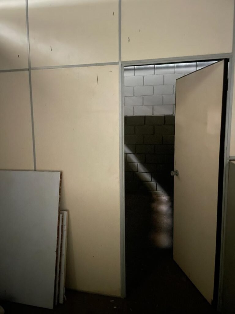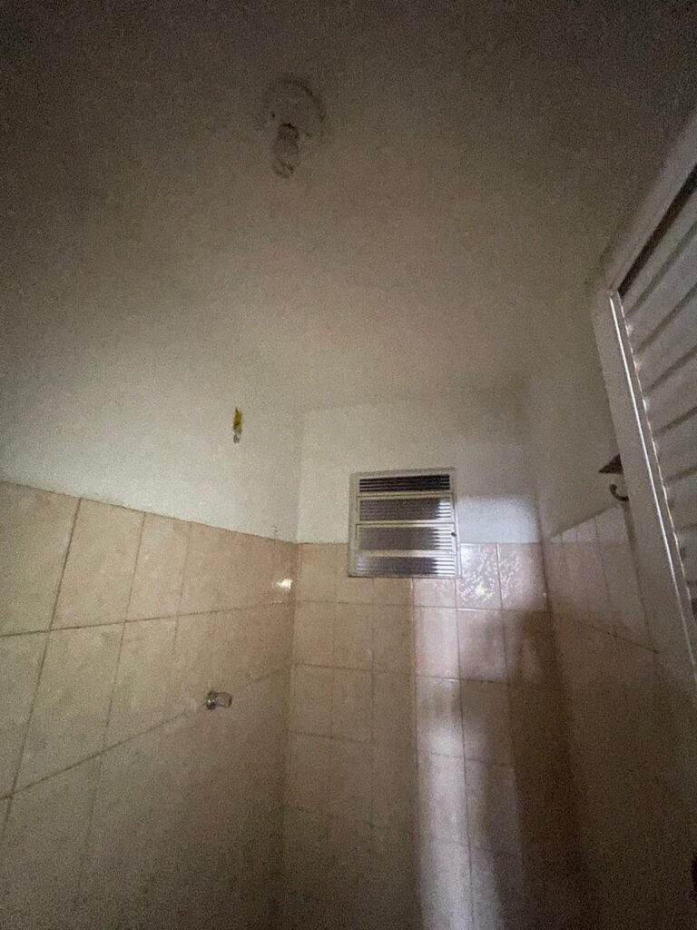 FUNDOS-: 01 Armário com prateleiras de mdf na cor branco em ordem, 02 divisórias navais com desgastes naturais e restante em ordem, piso com parte revestida em frio cerâmico com desgastes naturais, partes trincadas, parte faltando piso, 01 balcão de alvenaria com pintura nova na cor concreto em ordem e revestida de pisos cerâmicos com desgastes naturais, 01 pia de cerâmica com desgastes naturais e com partes trincada, 01 torneira de inox com manchas de tinta não testada, sifão sanfonado não testado, 03 tomadas não testadas, 03 interruptores não testado, 02 lâmpadas não testadas e 01 bocal sem lâmpada, 01 porta de divisória naval em ordem, com 01 maçaneta em ordem, com tranca embutida e sem chave, paredes com pintura barrada na cor concreto nova e em ordem, restante com pintura na cor branco neve nova e em ordem, teto com estrutura de ferro com pintura nova na cor preto em ordem.