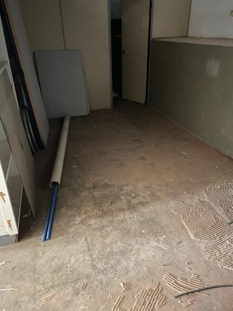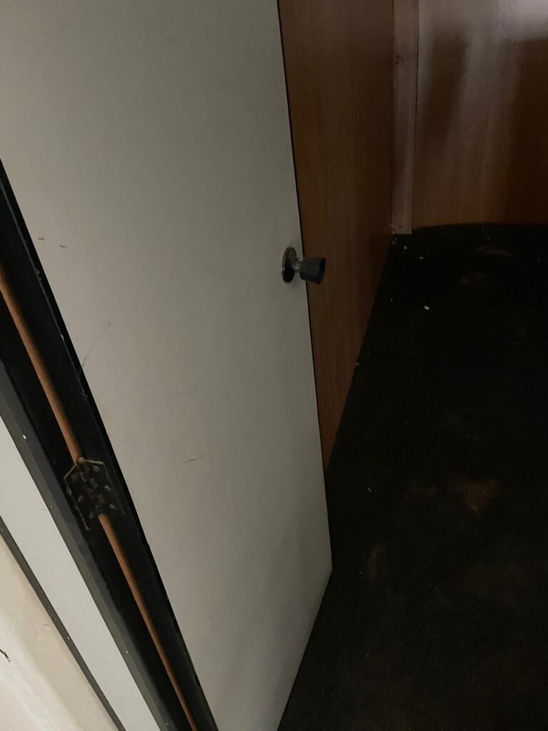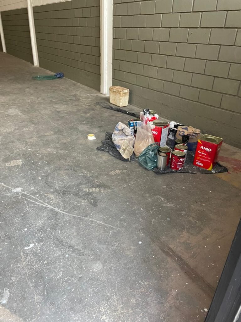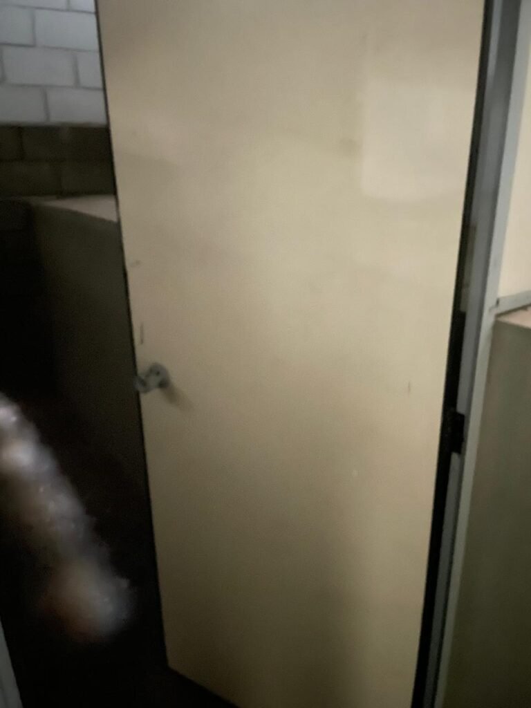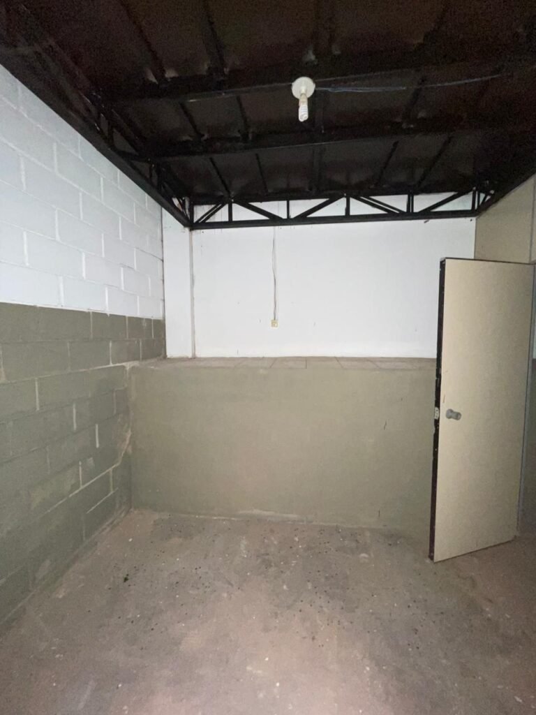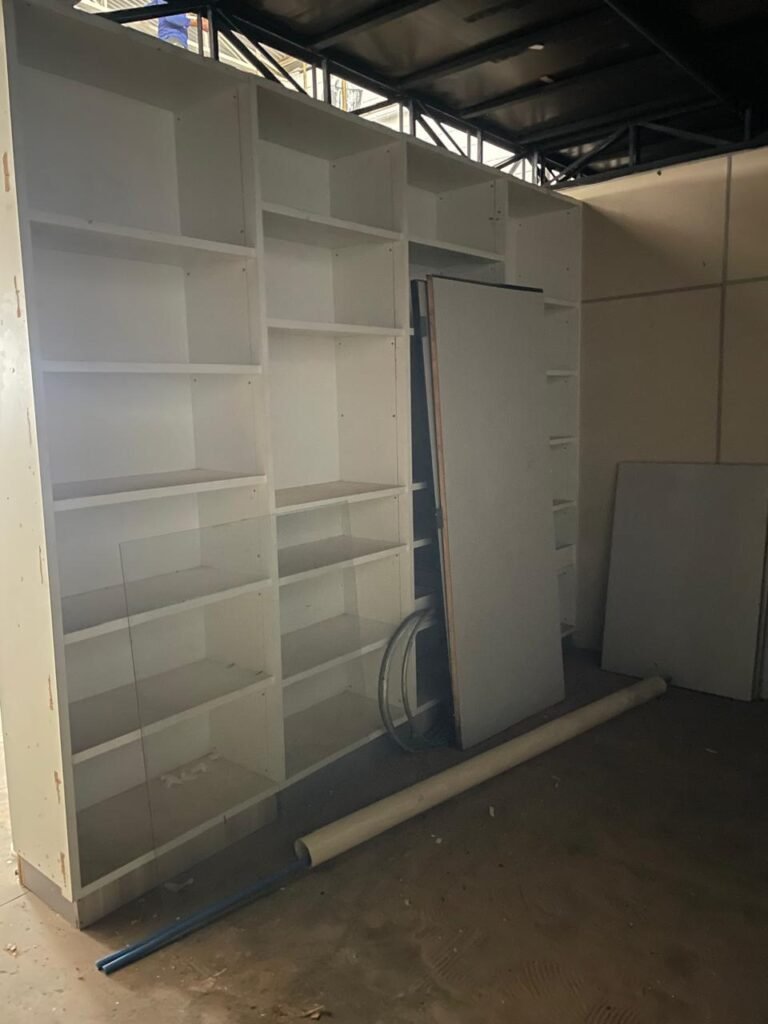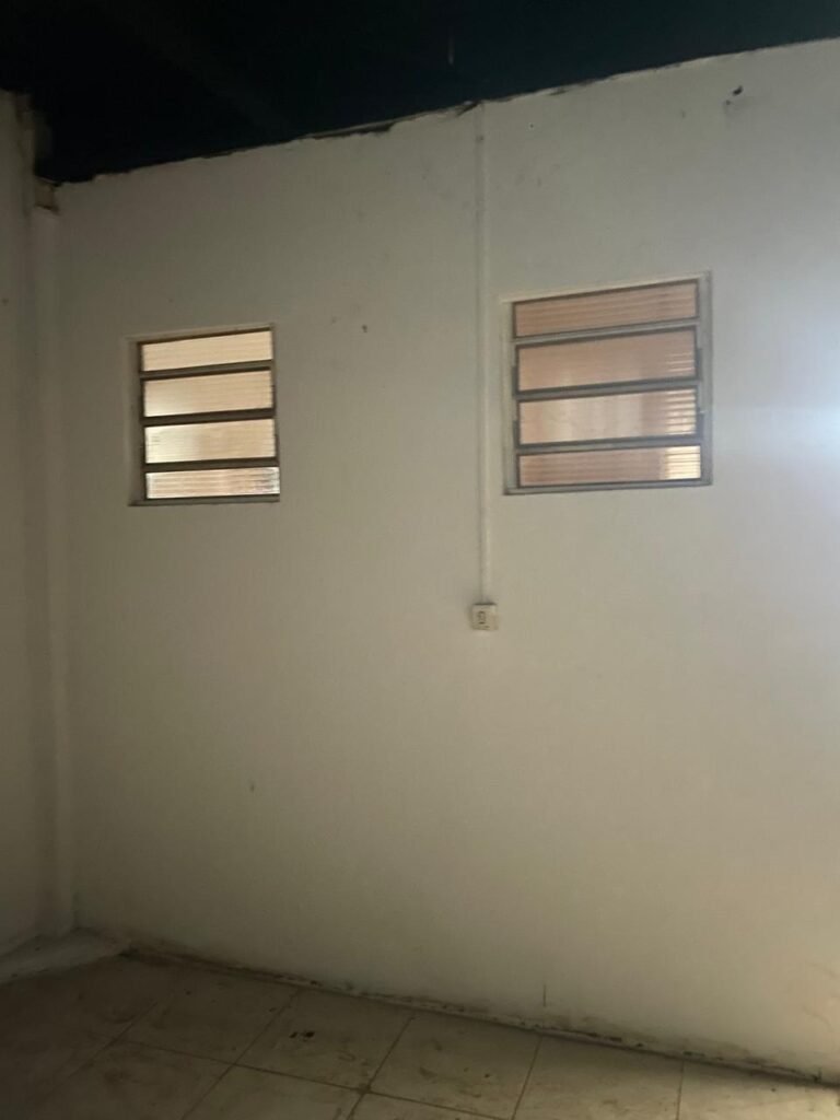 FUNDOS-: 01 Armário com prateleiras de mdf na cor branco em ordem, 02 divisórias navais com desgastes naturais e restante em ordem, piso com parte revestida em frio cerâmico com desgastes naturais, partes trincadas, parte faltando piso, 01 balcão de alvenaria com pintura nova na cor concreto em ordem e revestida de pisos cerâmicos com desgastes naturais, 01 pia de cerâmica com desgastes naturais e com partes trincada, 01 torneira de inox com manchas de tinta não testada, sifão sanfonado não testado, 03 tomadas não testadas, 03 interruptores não testado, 02 lâmpadas não testadas e 01 bocal sem lâmpada, 01 porta de divisória naval em ordem, com 01 maçaneta em ordem, com tranca embutida e sem chave, paredes com pintura barrada na cor concreto nova e em ordem, restante com pintura na cor branco neve nova e em ordem, teto com estrutura de ferro com pintura nova na cor preto em ordem.