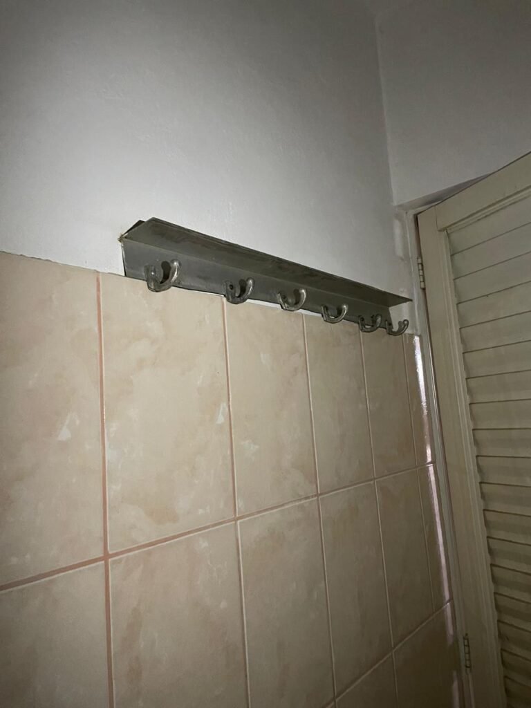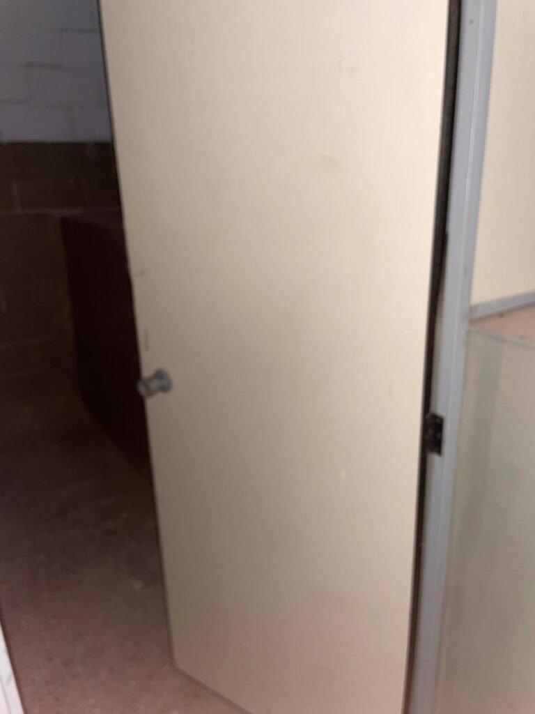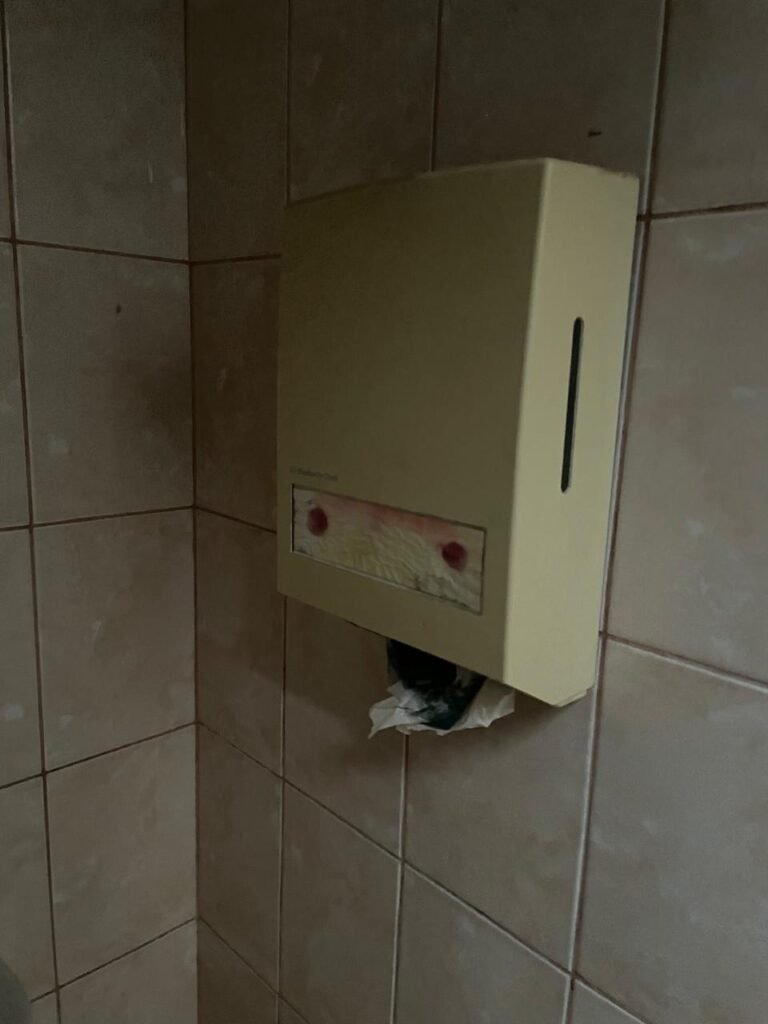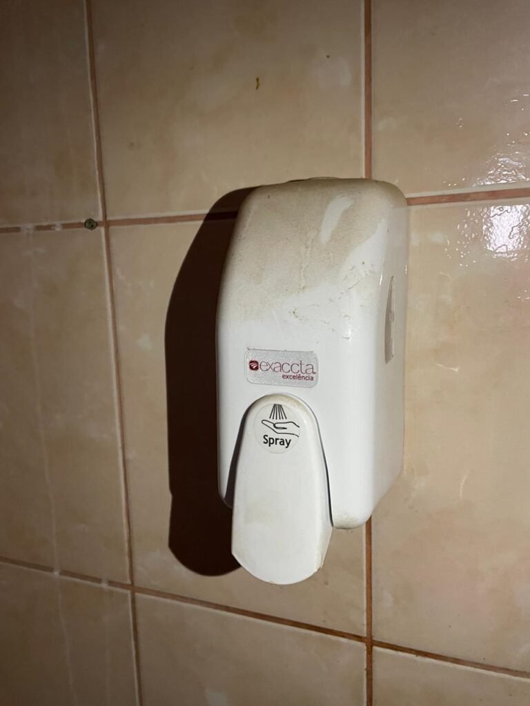 BANHEIRO MASCULINO-: Piso revestido de frios cerâmicos com resgates naturais, com manchas de tinta, e restante em ordem, 01 ralo em inox em ordem, 01 suporte de papel marca Kimberly Clark com desgastes naturais, 01 armário de pequeno porte com espelho com desgastes naturais e restante em ordem, 01 suporte de sabonete líquido marca Exaccta em ordem , 01 suporte em inox de toalha de rosto, 01 conjunto lavatório de cerâmica cor branco marca em Icasa, 01 torneira em inox em ordem, 01 sifão sanfonado em ordem, 01 interruptor não testado, paredes 1/2 revestidas de pisos frios cerâmicos com desastres naturais e restante em ordem, restante das paredes e do teto com pintura na cor branco neve em ordem, 01 porta de aço com desgastes naturais e com pintura na cor branco, maçanetas com pintura na cor cinza e com acabamento solto, fechadura marca MGM sem chave, 01 conjunto sanitário de cerâmica cor branco, marca Icasa, contando e acento com desgastes naturais, descarga testada e rejunte vazando água, 01 vitrô basculante com esquadrias de ferro com pintura na cor branco com pigmentos de ferrugem, 01 fechadura em ordem e com 04 vidros canelados em ordem, 01 canopla em inox em ordem, 01 bocal com acabamento solto e com 01 lâmpada LED não testada, 01 suporte de ferro para toalhas com 06 suportes.