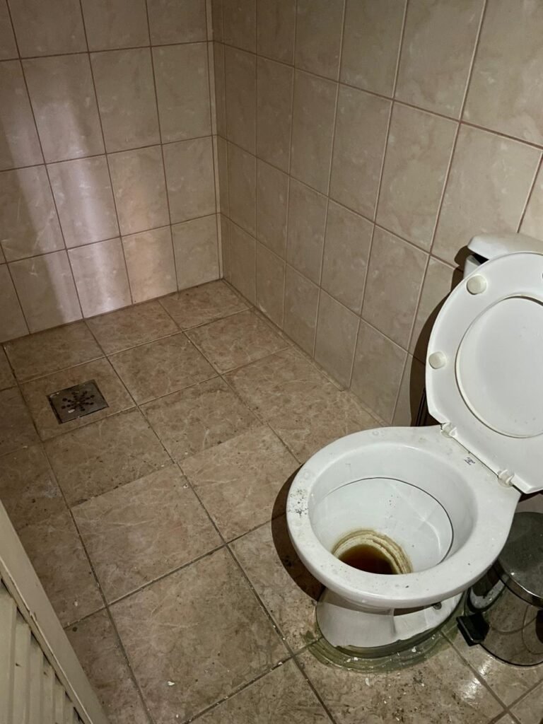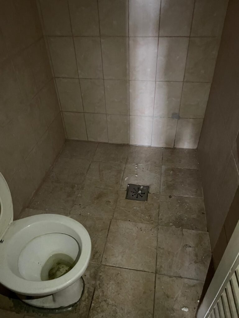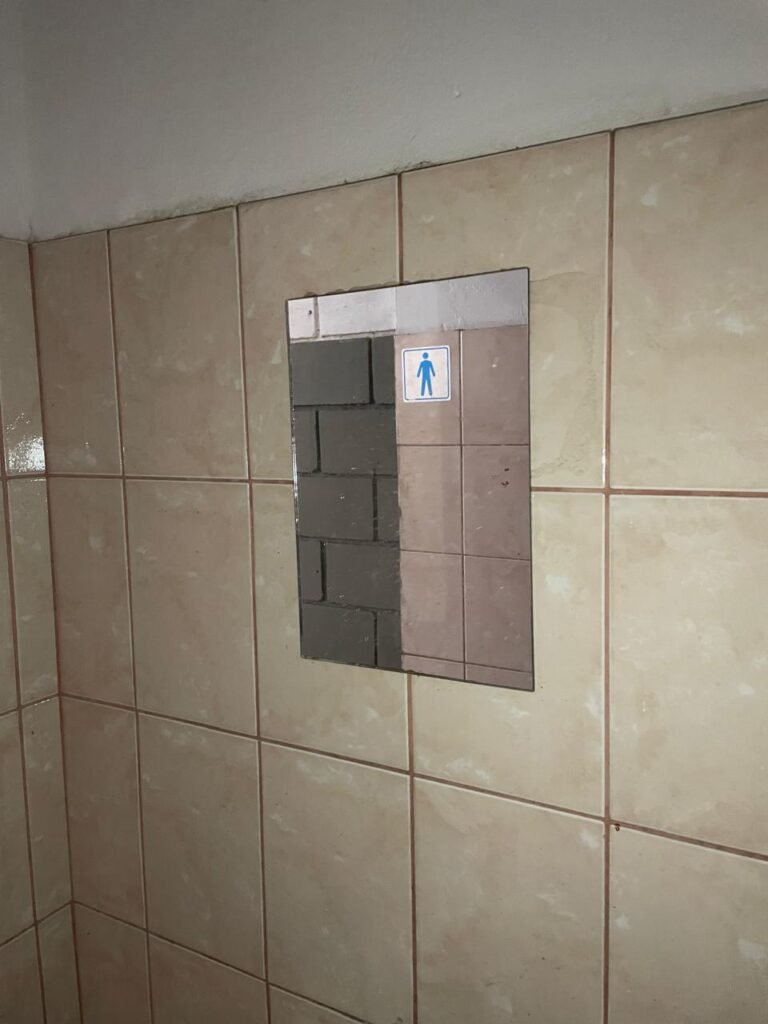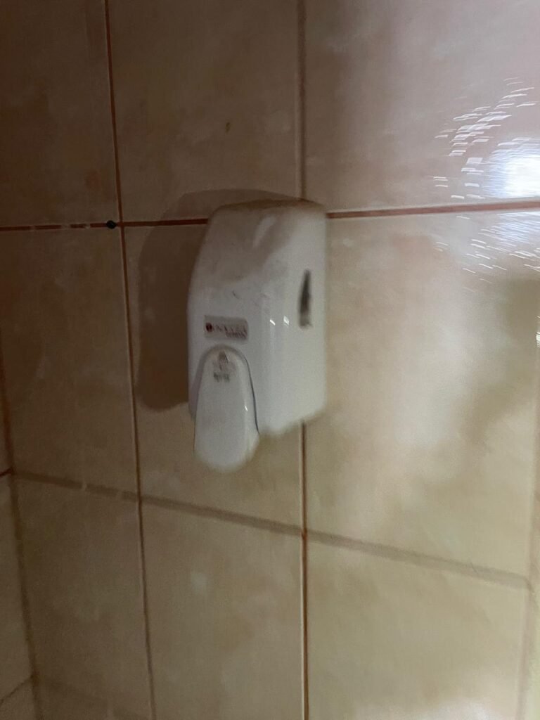 BANHEIRO MASCULINO-: Piso revestido de frios cerâmicos com resgates naturais, com manchas de tinta, e restante em ordem, 01 ralo em inox em ordem, 01 suporte de papel marca Kimberly Clark com desgastes naturais, 01 armário de pequeno porte com espelho com desgastes naturais e restante em ordem, 01 suporte de sabonete líquido marca Exaccta em ordem , 01 suporte em inox de toalha de rosto, 01 conjunto lavatório de cerâmica cor branco marca em Icasa, 01 torneira em inox em ordem, 01 sifão sanfonado em ordem, 01 interruptor não testado, paredes 1/2 revestidas de pisos frios cerâmicos com desastres naturais e restante em ordem, restante das paredes e do teto com pintura na cor branco neve em ordem, 01 porta de aço com desgastes naturais e com pintura na cor branco, maçanetas com pintura na cor cinza e com acabamento solto, fechadura marca MGM sem chave, 01 conjunto sanitário de cerâmica cor branco, marca Icasa, contando e acento com desgastes naturais, descarga testada e rejunte vazando água, 01 vitrô basculante com esquadrias de ferro com pintura na cor branco com pigmentos de ferrugem, 01 fechadura em ordem e com 04 vidros canelados em ordem, 01 canopla em inox em ordem, 01 bocal com acabamento solto e com 01 lâmpada LED não testada, 01 suporte de ferro para toalhas com 06 suportes.