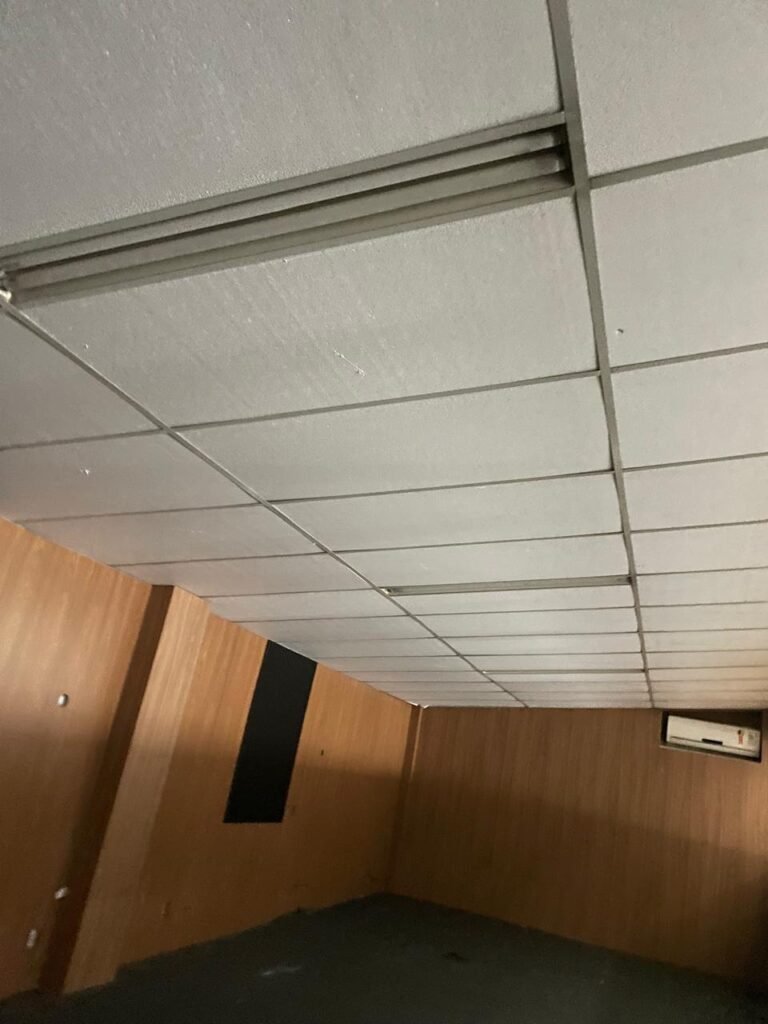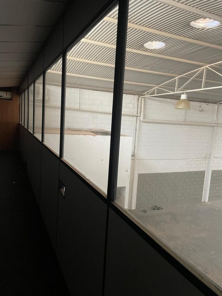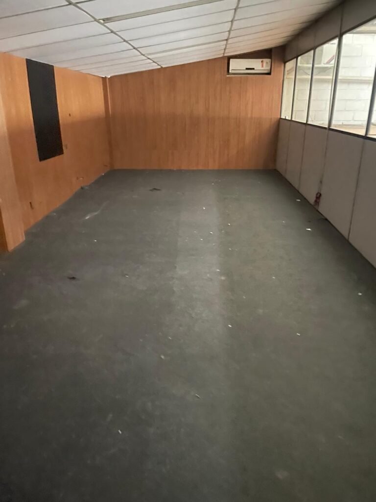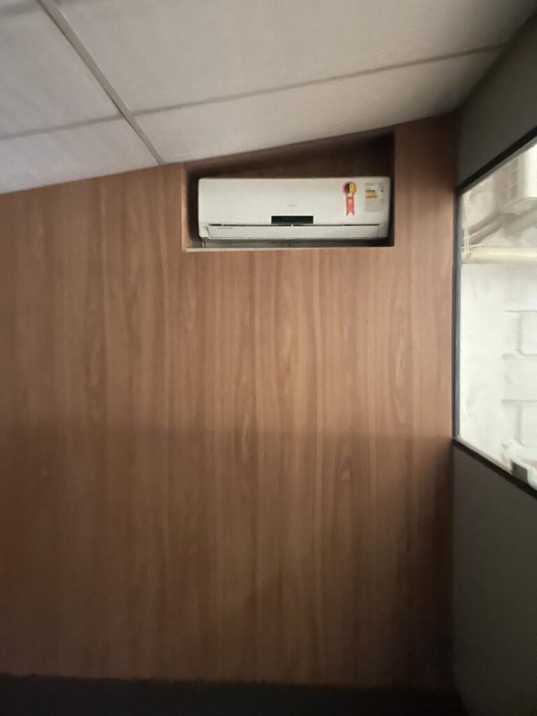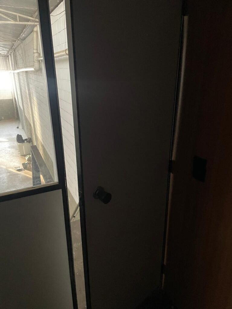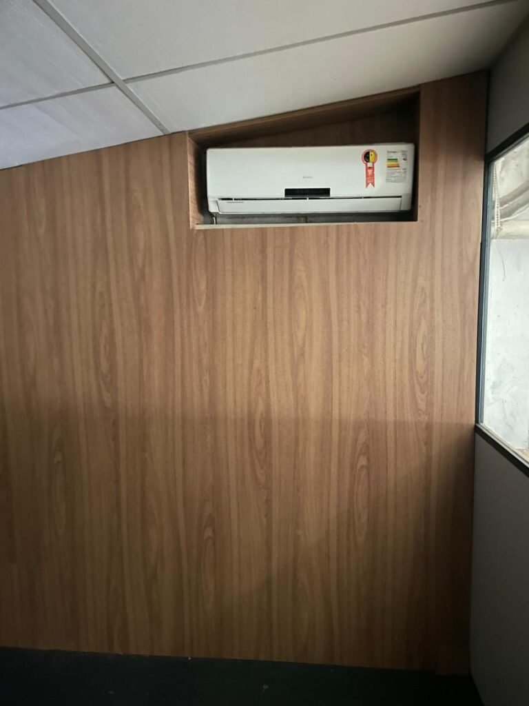 ESCRITÓRIO-: Porta social de divisórias com maçanetas com acabamento solto e com fechadura embutida em ordem, paredes de divisórias navais com desgastes natural e restante em ordem, com 108 vidros lisos transparentes Blindex em ordem, piso revestido de carpete de veludo e madeira, com desgastes naturais e com partes soltando, paredes revestidas de MDF em ordem, com buracos de instalações e fiações aparente, com 02 interruptores não testados, 02 painéis de MDF na cor preto em ordem, 02 ar condicionado marca Gree não testado, 01 controle remoto de ar condicionado não testado, teto com forro rebaixado com placas de isopor térmico com desgastes naturais, 03 luminárias duplas com 02 lâmpadas tubulares fluorescentes em cada não testadas.