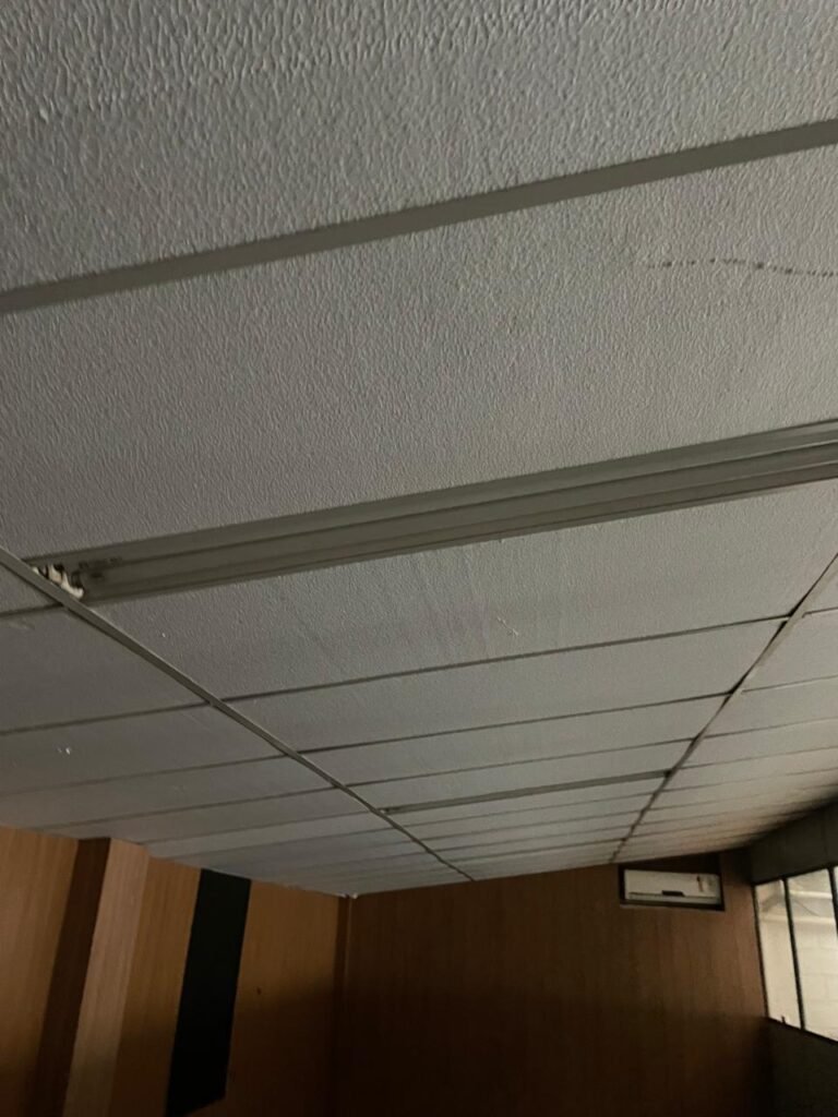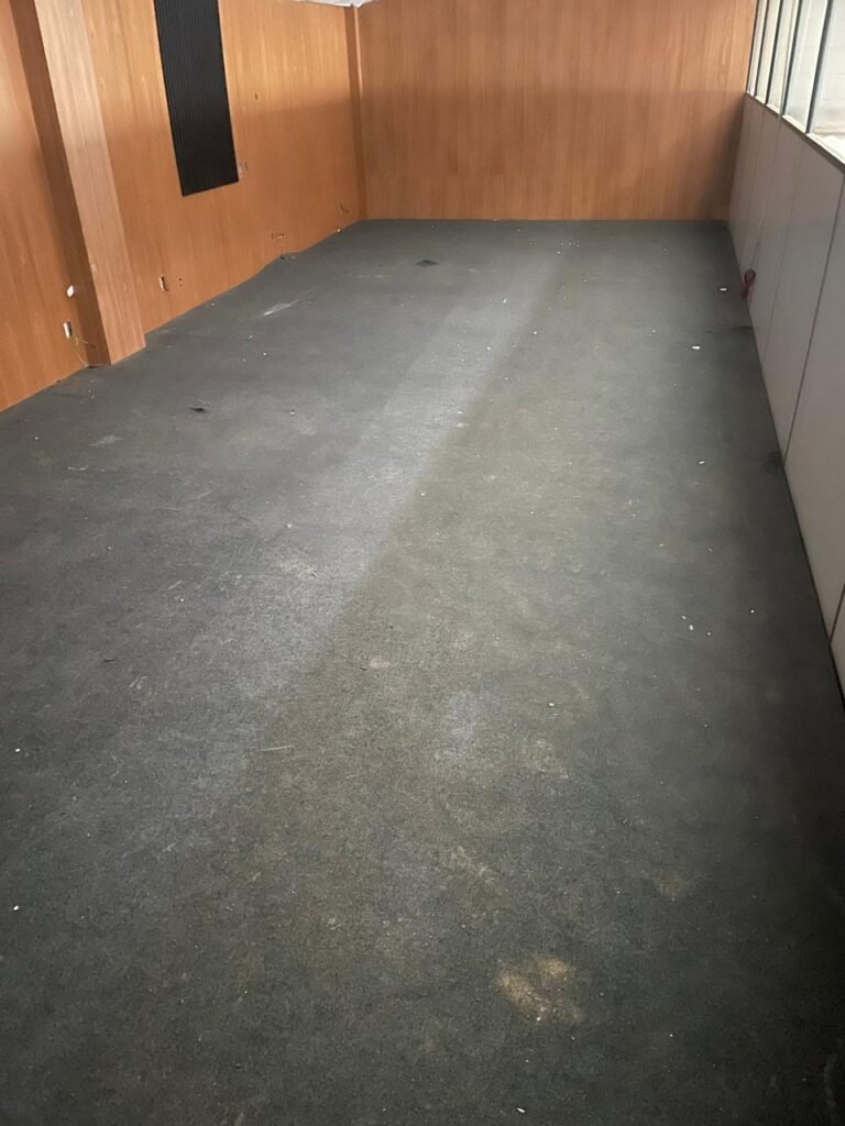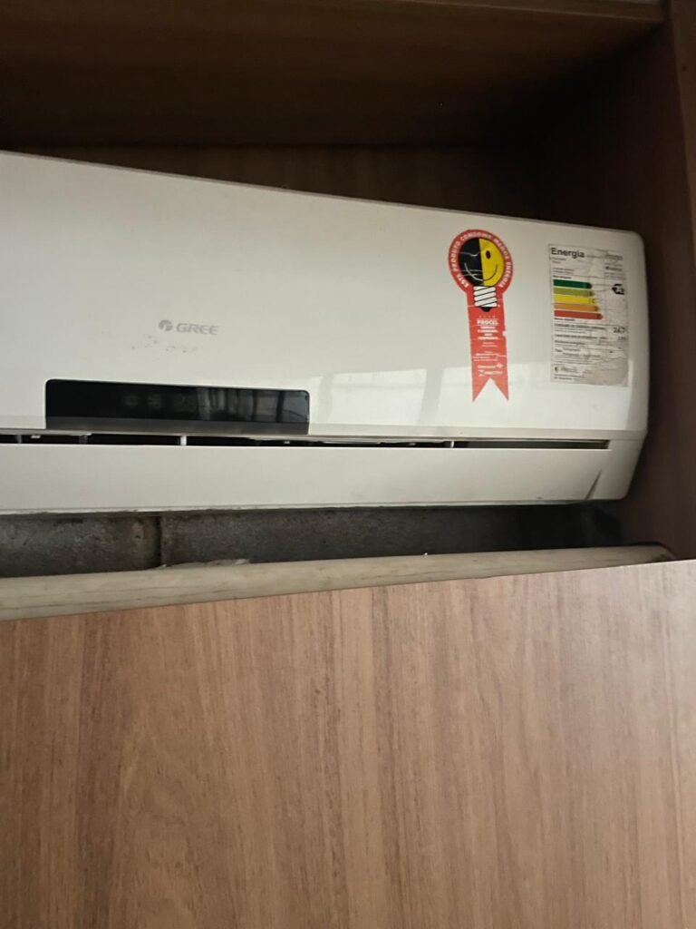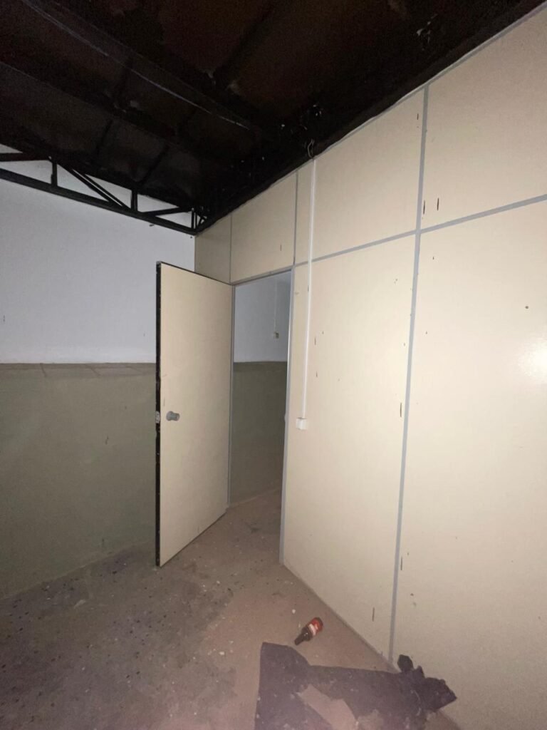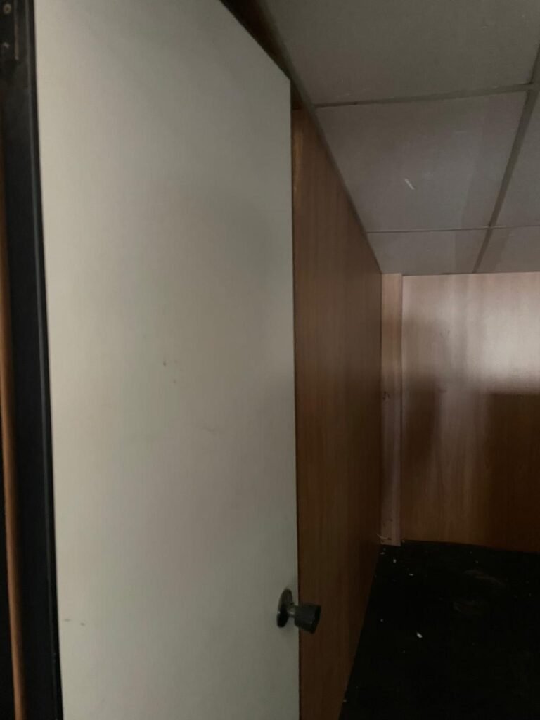 ESCRITÓRIO-: Porta social de divisórias com maçanetas com acabamento solto e com fechadura embutida em ordem, paredes de divisórias navais com desgastes natural e restante em ordem, com 108 vidros lisos transparentes Blindex em ordem, piso revestido de carpete de veludo e madeira, com desgastes naturais e com partes soltando, paredes revestidas de MDF em ordem, com buracos de instalações e fiações aparente, com 02 interruptores não testados, 02 painéis de MDF na cor preto em ordem, 02 ar condicionado marca Gree não testado, 01 controle remoto de ar condicionado não testado, teto com forro rebaixado com placas de isopor térmico com desgastes naturais, 03 luminárias duplas com 02 lâmpadas tubulares fluorescentes em cada não testadas.
