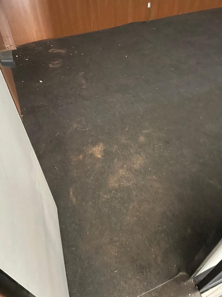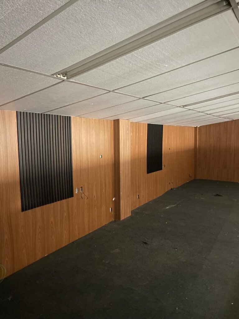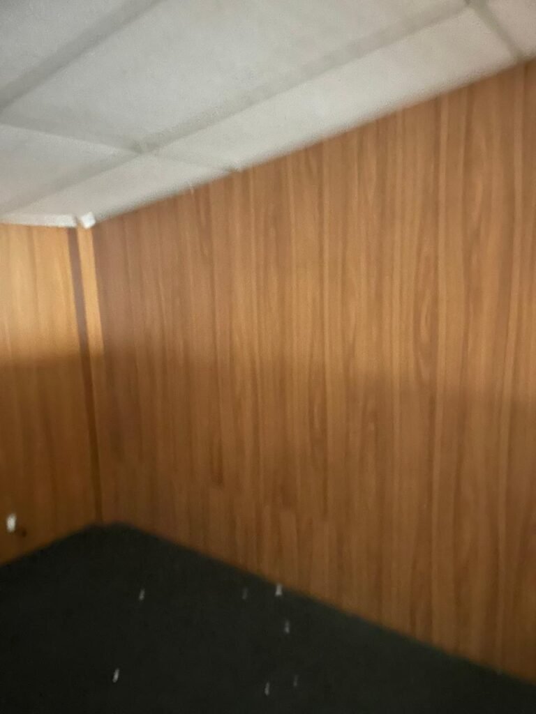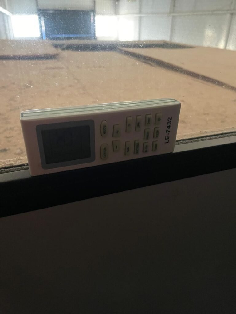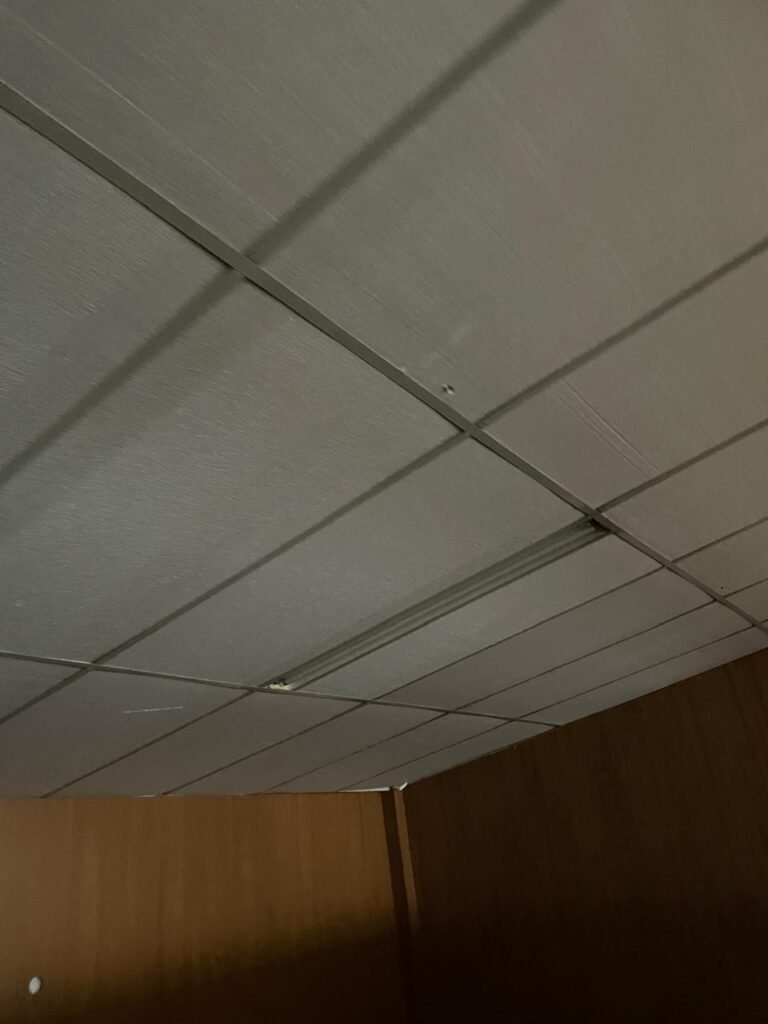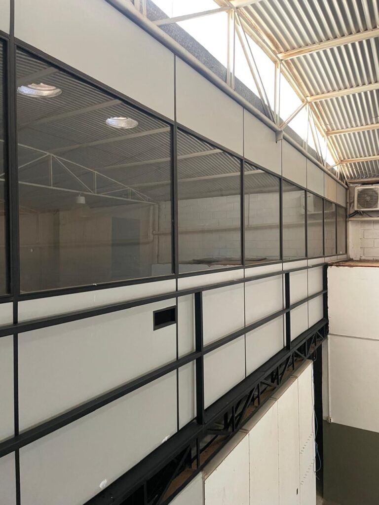 ESCRITÓRIO-: Porta social de divisórias com maçanetas com acabamento solto e com fechadura embutida em ordem, paredes de divisórias navais com desgastes natural e restante em ordem, com 108 vidros lisos transparentes Blindex em ordem, piso revestido de carpete de veludo e madeira, com desgastes naturais e com partes soltando, paredes revestidas de MDF em ordem, com buracos de instalações e fiações aparente, com 02 interruptores não testados, 02 painéis de MDF na cor preto em ordem, 02 ar condicionado marca Gree não testado, 01 controle remoto de ar condicionado não testado, teto com forro rebaixado com placas de isopor térmico com desgastes naturais, 03 luminárias duplas com 02 lâmpadas tubulares fluorescentes em cada não testadas.