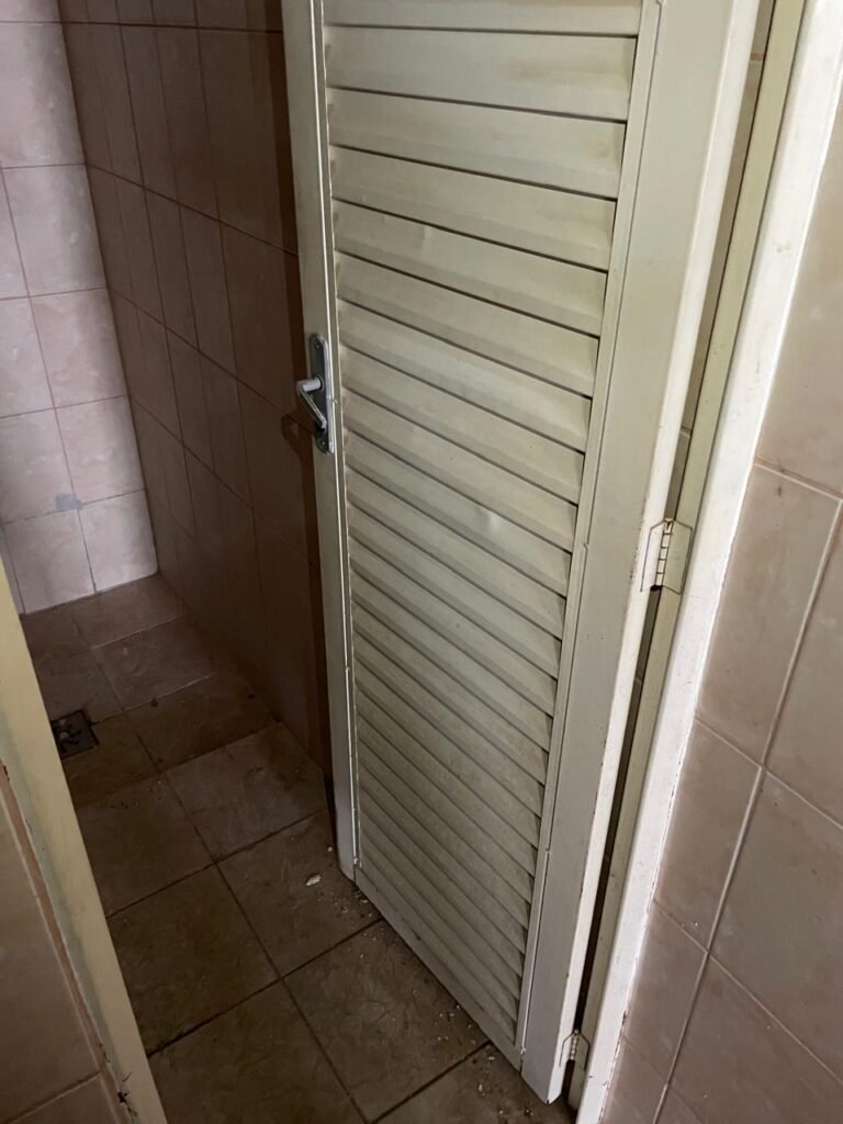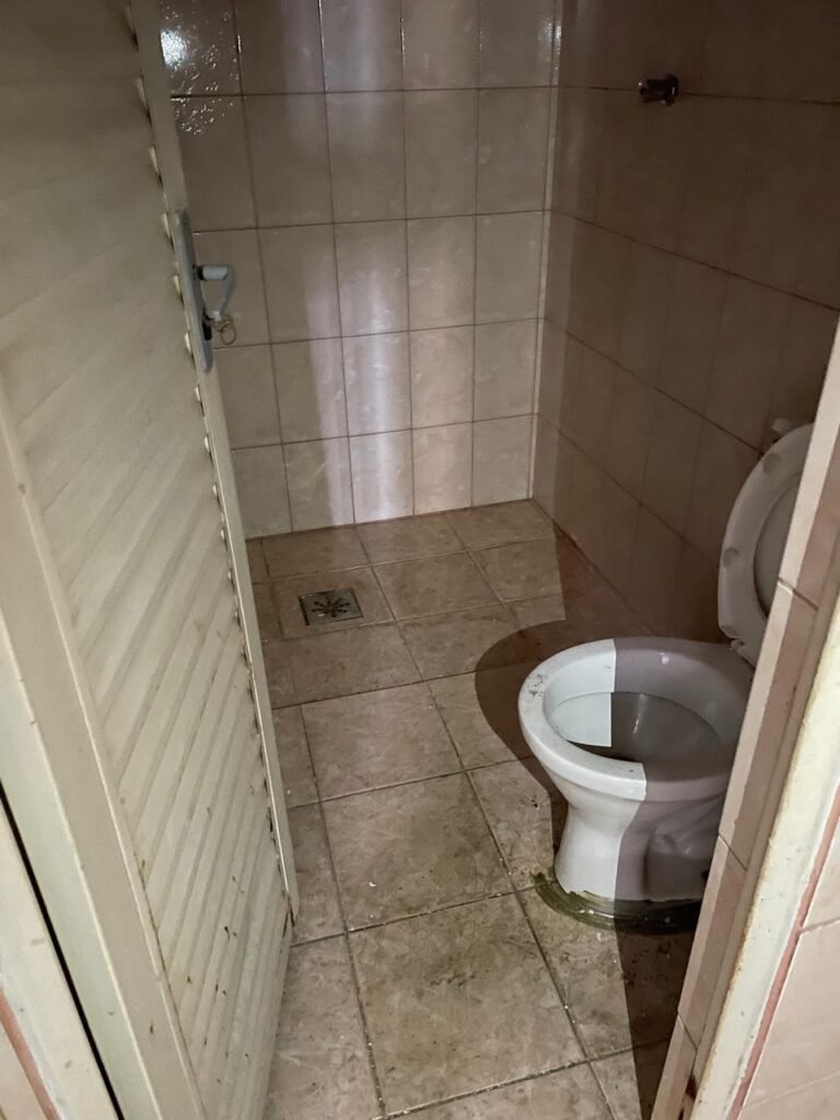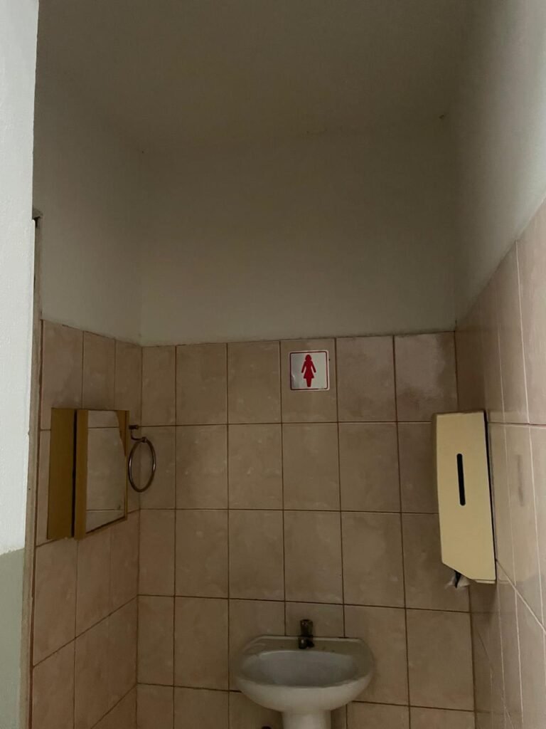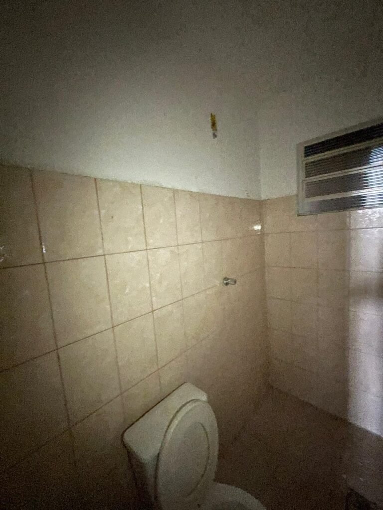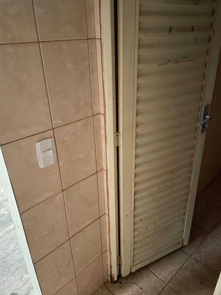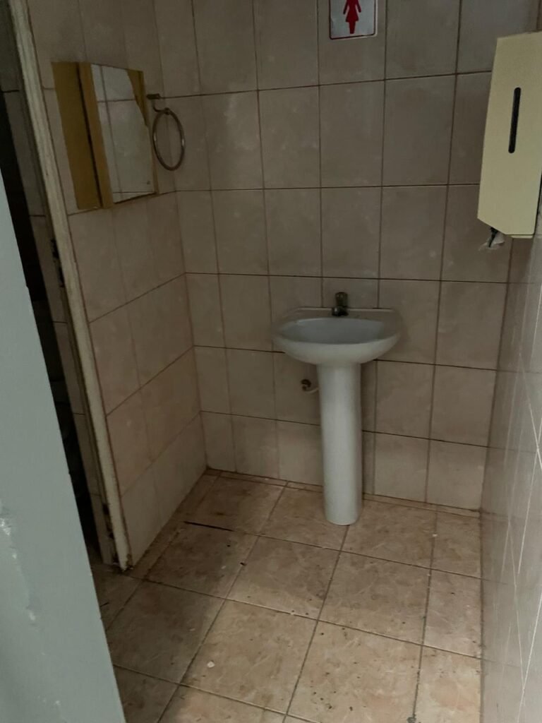 BANHEIRO FEMININO-: Piso revestido de frios cerâmicos com resgates naturais, com manchas de tinta, e restante em ordem, 01 rabo em inox em ordem, 01 suporte de papel marca Kimberly Clark com desgastes naturais, 01 armário de pequeno porte com espelho danificado e restante em ordem, 01 suporte em inox de toalha de rosto, 01 conjunto lavatório de cerâmica cor branco marca em Icasa, 01 torneira em inox não testada, 01 sifão sanfonada não testado, 01 interruptor não testado, paredes 1/2 revestidas de pisos frios cerâmicos com desastres naturais e restante em ordem, restante das paredes e do teto com pintura na cor branco neve em ordem, 01 porta de aço com desgastes naturais e com pintura na cor branco, maçanetas com pintura na cor cinza e com acabamento solto, fechadura marca MGM com chave em ordem, 01 conjunto sanitário de cerâmica cor branco, marca Icasa, contando e acento com desgastes naturais, descarga não testada, 01 vitrô basculante com esquadrias de ferro com pintura na cor branco com pigmentos de ferrugem, 01 fechadura em ordem e com 04 vidros canelados em ordem, 01 canopla em inox em ordem, 01 bocal com acabamento solto e com 01 lâmpada LED não testada.