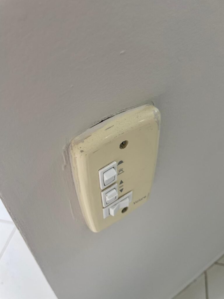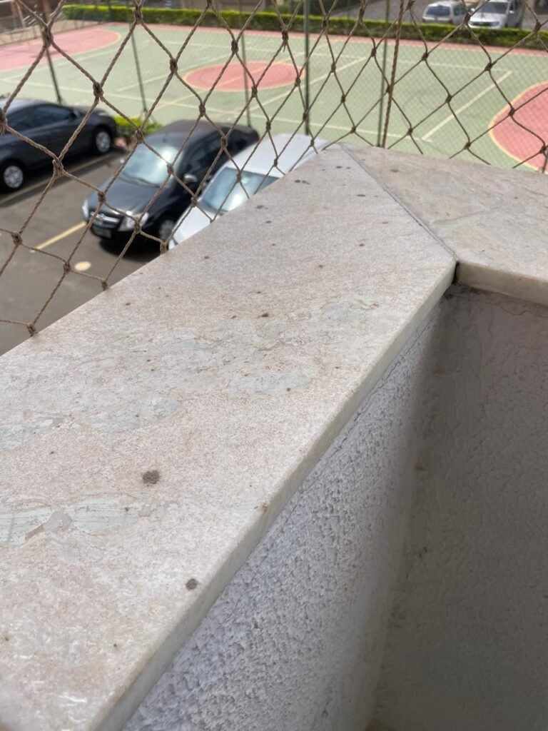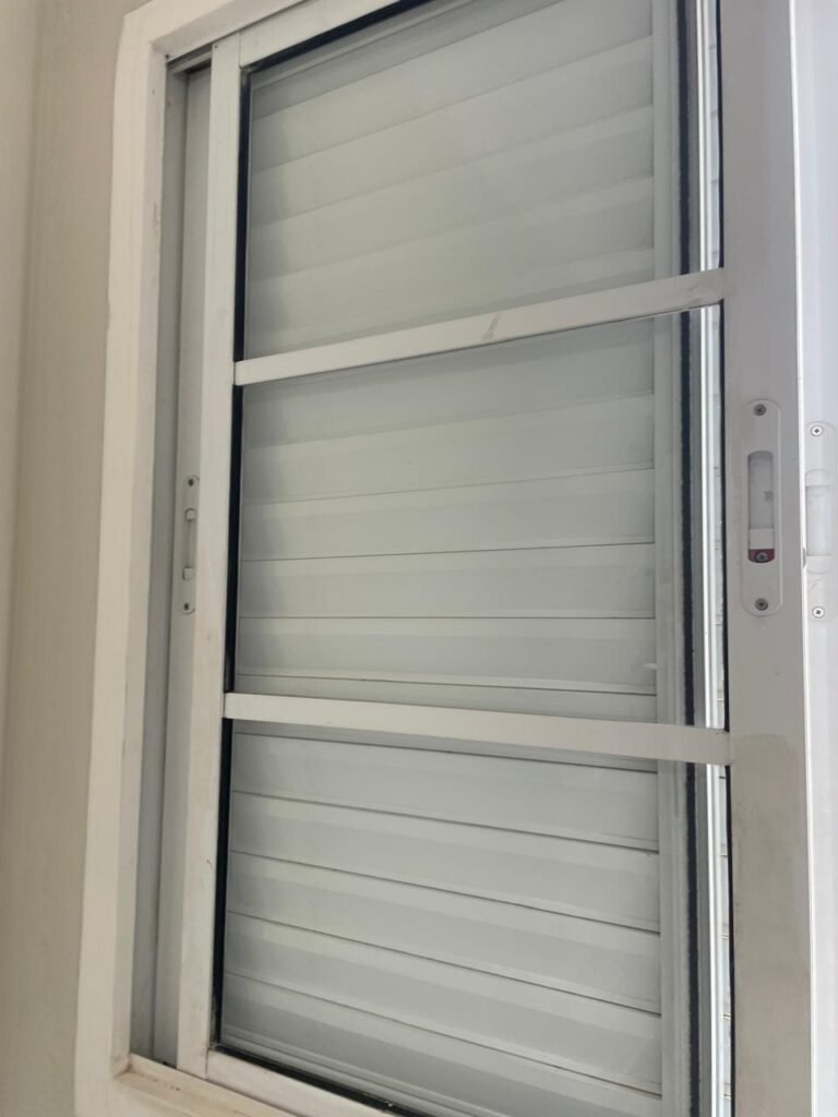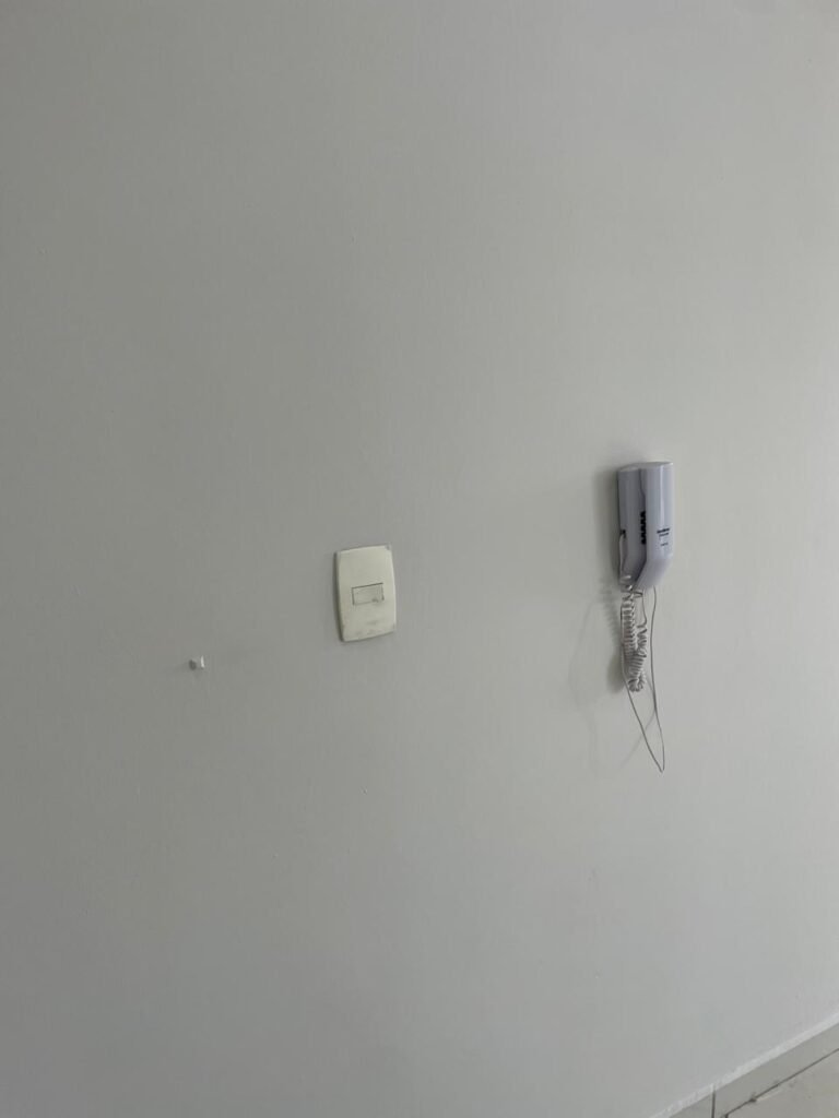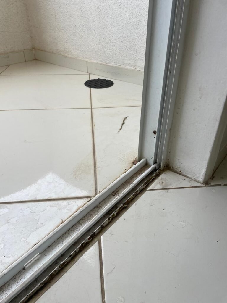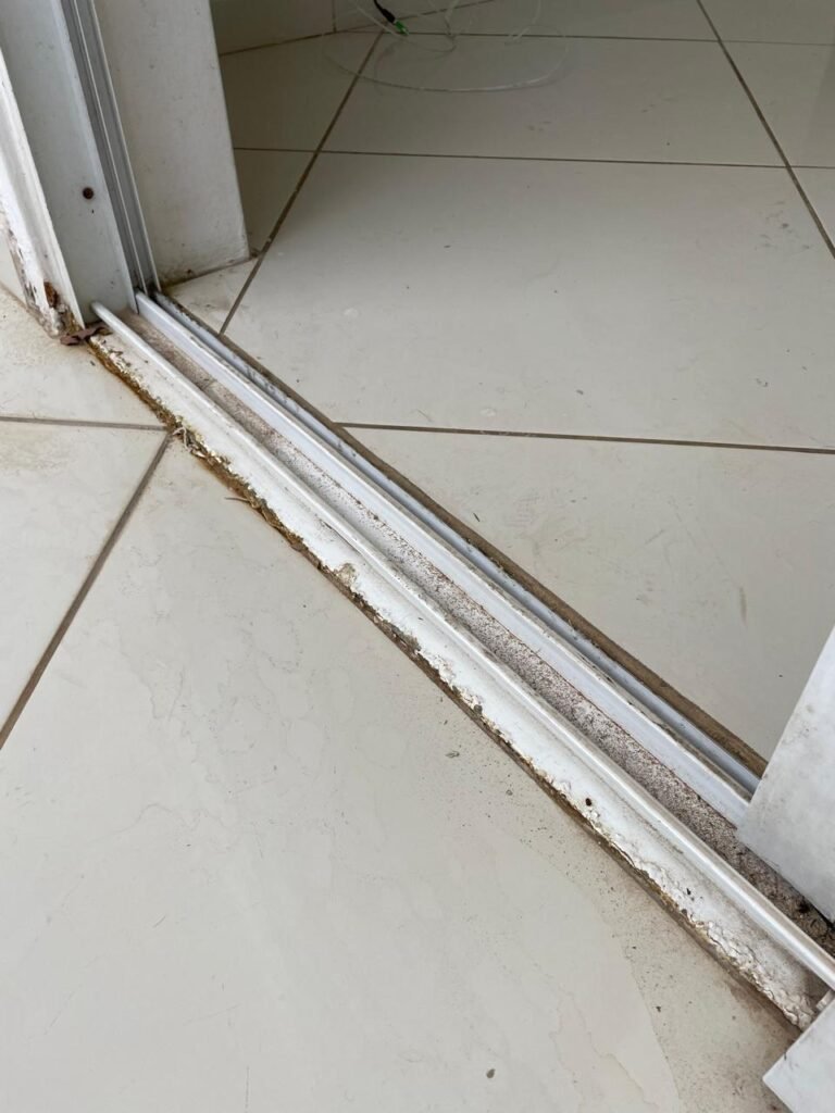 SALA-: Retirar sujeira de tinta do piso, rodapés e interruptores, conserto de 01 trava da veneziana que não está trancando, interfone sujo de tinta também, trilhos de alumínio da porta de correr está todo corroido, com ferrugem, uma porta não desliza direito, e ambas portas estão com as travas danificadas.