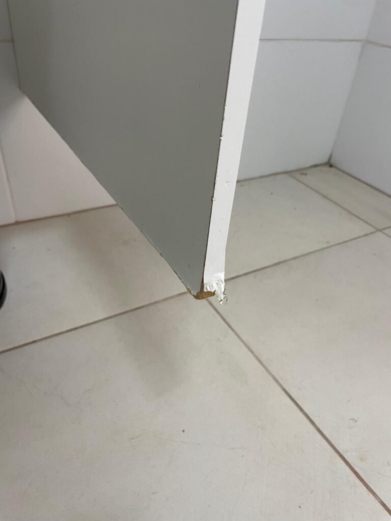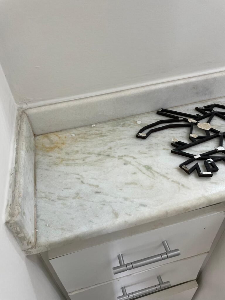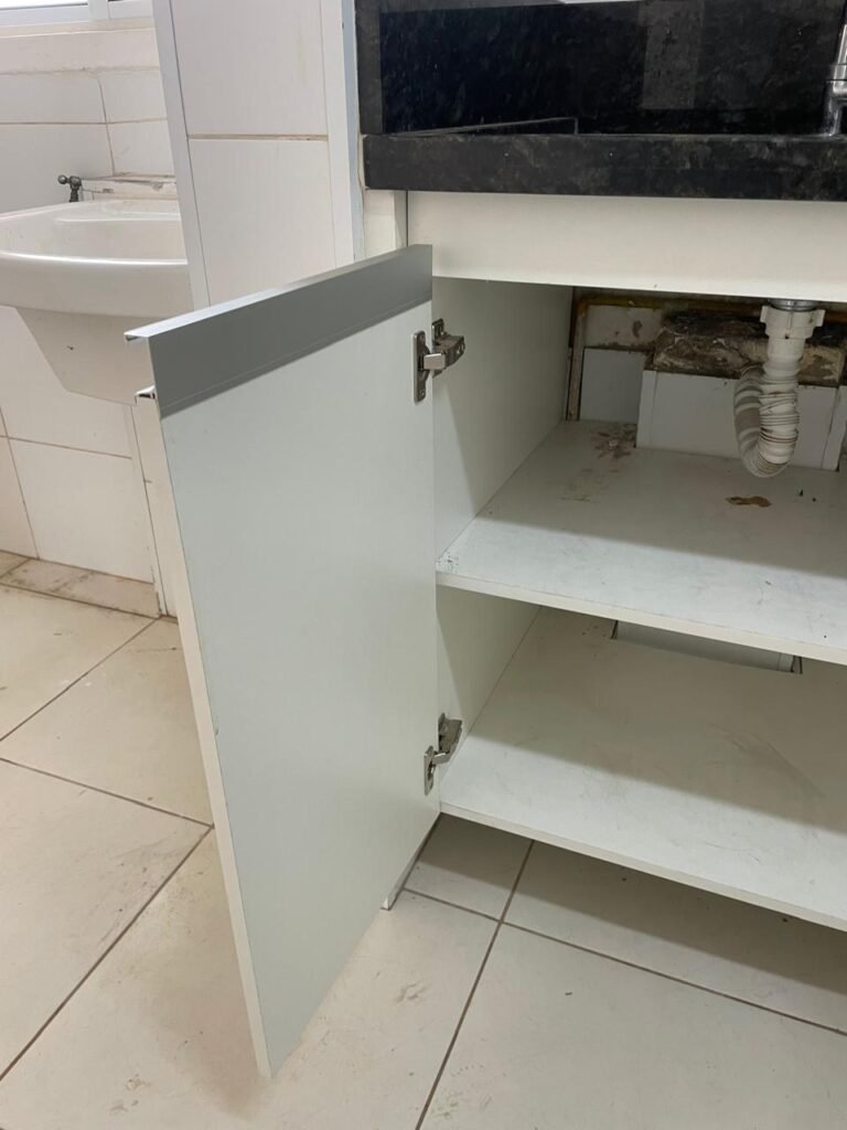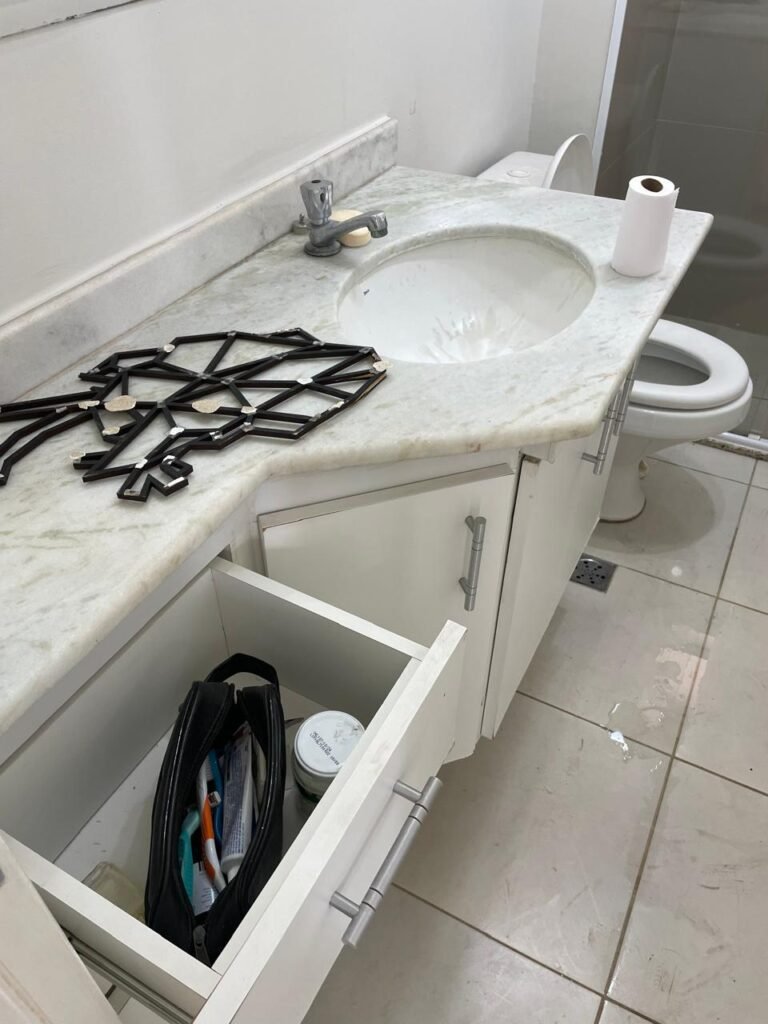 BANHEIRO-: Limpar respingos de tintas nos filete de marmore, nos pisos, nos rodapés, na pia, e na cuba, porta de madeira saindo lascas, torneira manchada, sifão sanfonado com vazamento, vaso sanitário com vazamento pela base, efetuar reparos do gabinete planejado, nas quinas saindo lascas, no acabamento, e nas dobradicas, reparo de gavetas, 01 está sem fundo.