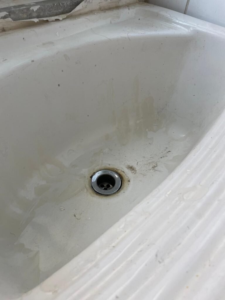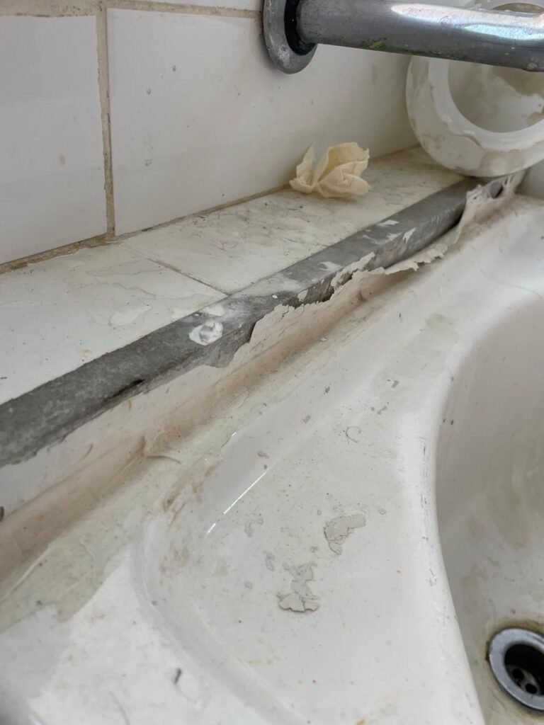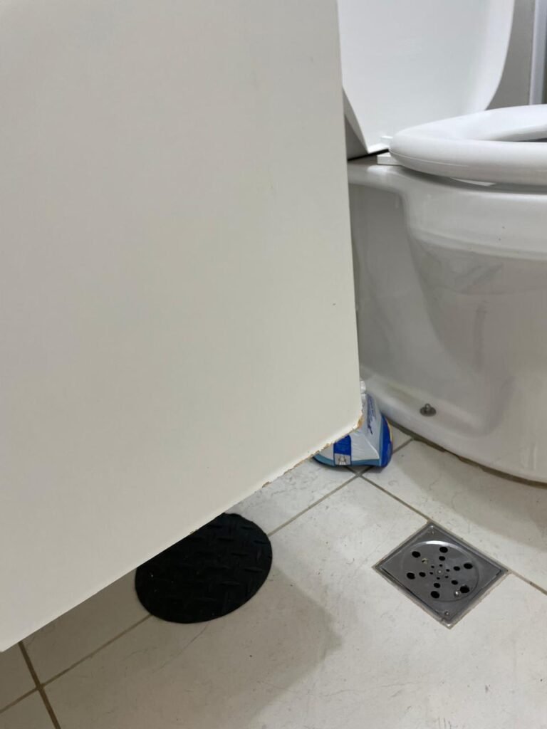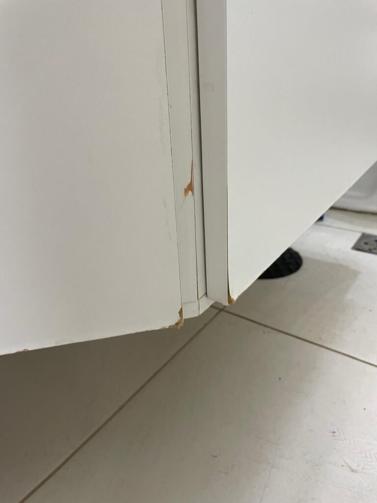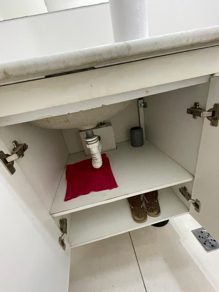 BANHEIRO-: Limpar respingos de tintas nos filete de marmore, nos pisos, nos rodapés, na pia, e na cuba, porta de madeira saindo lascas, torneira manchada, sifão sanfonado com vazamento, vaso sanitário com vazamento pela base, efetuar reparos do gabinete planejado, nas quinas saindo lascas, no acabamento, e nas dobradicas, reparo de gavetas, 01 está sem fundo.