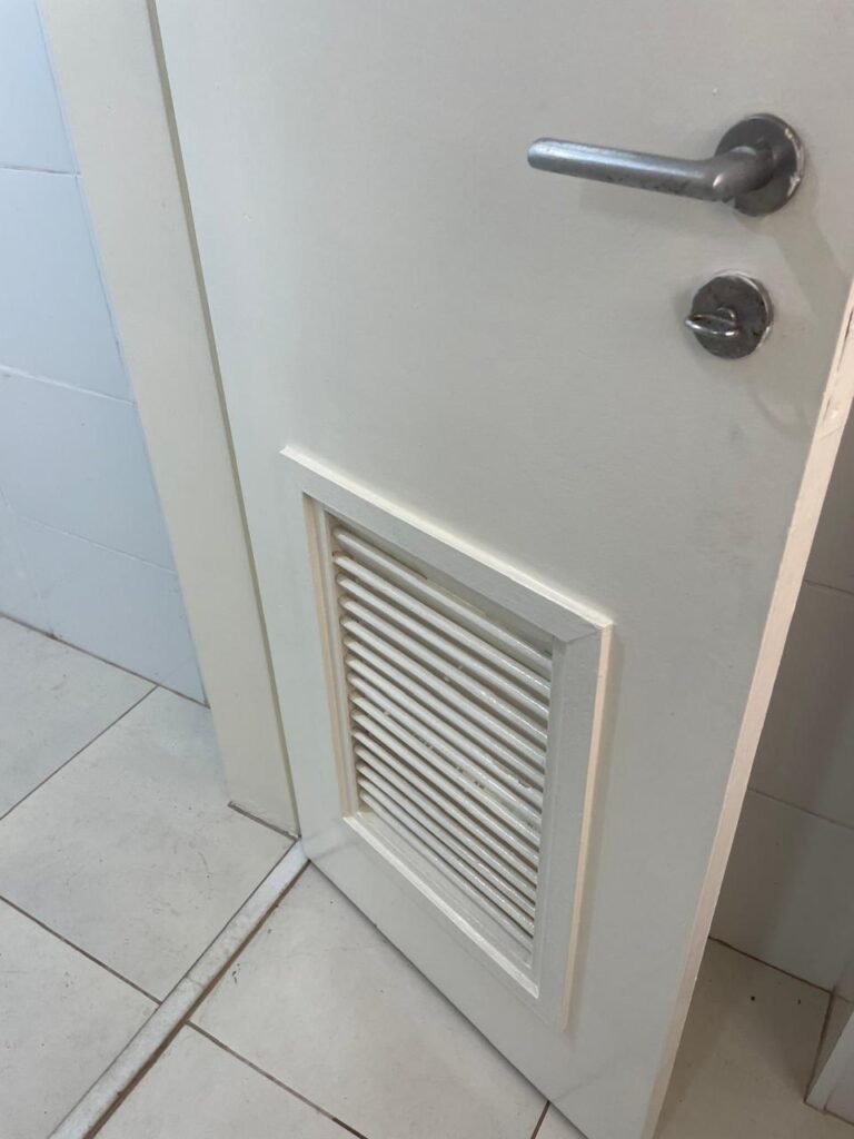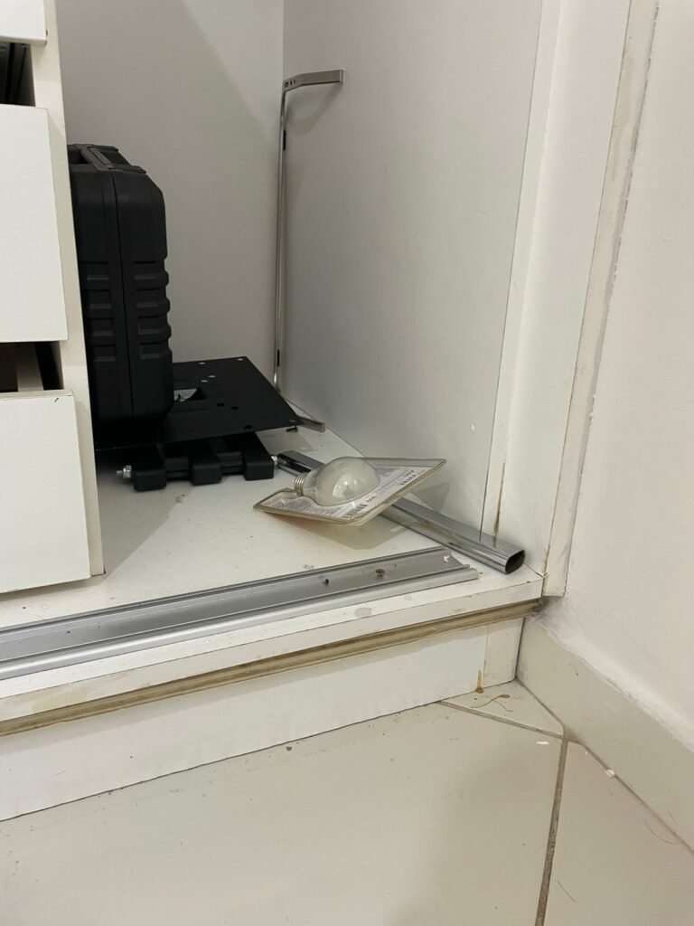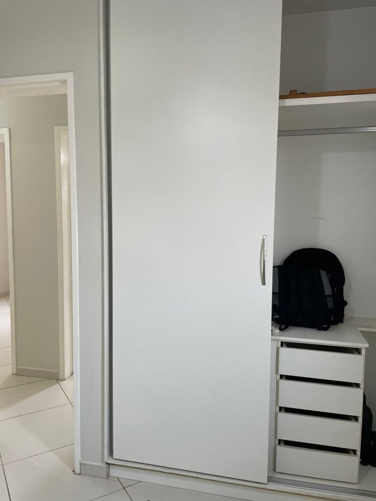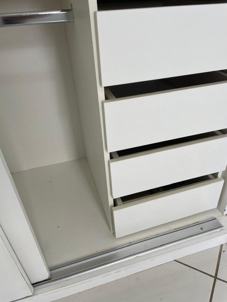 QUARTO 02-: limpeza, 01 trava da janela veneziana está emperrada, reparo nas dobradicas do guarda roupa.