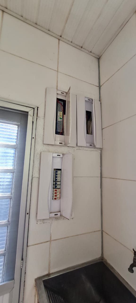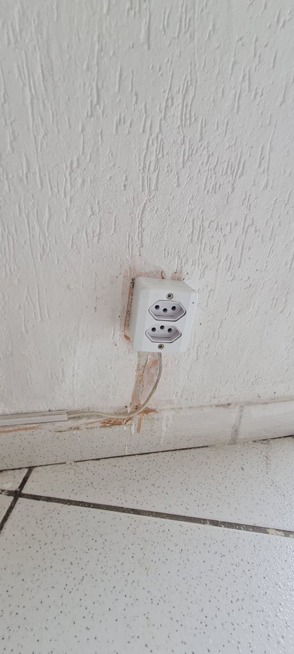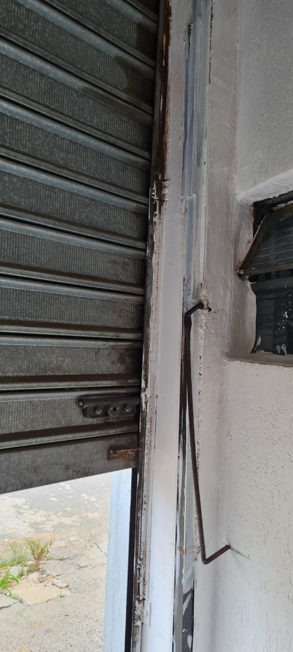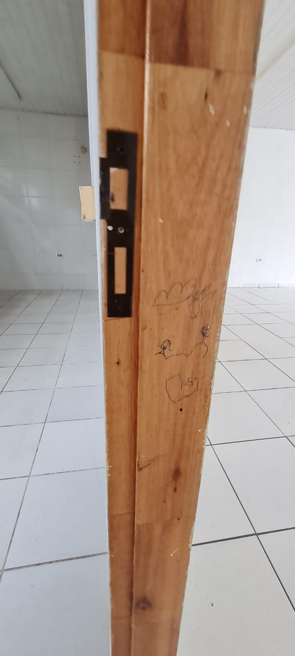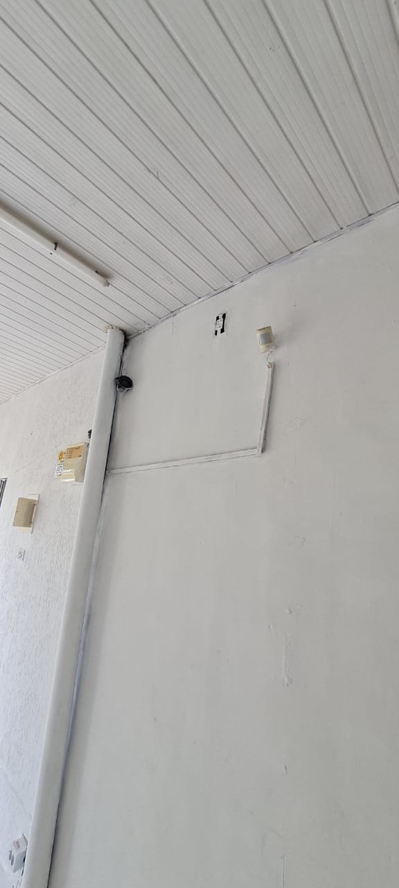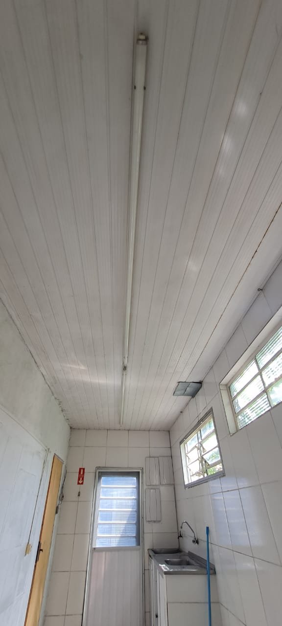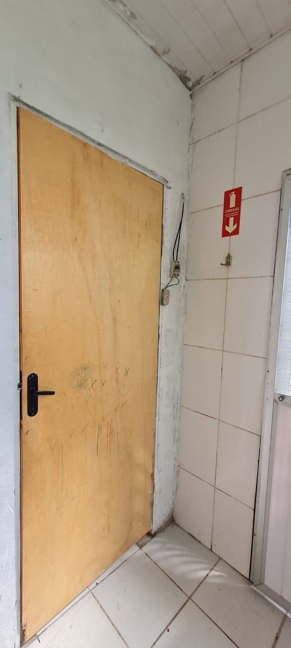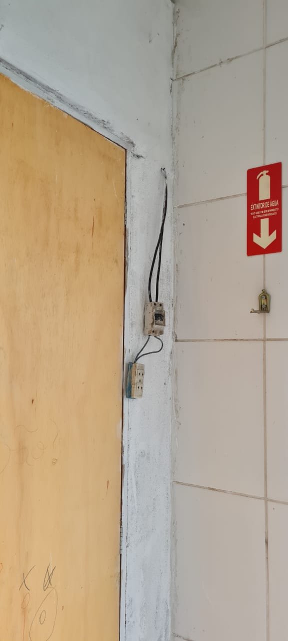 Salão: Piso cerâmico mesclado com manchas e lascados desgaste natural do tempo o restante em ordem, rodapés cerâmicos em ordem, paredes com a pintura na cor branco sendo duas paredes com textura em grafiato também na cor branco o restante em ordem, lateral da parede do fundo com 05 fileiras em azulejos do teto ao chão também com a pintura na cor branco em ordem, teto em forro pvc na cor branco em ordem, 06 lâmpadas tubulares em ordem, 05 tomadas sobrepor com saída para força/ energia em ordem, 02 interruptores de força/energia com espelho em ordem, 01 extensão fixada na parede com 04 saídas para força/energia em ordem, 05 interruptores de força/energia com espelho em ordem, 01 interruptor duplo sem espelho, 01 interruptor simples sem espelho, 01 interruptor duplo faltando um modulo de força/energia, 01 interruptor de luz triplo com espelho, 01 janela em ferro com vidro fixo em ordem, 01 porta de madeira com batente em ordem, fechadura em ordem, maçaneta em ordem, sem as chaves, com desenhos de criança a lápis na folha pelo lado de dentro e no batente o restante em ordem, 02 extintores, 02 fechamentos para porta de ferro coca cola com acrílico quebrado o restante em ordem, 01 caixa adjutores com tampa contendo 10 djuntores em ordem 02 caixas djuntores para passagem dos fios com tampa em ordem, 01 caixa com tampa 06 djuntores em ordem, 01 central de alarme alard Max Rf em ordem,