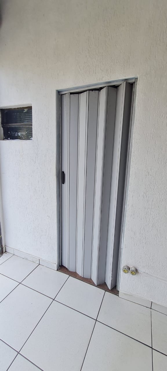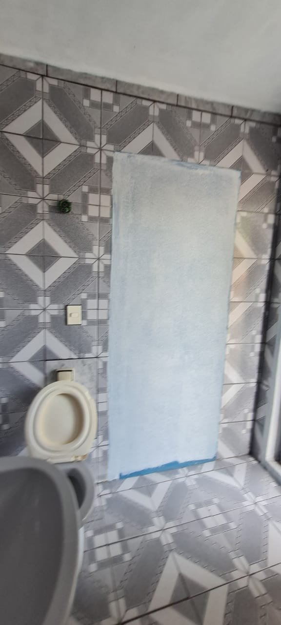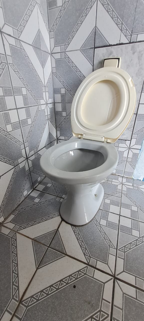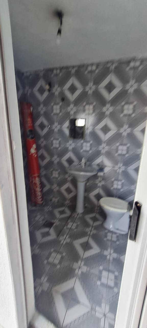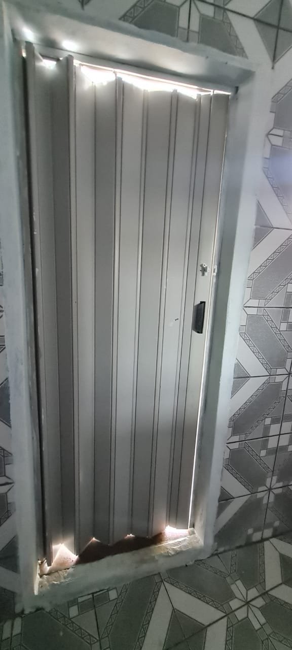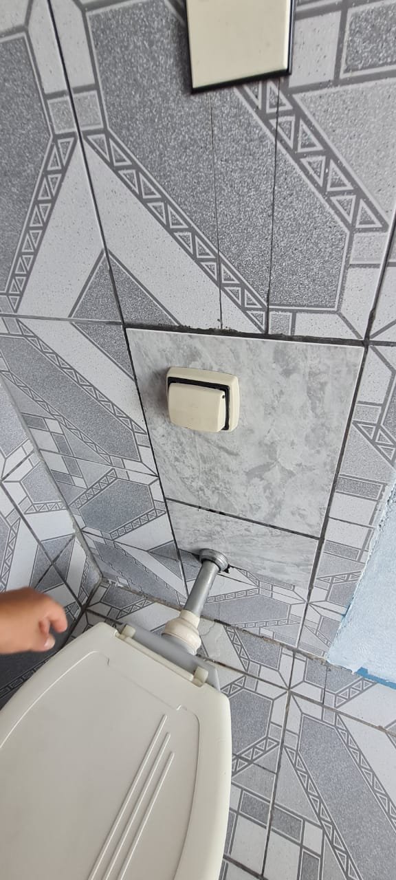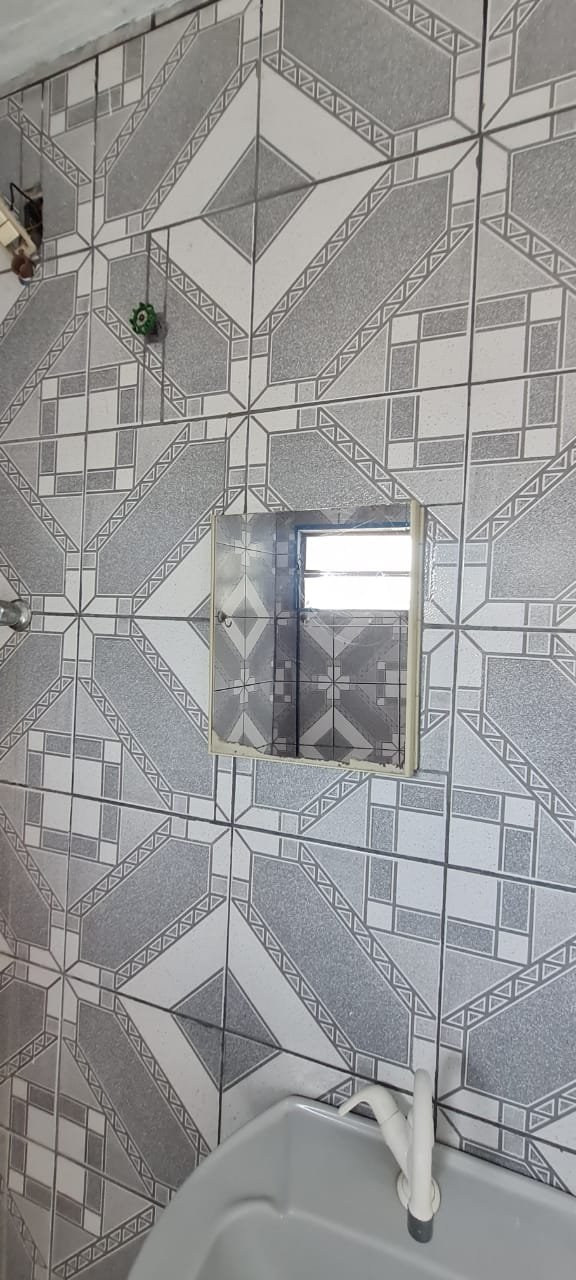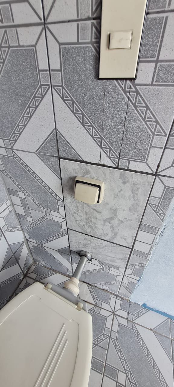 Banheiro:- Piso cerâmico mesclado antiderrapante em ordem, paredes com azulejos ate o teto sendo uma parede com medida porta rebocada o restante em ordem, soleira em mármore em ordem, teto com a pintura na cor branco em ordem, 01 spot com lâmpada led em ordem, porta sanfonada pvc cinza em ordem, vaso sanitário cerâmica na cor cinza em ordem, tampa de vaso em ordem, descarga vasando no acionamento o restante em ordem, pia com coluna de cerâmica na cor cinza com faixa de durepox interligando o restante em ordem, 01 torneira pica móvel na cor branca em ordem, 01 ralo de inox faltando 01 parafuso o restante em ordem, 01 janela basculante contendo 02 vidros em ordem, 02 porta toalhas em ordem, 01 porta papel higiênico em ordem, 01 registro com canopla em ordem, 01 interruptor de luz com espelho em ordem, 01interruptor força/energia em ordem, 01 espelho oxidado o restante em ordem,