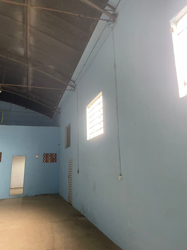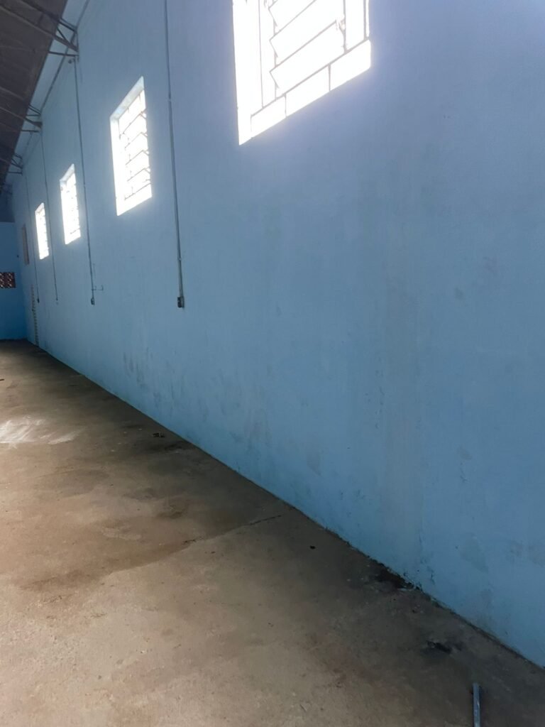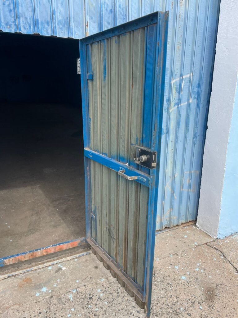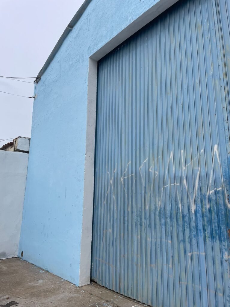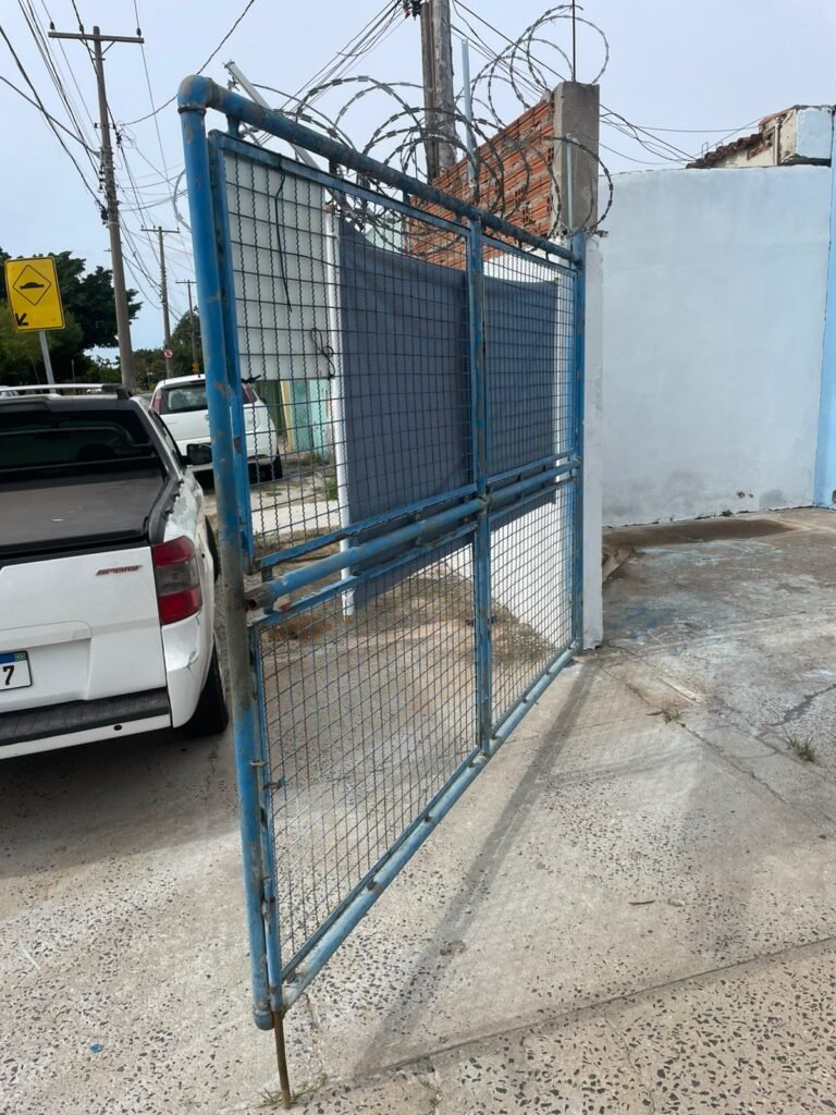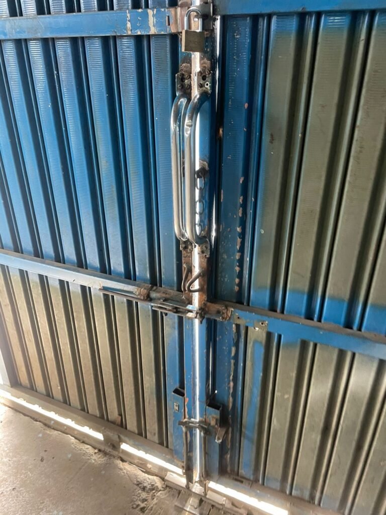 BARRACÃO-: 01 Portão deslizante de chapas de ferro em ordem, com pintura na cor azul com desgastes naturais e descasques, 02 puxadores em ordem, 01 fechadura alavanca em ordem, 02 fechaduras ferrolho em ordem, 01 trinco para cadeado em ordem e com 01 cadeado marca Pado em ordem, portão contém 01 porta social com 01 puxador em ordem e 01 fechadura start marca 3F com chave em ordem, piso em concreto desempenado com desgastes naturais, trincados e manchas pela extensão, paredes com pintura na cor azul com pequenas manchas pela extensão e restante em ordem, 06 vitrôs basculantes com esquadrias de ferro com desgastes naturais, 01 deles contendo 18 vidros canelados, restante contendo 14 vidros canelados, sendo que todos possuem 01 fechadura alavanca não testadas, ambos com vidros com desgastes naturais, manchas de tinta e trincados. 01 vitrô basculante isolado, 01 porta social de ferro isolada, 01 escada de madeira com guarda corpo com desgastes naturais, 01 ponto de água com 01 torneira de jardim em ordem, estruturas de ferro para iluminação, contendo cinco lâmpadas Led e 01 lâmpada incandescente, 06 tomadas sendo que 01 delas é 220 watts, 05 interruptores em ordem, 01 caixa de distribuição de disjuntor, contendo tampa em ordem e 01 disjuntor Steck SD-63C70 400v em ordem.