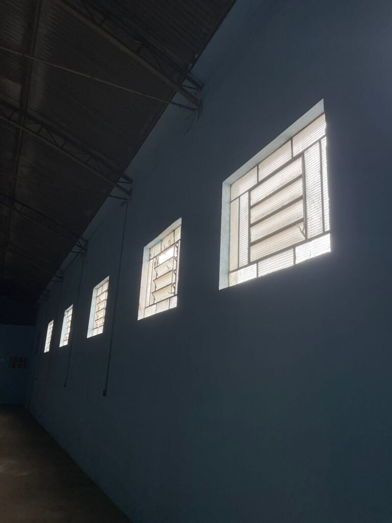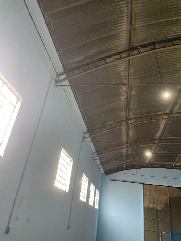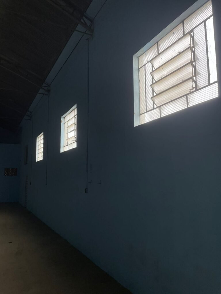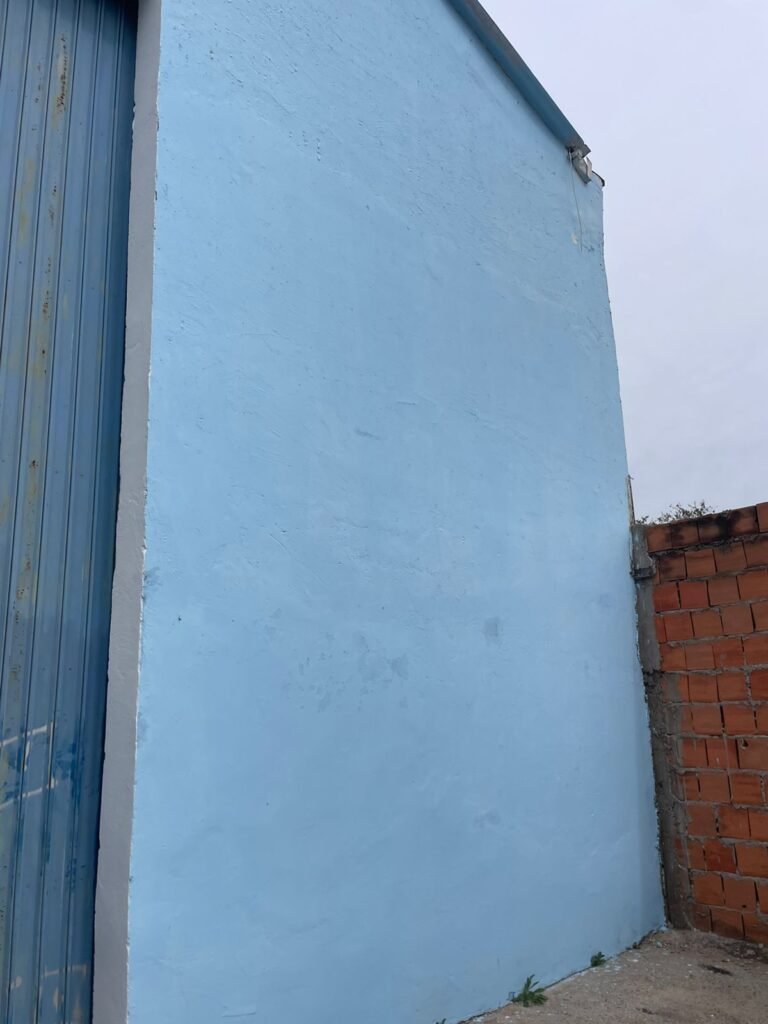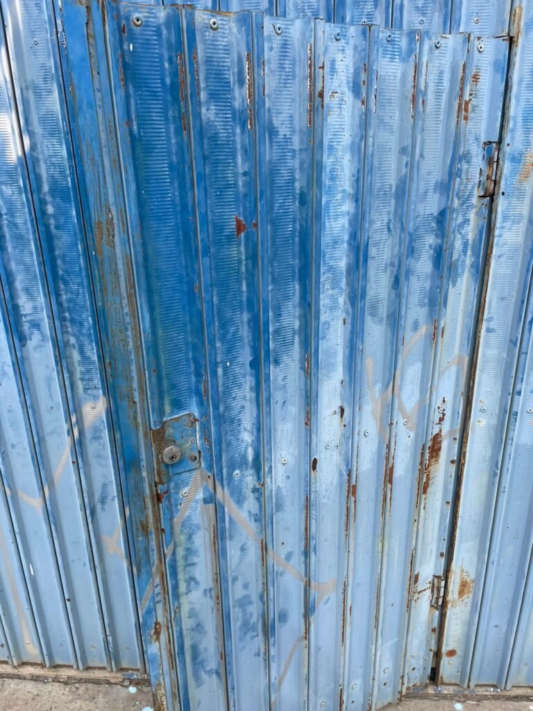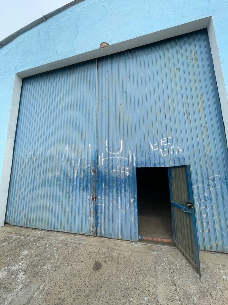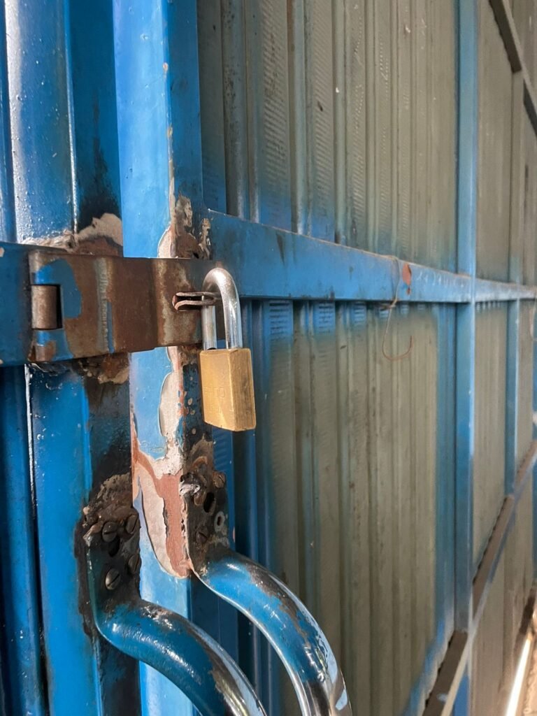 BARRACÃO-: 01 Portão deslizante de chapas de ferro em ordem, com pintura na cor azul com desgastes naturais e descasques, 02 puxadores em ordem, 01 fechadura alavanca em ordem, 02 fechaduras ferrolho em ordem, 01 trinco para cadeado em ordem e com 01 cadeado marca Pado em ordem, portão contém 01 porta social com 01 puxador em ordem e 01 fechadura start marca 3F com chave em ordem, piso em concreto desempenado com desgastes naturais, trincados e manchas pela extensão, paredes com pintura na cor azul com pequenas manchas pela extensão e restante em ordem, 06 vitrôs basculantes com esquadrias de ferro com desgastes naturais, 01 deles contendo 18 vidros canelados, restante contendo 14 vidros canelados, sendo que todos possuem 01 fechadura alavanca não testadas, ambos com vidros com desgastes naturais, manchas de tinta e trincados. 01 vitrô basculante isolado, 01 porta social de ferro isolada, 01 escada de madeira com guarda corpo com desgastes naturais, 01 ponto de água com 01 torneira de jardim em ordem, estruturas de ferro para iluminação, contendo cinco lâmpadas Led e 01 lâmpada incandescente, 06 tomadas sendo que 01 delas é 220 watts, 05 interruptores em ordem, 01 caixa de distribuição de disjuntor, contendo tampa em ordem e 01 disjuntor Steck SD-63C70 400v em ordem.