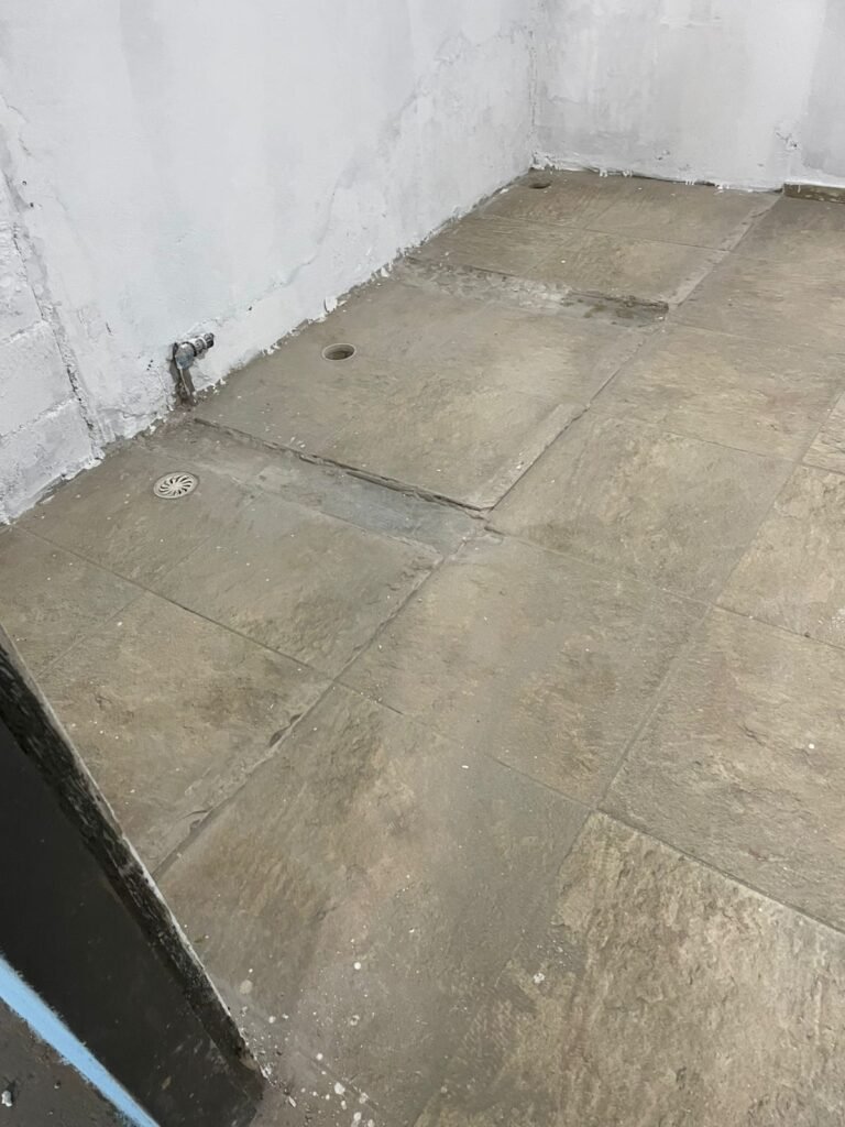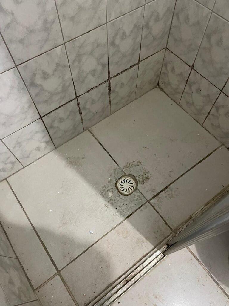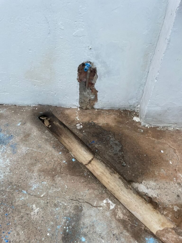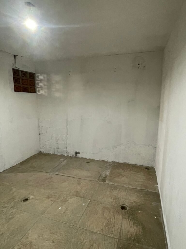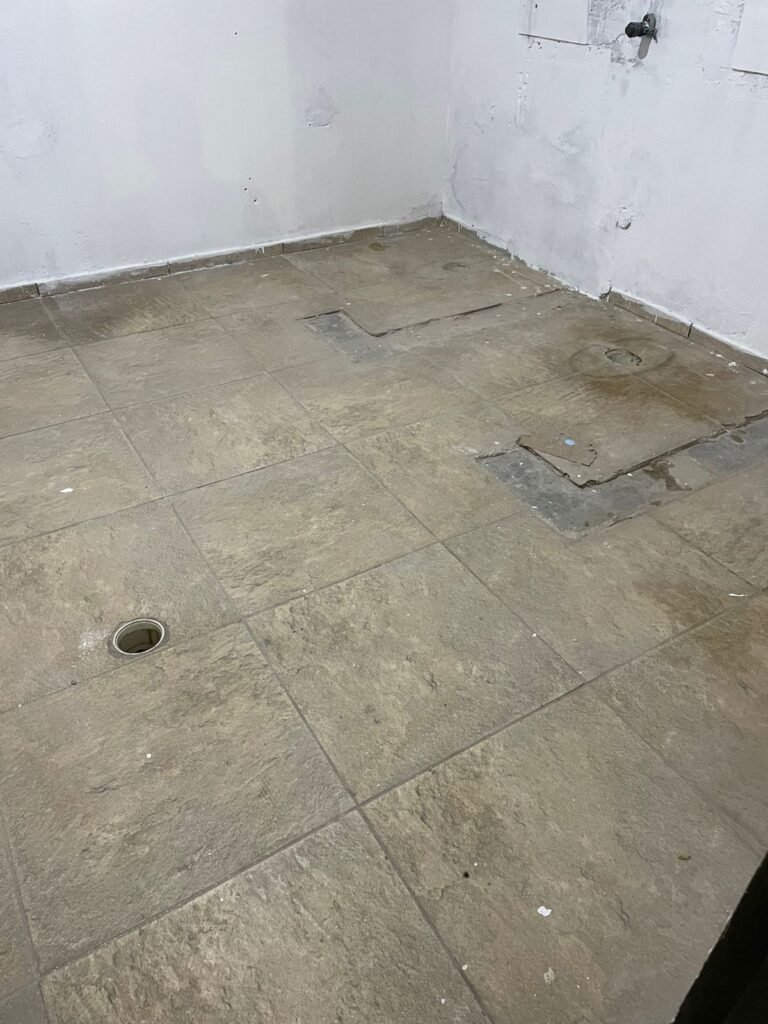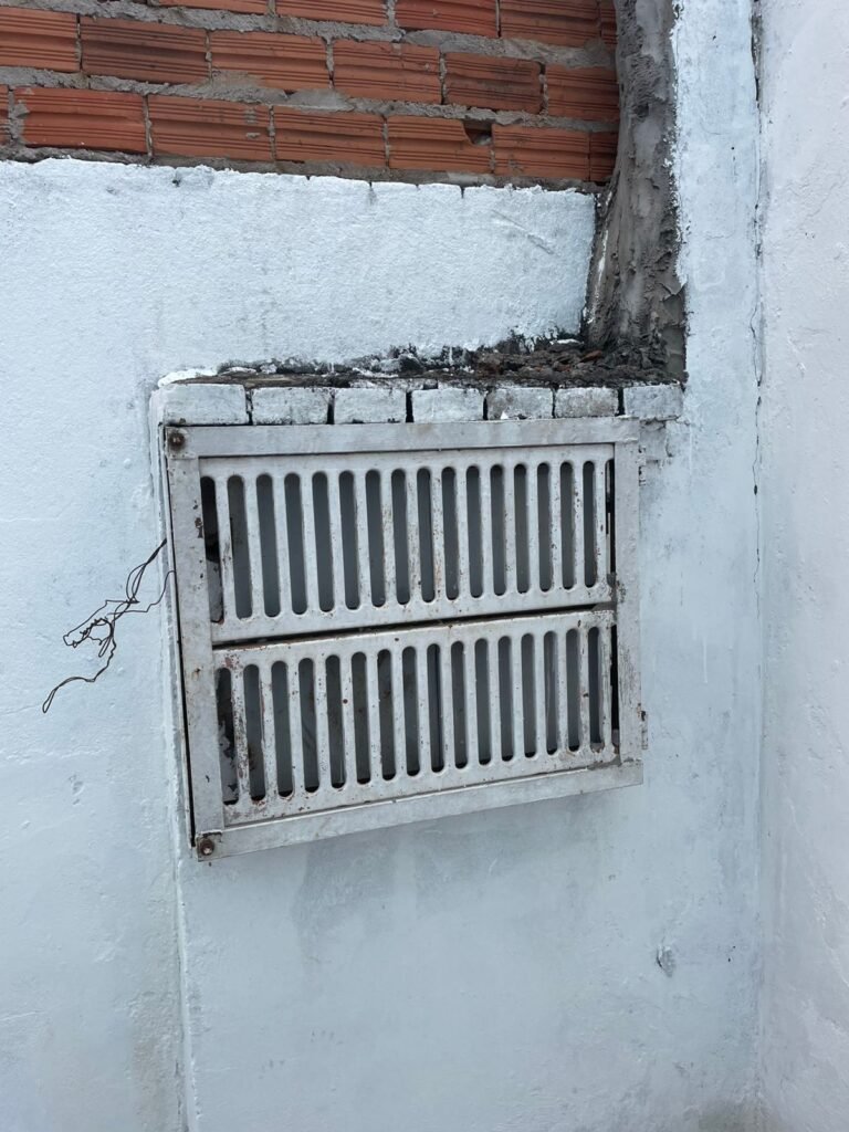 SALA 01-: Piso revestido de piso frio com partes faltando, desgastes naturais e manchas pela extensão, 06 pontos de ralo sem tampa, 01 ralo com tampa de plástico cor branco, 01 janela e 01 porta isoladas, 01 interruptor e 01 tomada, 02 janelas de tijolos à vista em ordem, paredes e teto com pintura na cor branco neve em ordem, 01 Led em ordem e sem lâmpada.